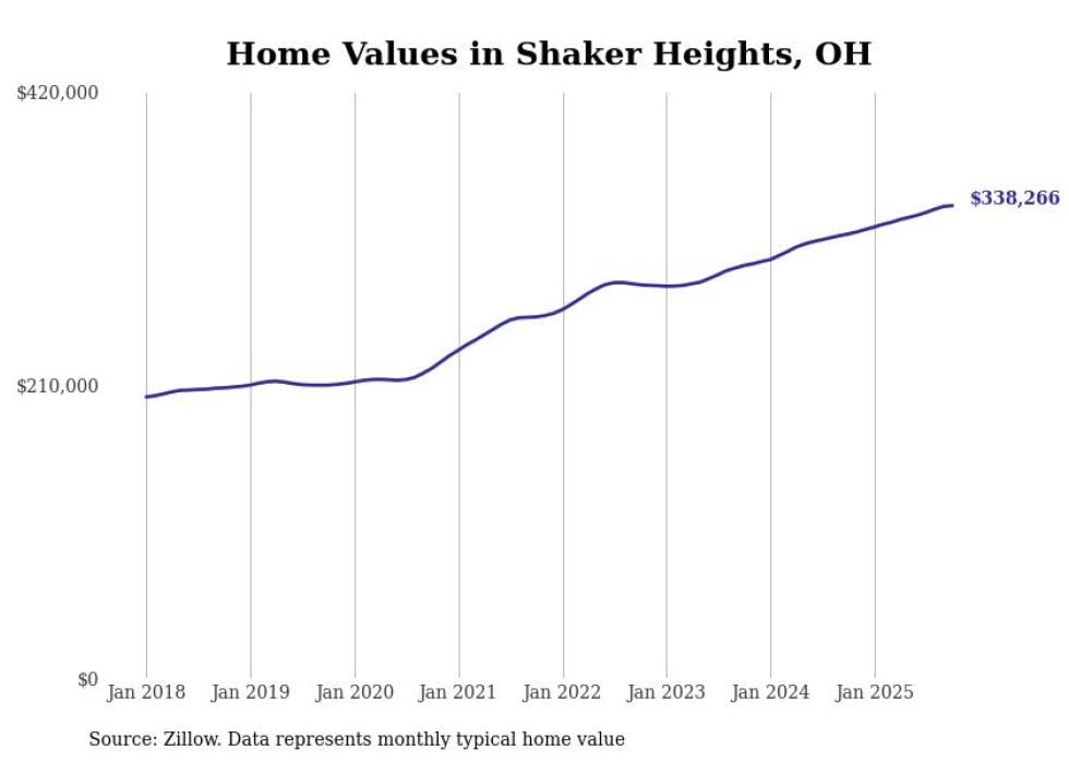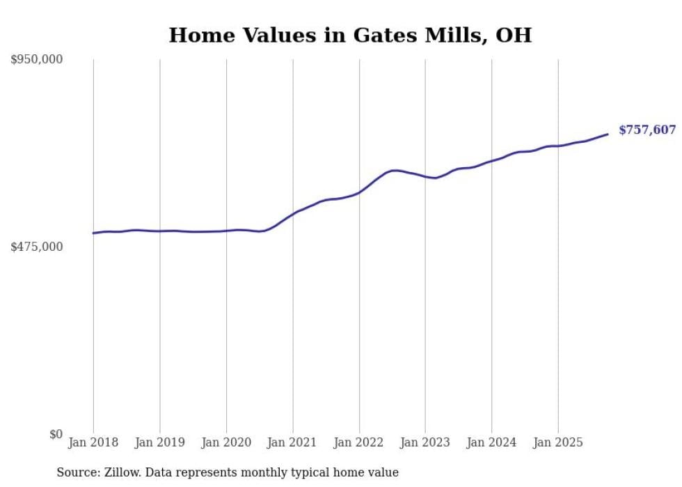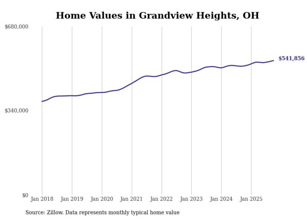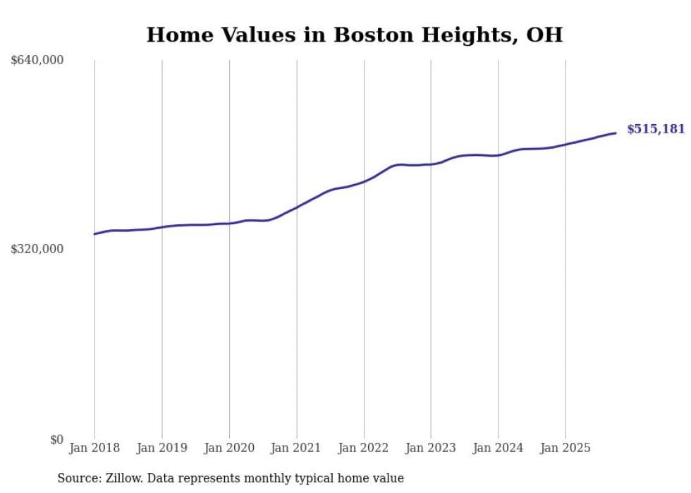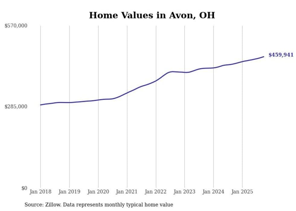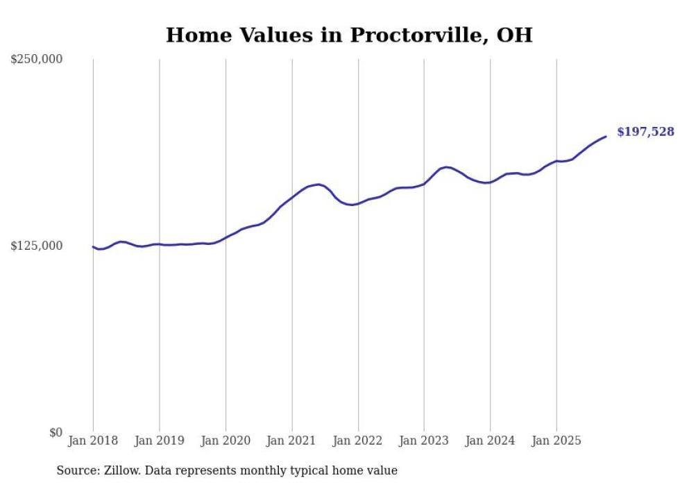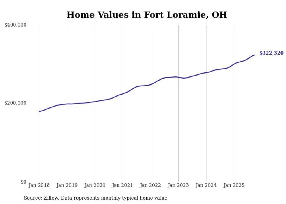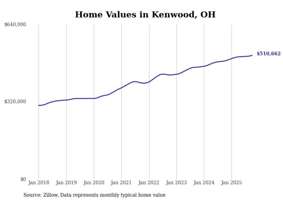 Stacker compiled a list of cities with the fastest-growing home prices in Ohio using data from Zillow. Cities are ranked by the dollar change in the Zillow Home Values Index for all homes from the 12 months ending October 2025. The charts in this story were created automatically using Matplotlib. Data was available for 50 cities and towns in Ohio.