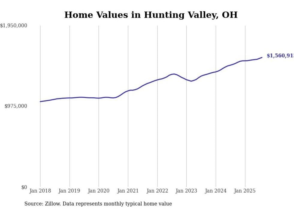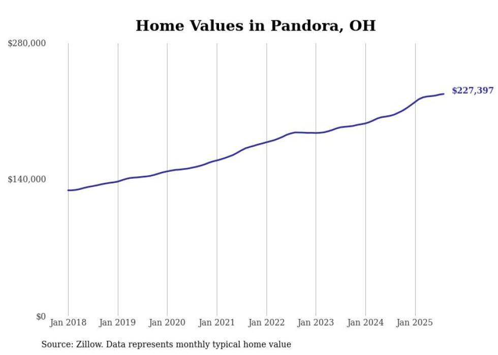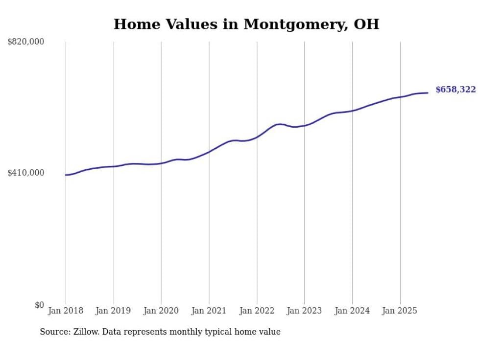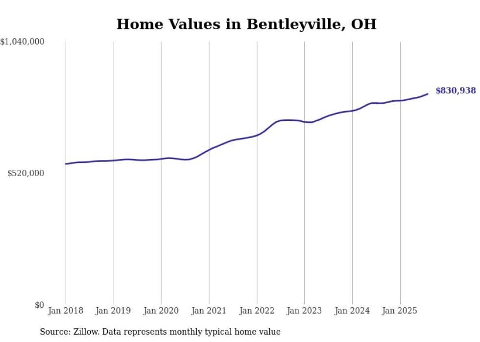 Stacker compiled a list of cities with the fastest-growing home prices in Ohio using data from Zillow. Cities are ranked by the dollar change in the Zillow Home Values Index for all homes from the 12 months ending August 2025. The charts in this story were created automatically using Matplotlib. Data was available for 50 cities and towns in Ohio.