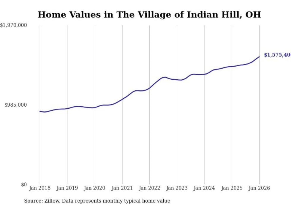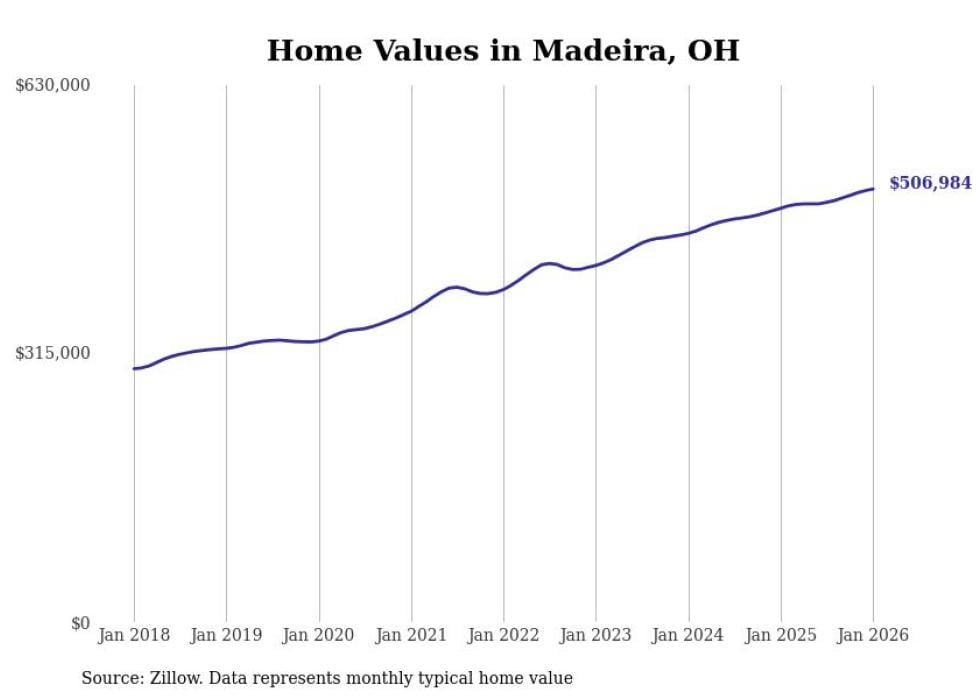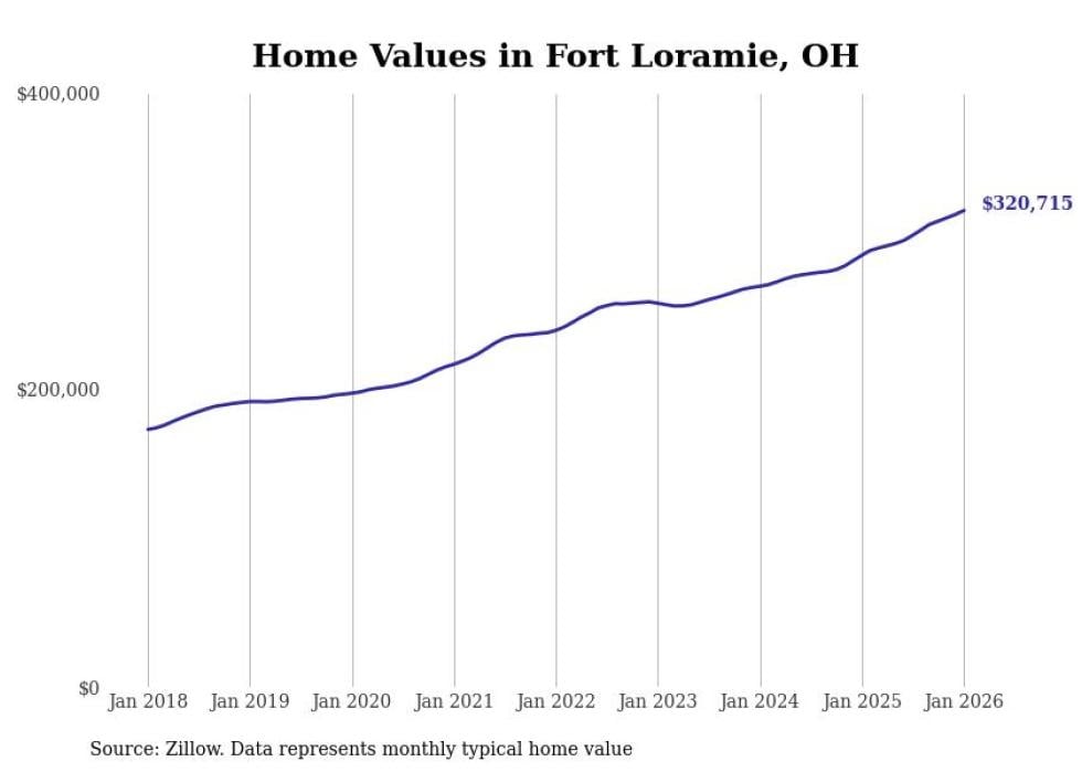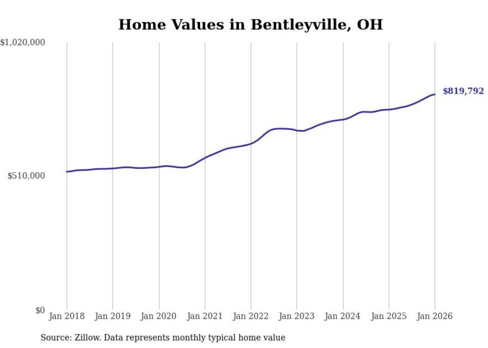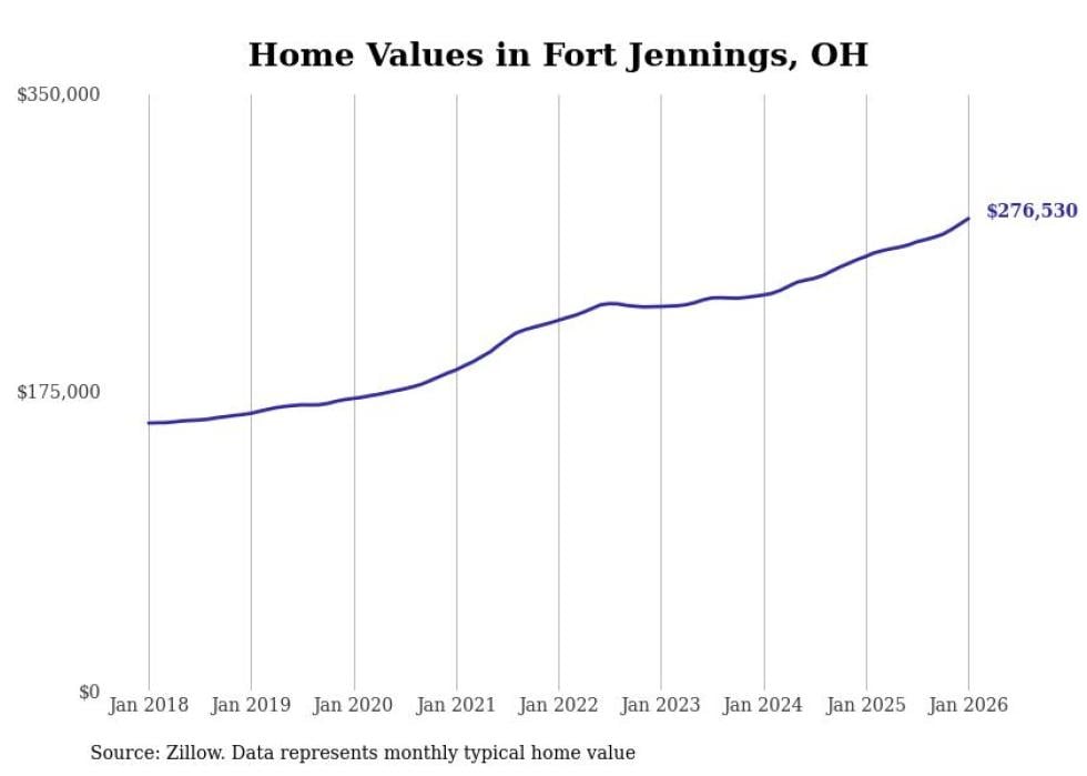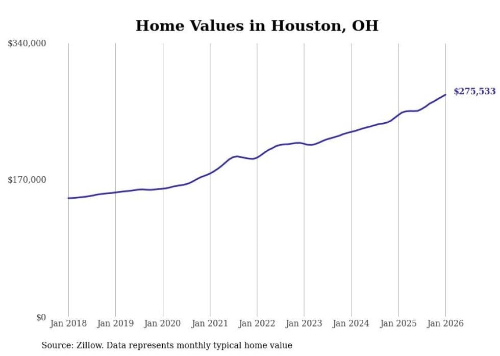Stacker compiled a list of cities with the fastest-growing home prices in Ohio using data from Zillow. Cities are ranked by the dollar change in the Zillow Home Values Index for all homes from the 12 months ending January 2026. The charts in this story were created automatically using Matplotlib. Data was available for 50 cities and towns in Ohio.