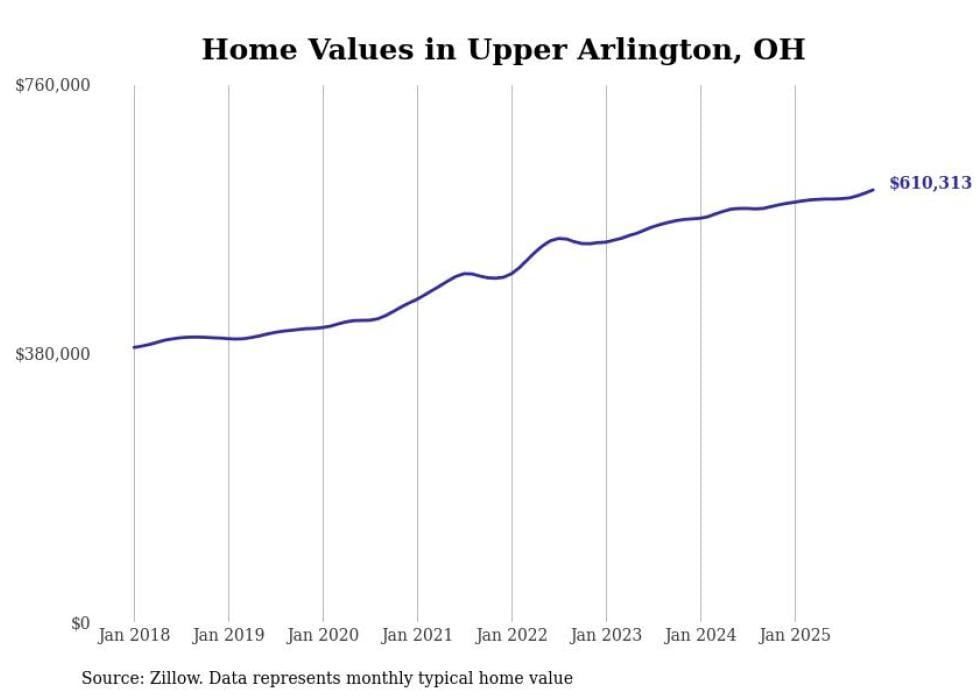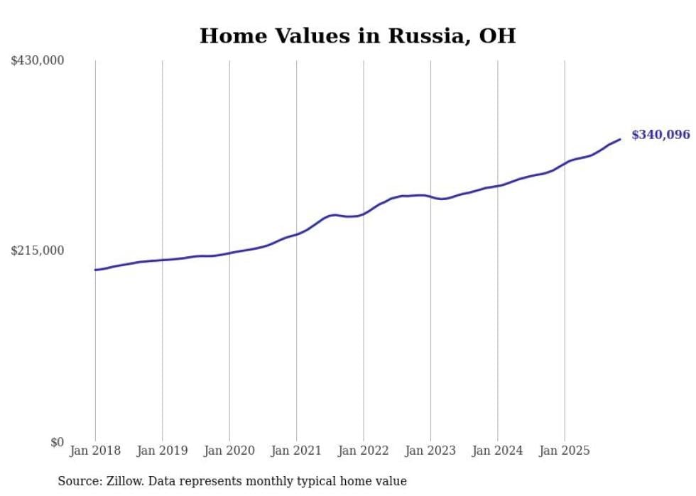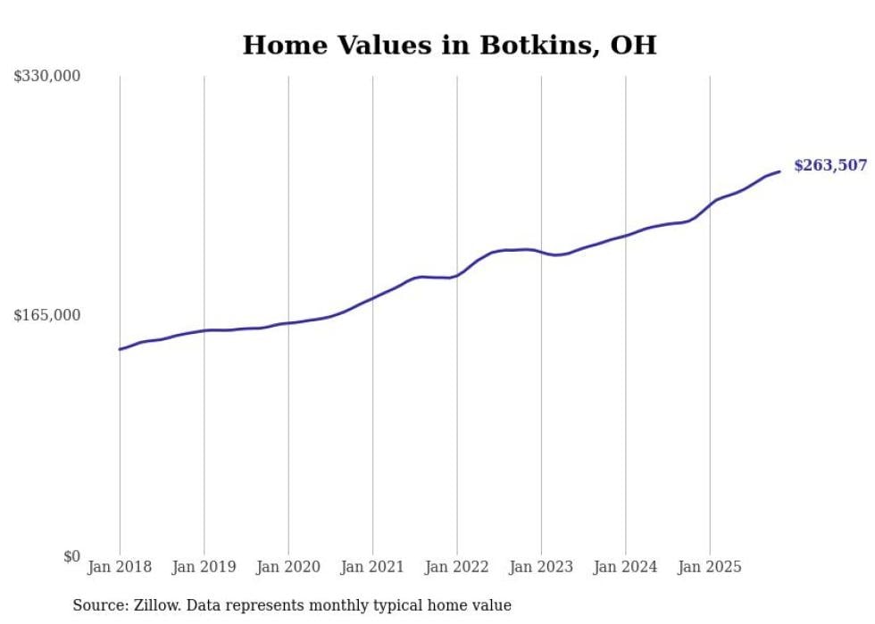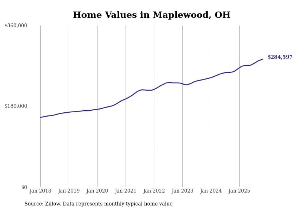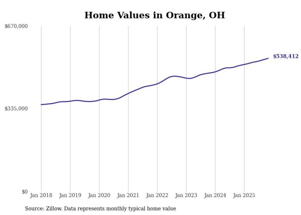 Stacker compiled a list of cities with the fastest-growing home prices in Ohio using data from Zillow. Cities are ranked by the dollar change in the Zillow Home Values Index for all homes from the 12 months ending November 2025. The charts in this story were created automatically using Matplotlib. Data was available for 50 cities and towns in Ohio.
