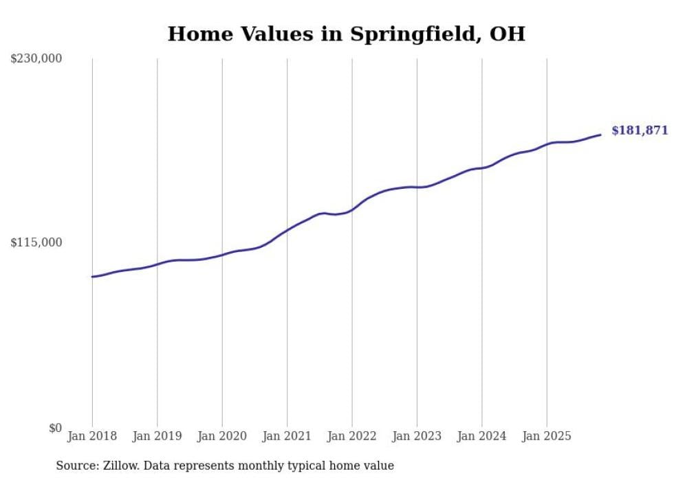 Stacker compiled a list of cities with the most expensive homes in the Springfield, OH metro area using data from Zillow. Charts show the monthly typical home value since January 2018.