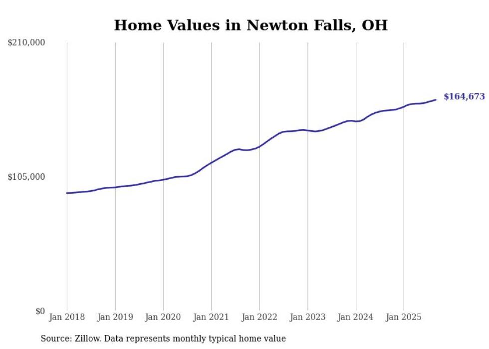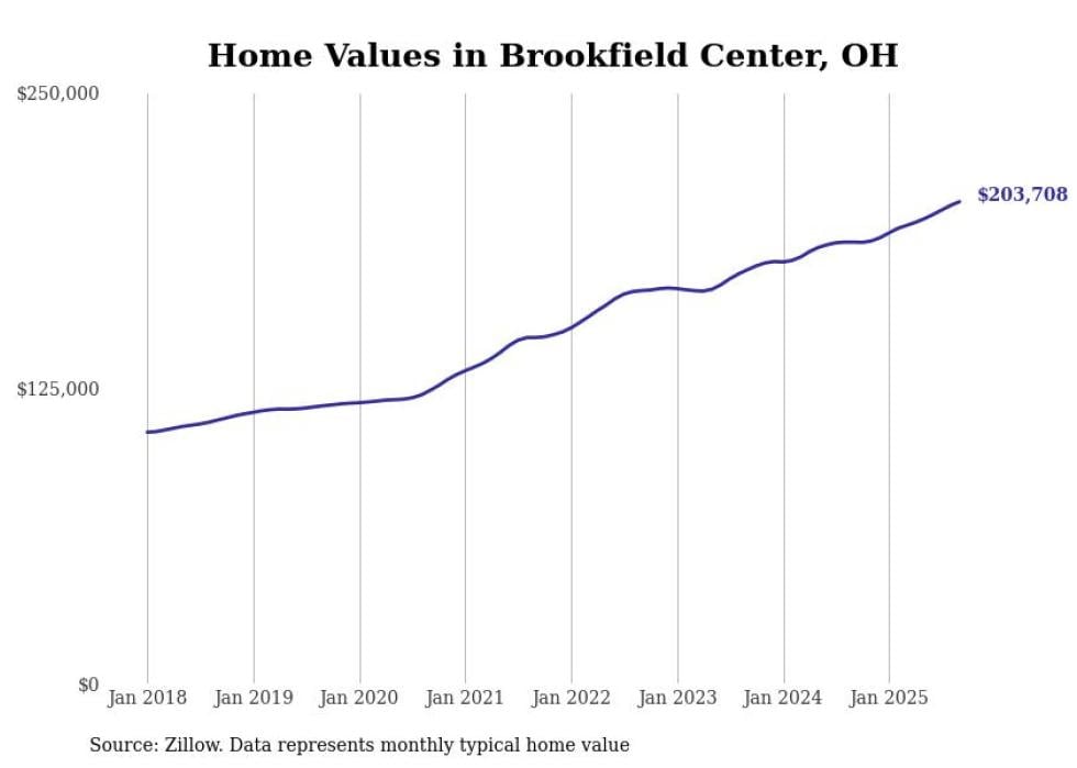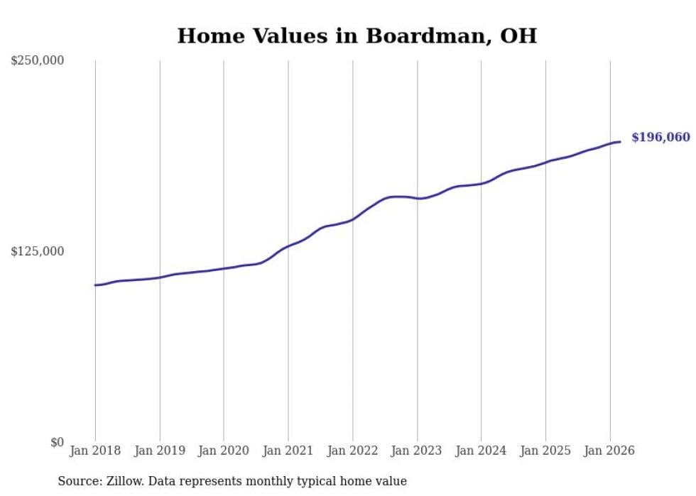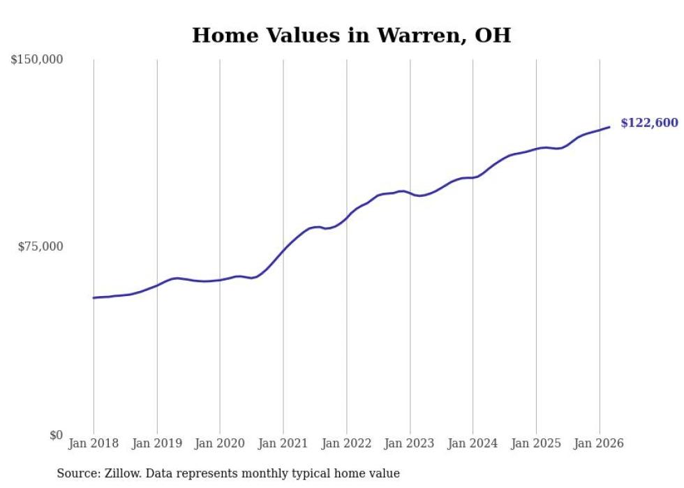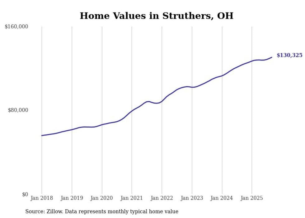 Stacker compiled a list of cities with the most expensive homes in the Youngstown-Warren-Boardman, OH-PA metro area using data from Zillow. Charts show the monthly typical home value since January 2018.