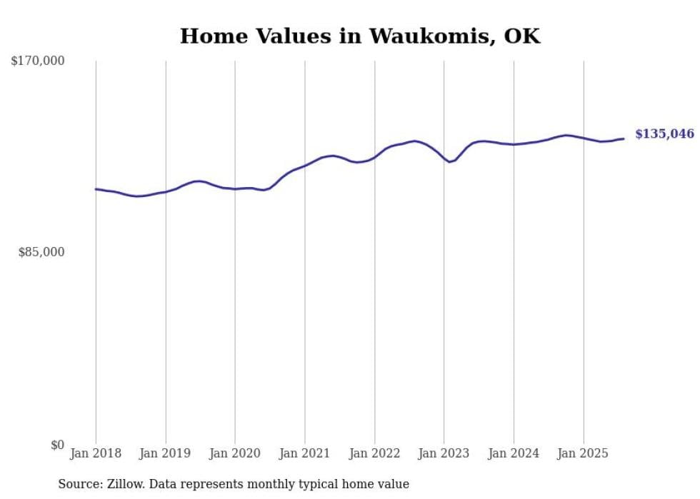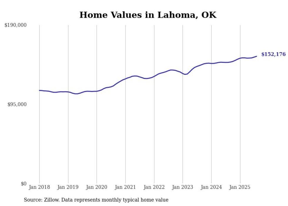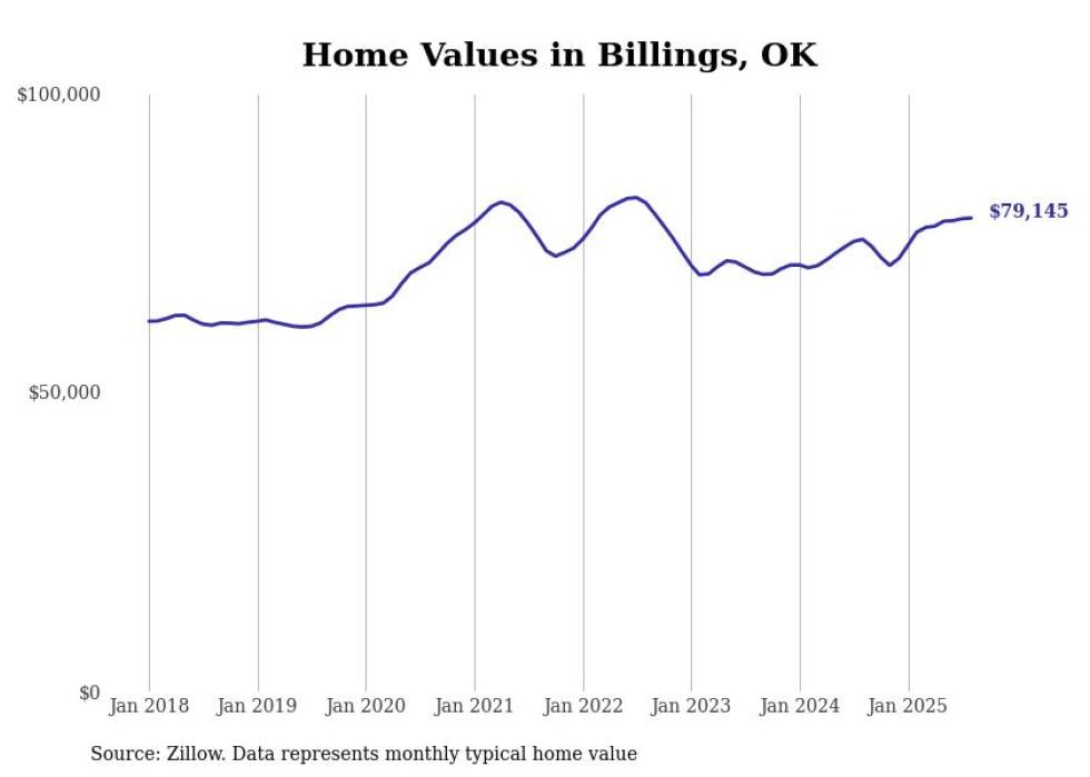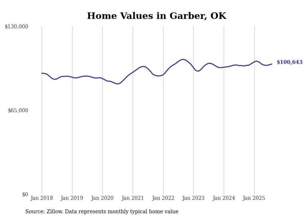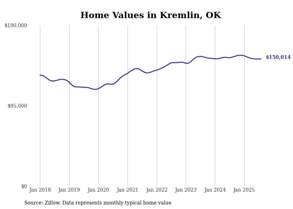 Stacker compiled a list of cities with the most expensive homes in the Enid metro area using data from Zillow. Charts show the monthly typical home value since January 2018. All 11 cities and towns with data available were included in the list.