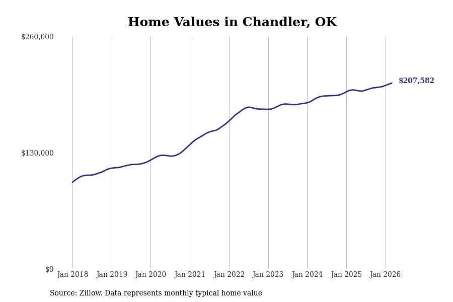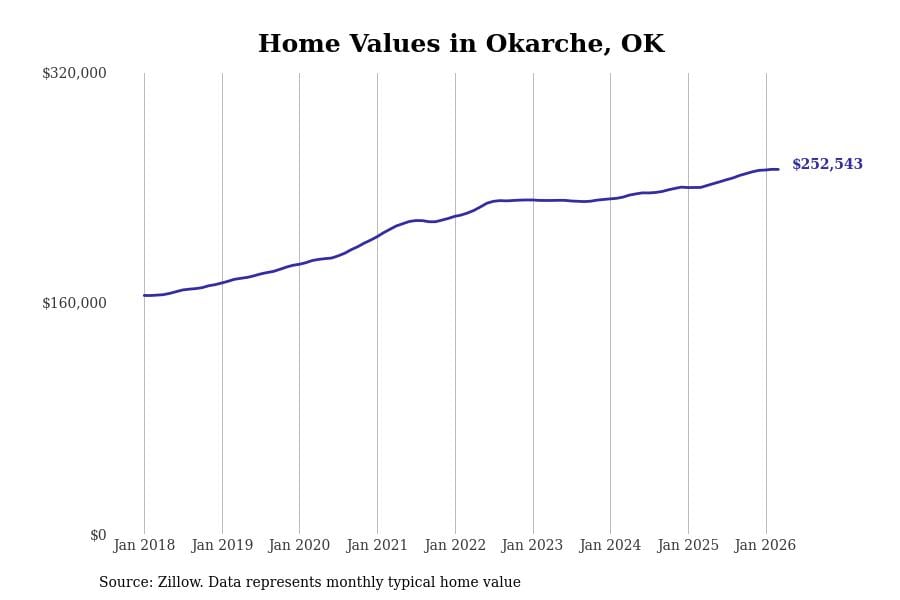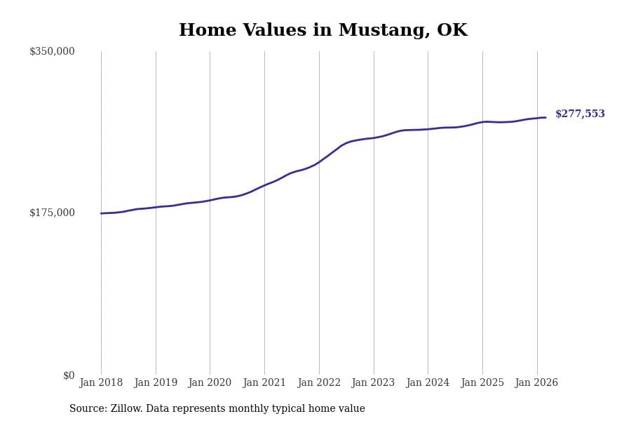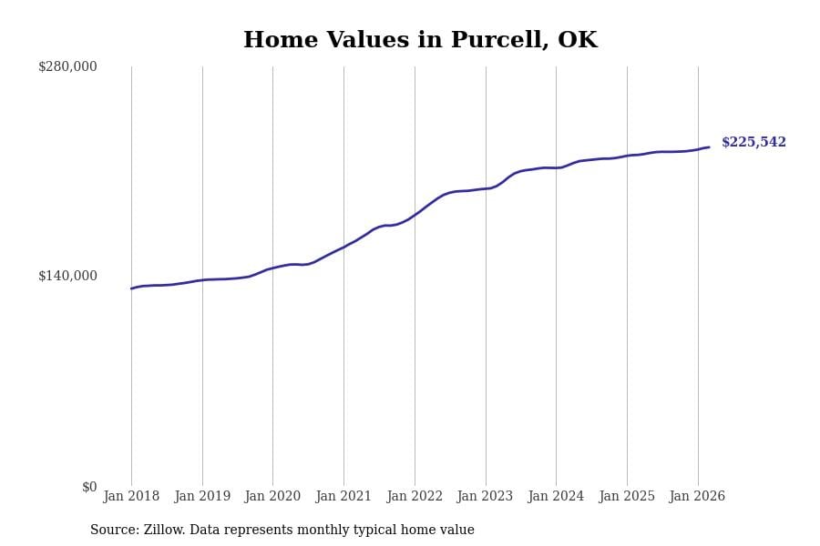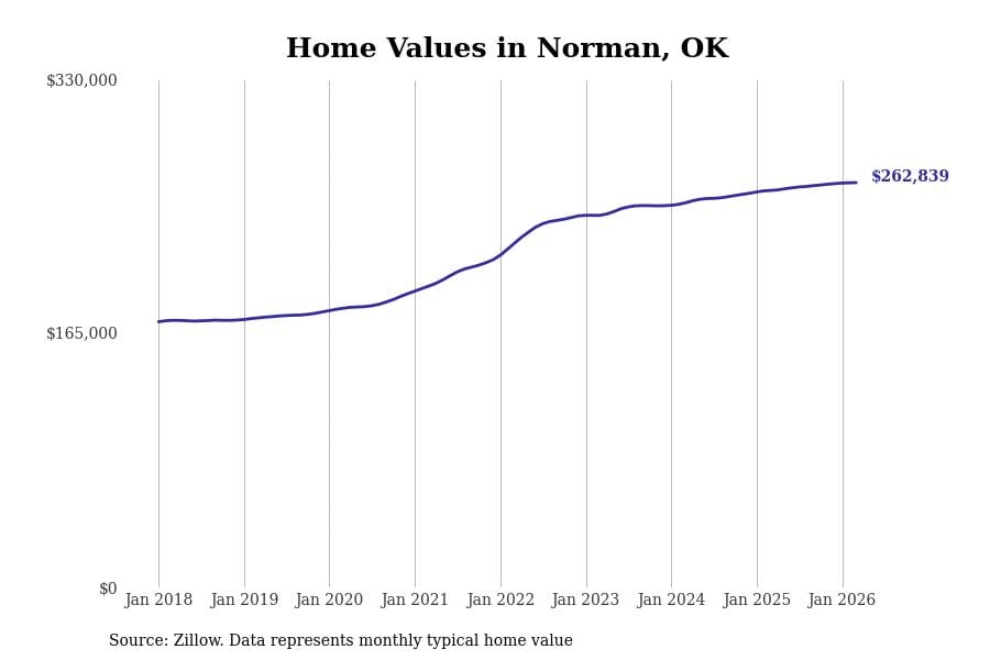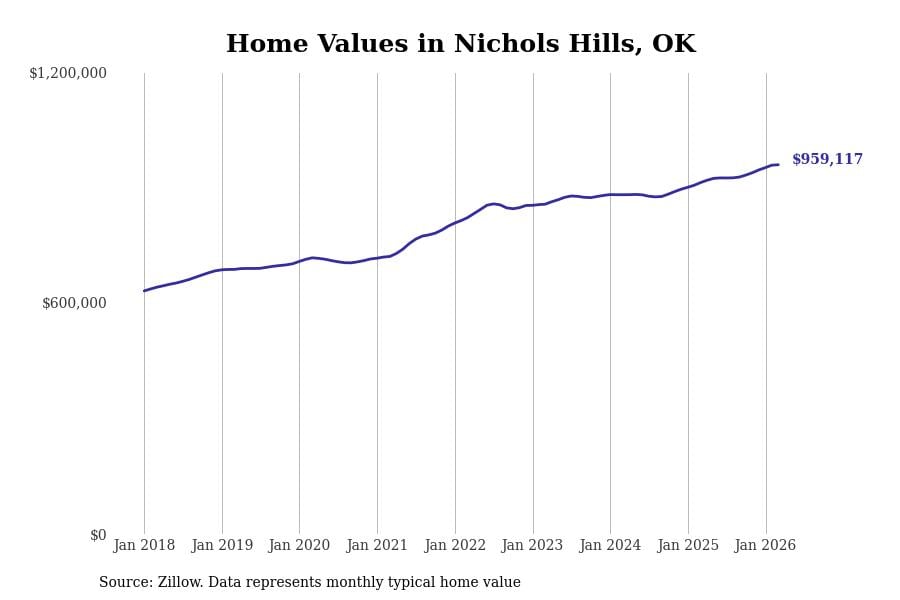 Stacker compiled a list of cities with the most expensive homes in the Oklahoma City, OK metro area using data from Zillow. Charts show the monthly typical home value since January 2018.