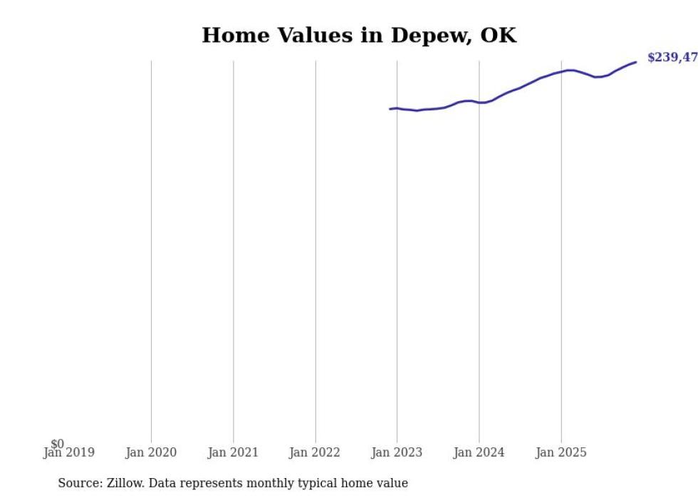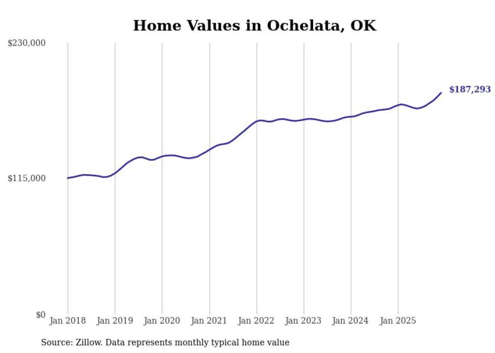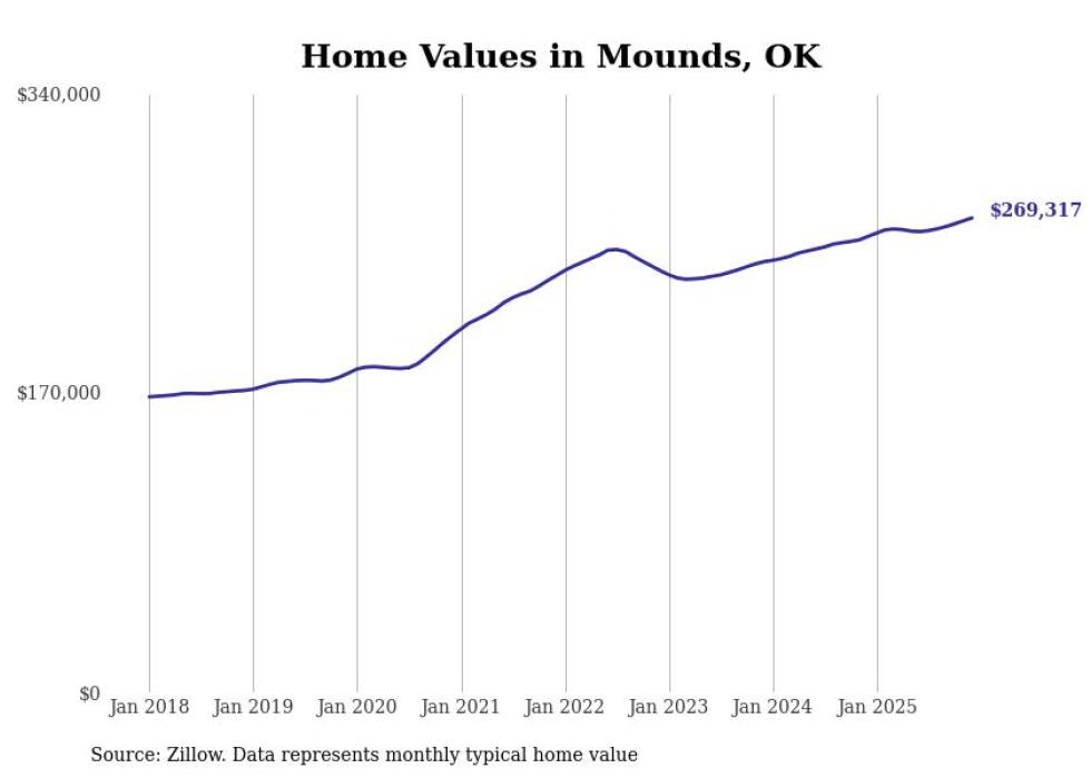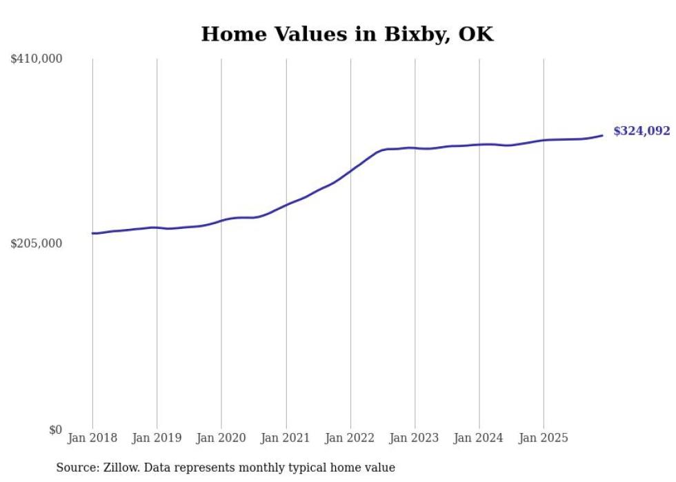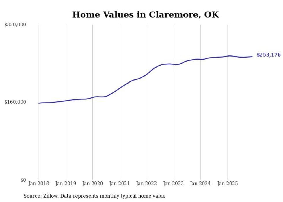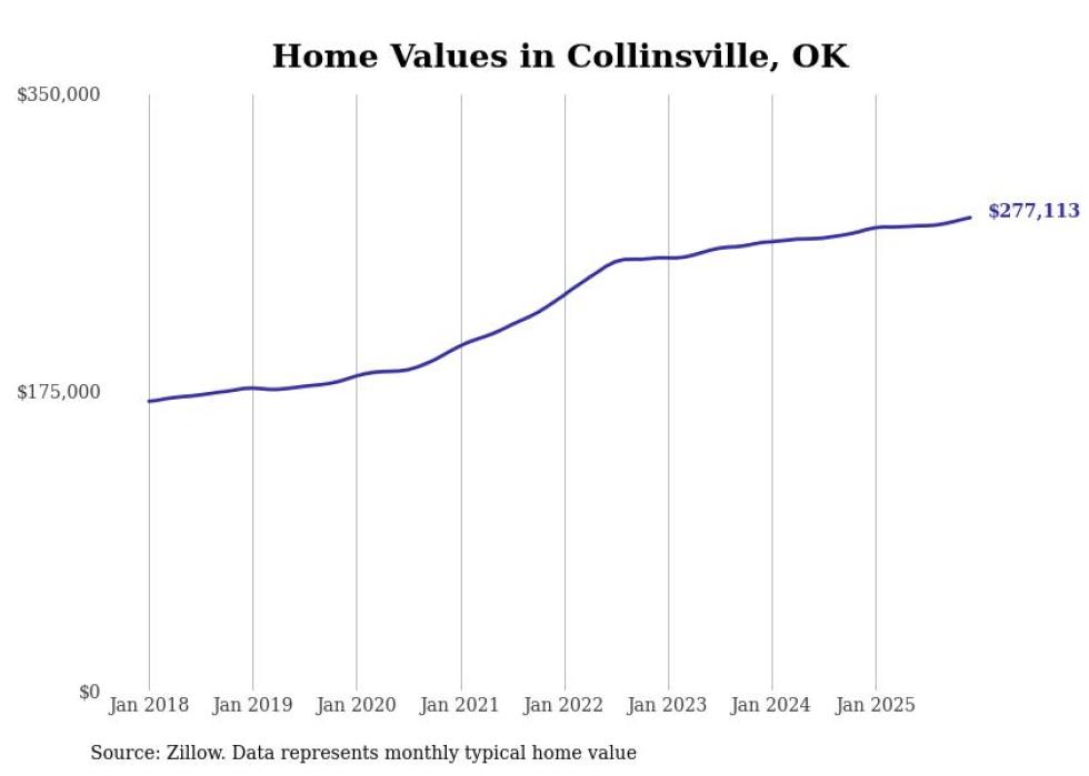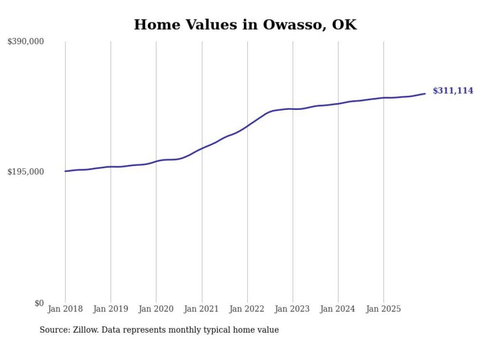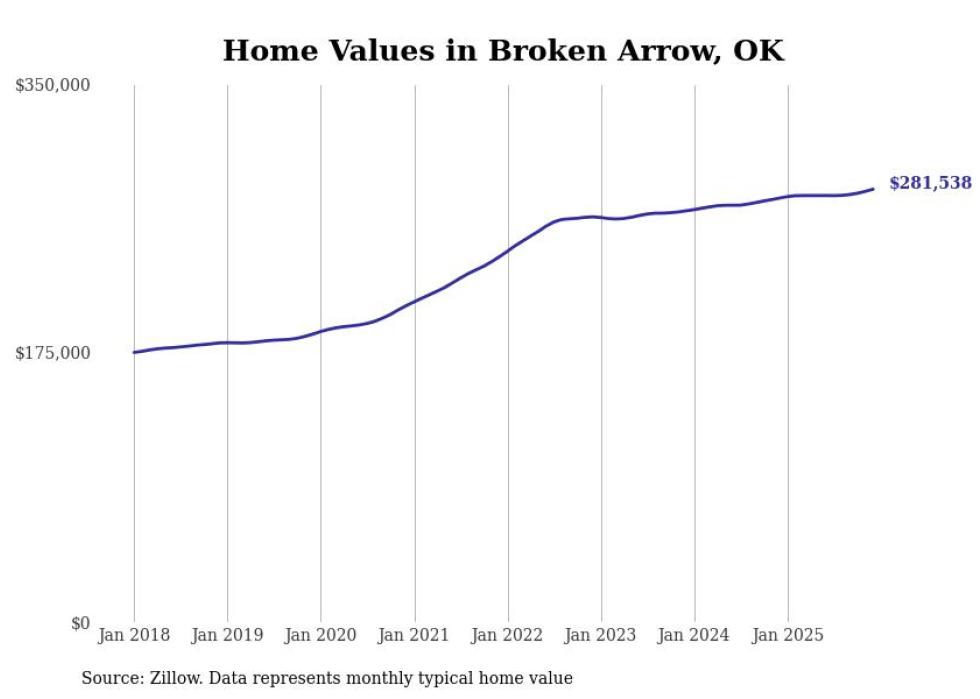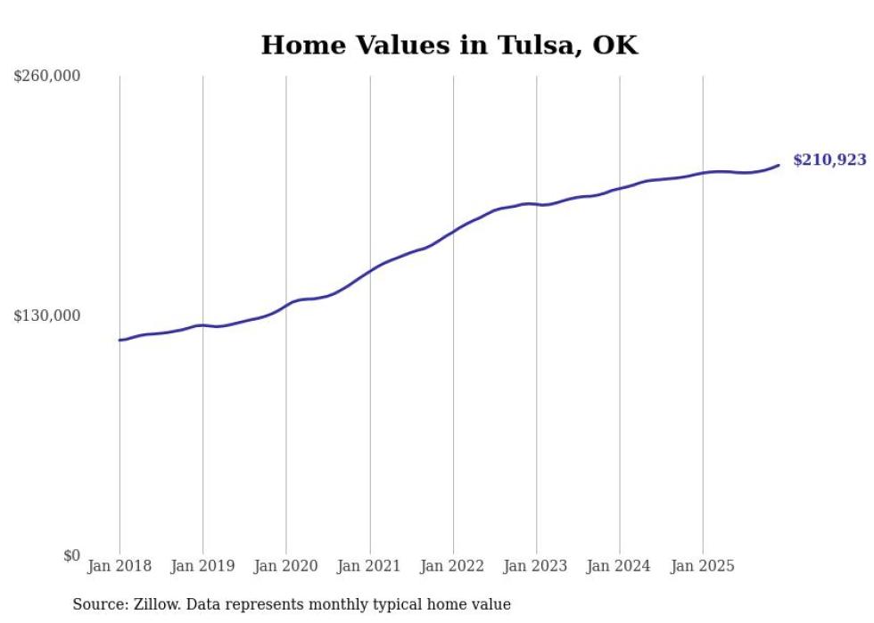 Stacker compiled a list of cities with the most expensive homes in the Tulsa metro area using data from Zillow. Charts show the monthly typical home value since January 2018. Data was available for 49 cities and towns.