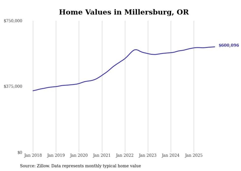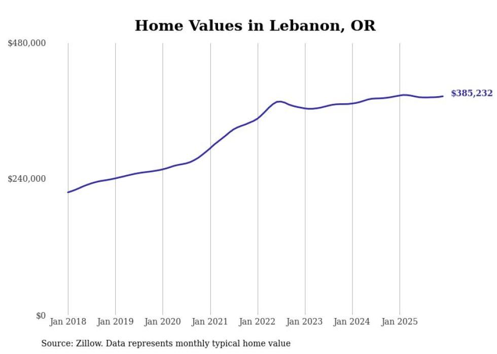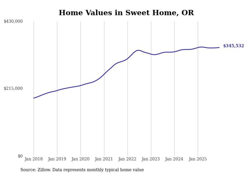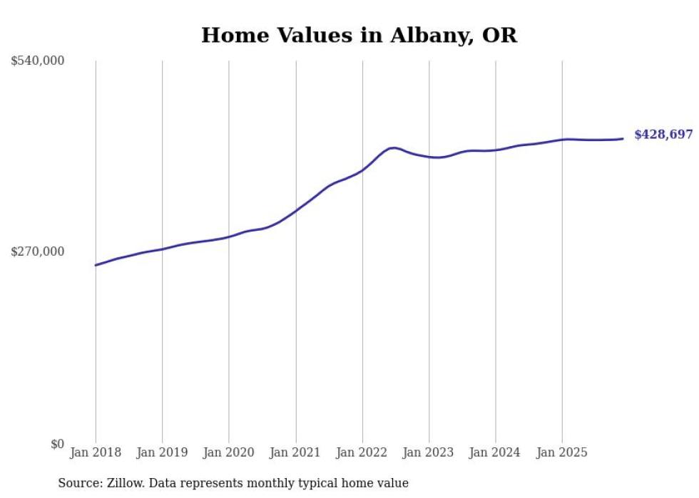 Stacker compiled a list of cities with the most expensive homes in the Albany, Oregon metro area using data from Zillow. Charts show the monthly typical home value since January 2018. All 14 cities and towns with data available were included in the list.