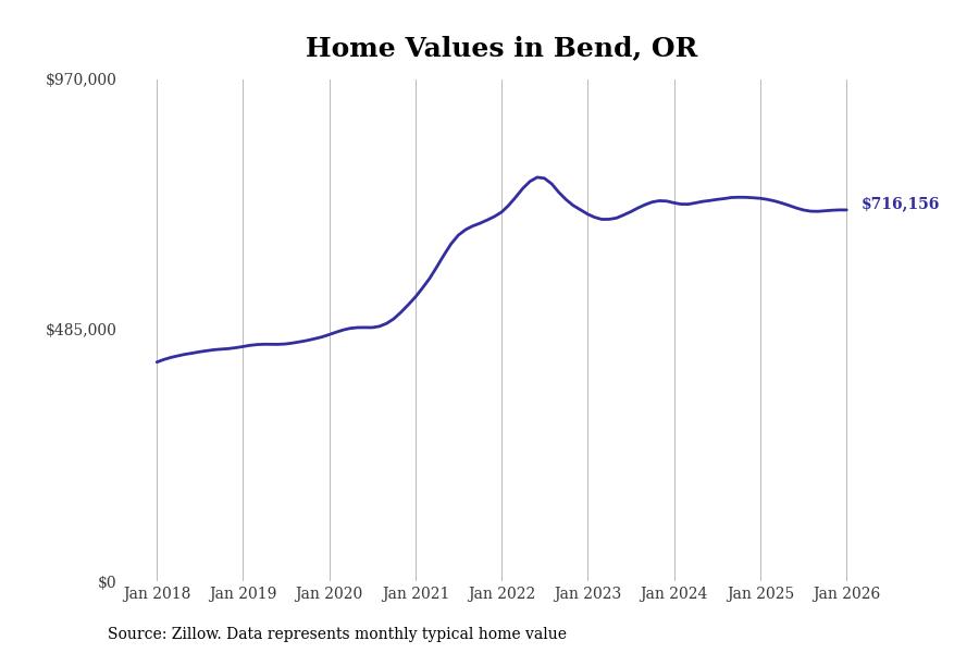 Stacker compiled a list of cities with the most expensive homes in the Bend metro area using data from Zillow. Charts show the monthly typical home value since January 2018. All 4 cities and towns with data available were included in the list.