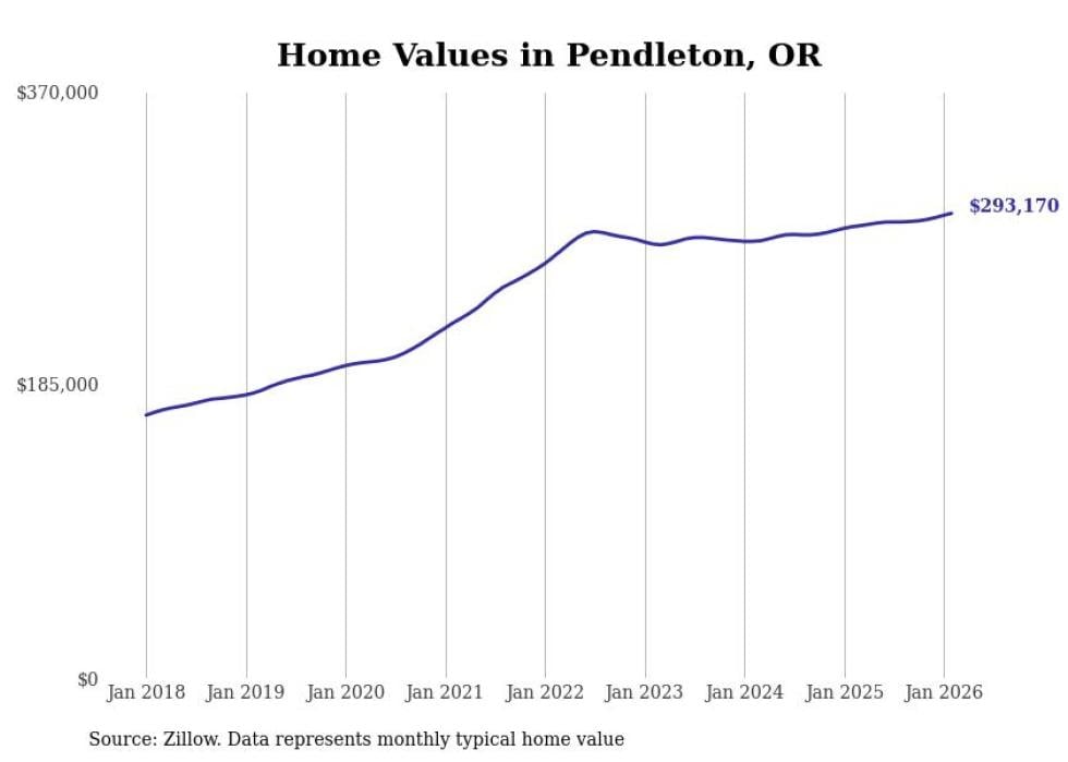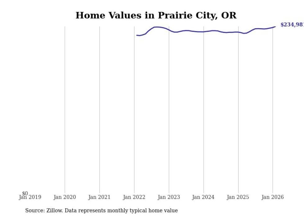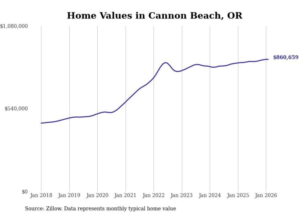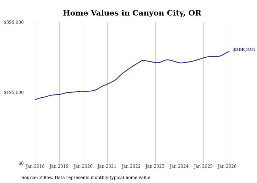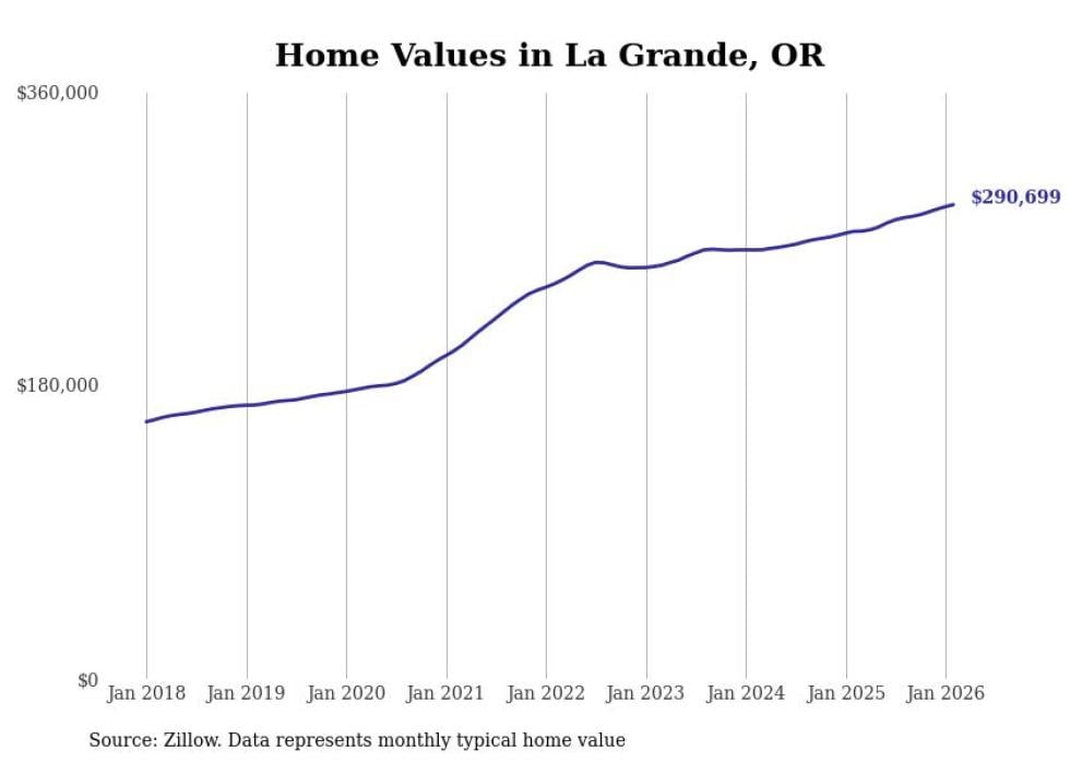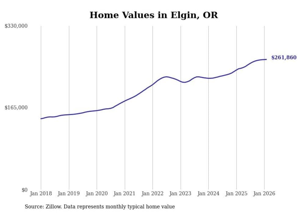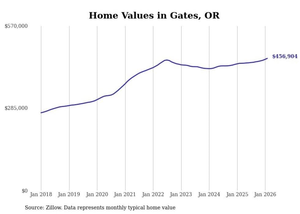 Stacker compiled a list of cities with the fastest-growing home prices in Oregon using data from Zillow. Cities are ranked by the dollar change in the Zillow Home Values Index for all homes from the 12 months ending February 2026. The charts in this story were created automatically using Matplotlib. Data was available for 50 cities and towns in Oregon.