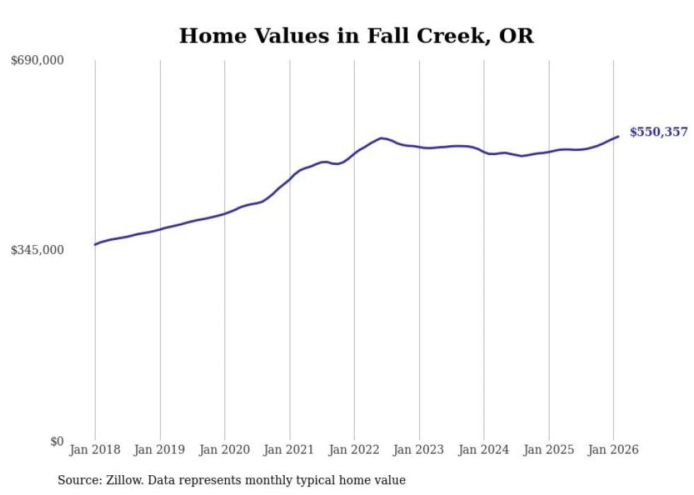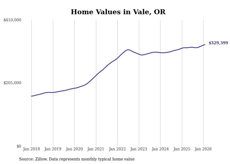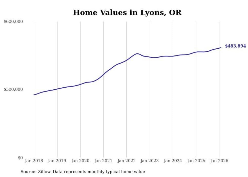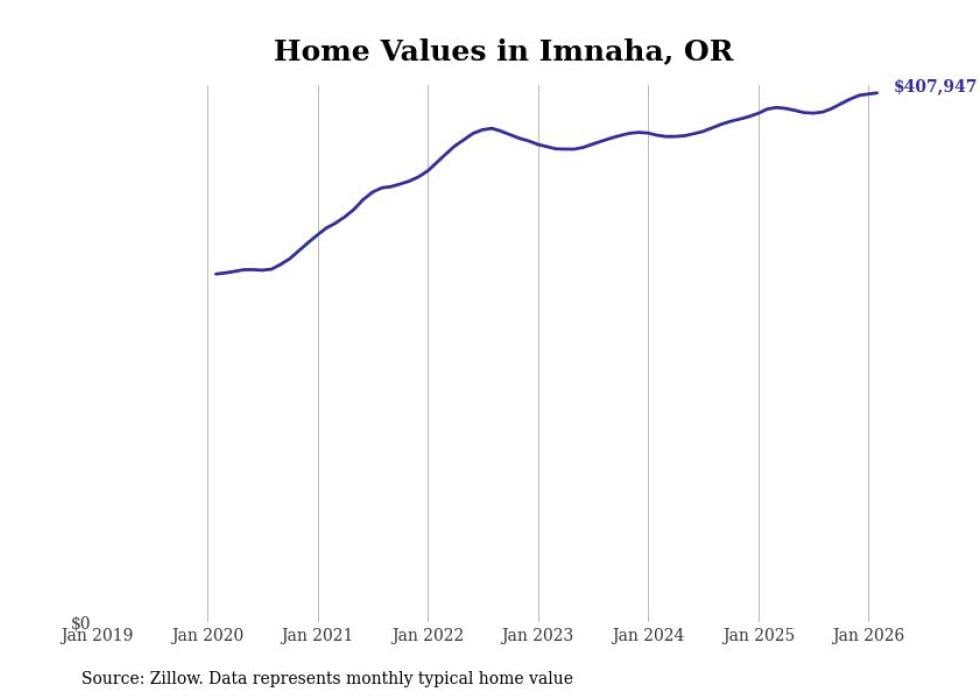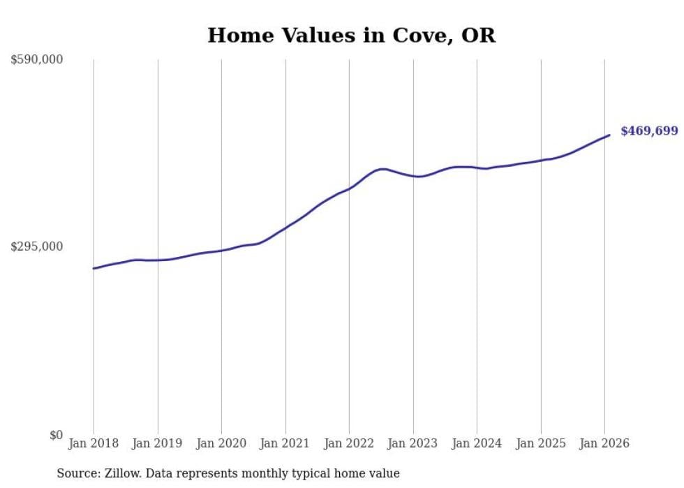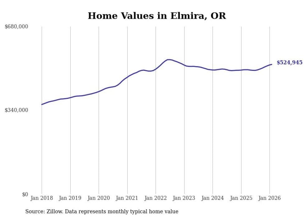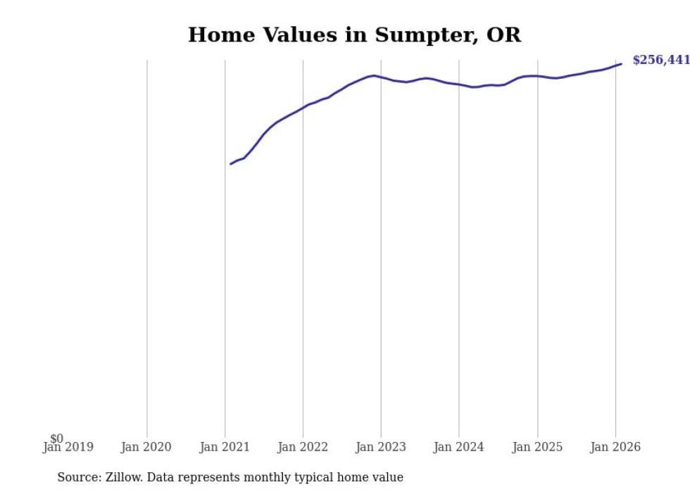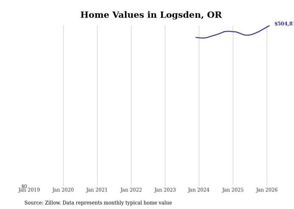 Stacker compiled a list of cities with the fastest-growing home prices in Oregon using data from Zillow. Cities are ranked by the dollar change in the Zillow Home Values Index for all homes from the 12 months ending February 2026. The charts in this story were created automatically using Matplotlib. Data was available for 50 cities and towns in Oregon.