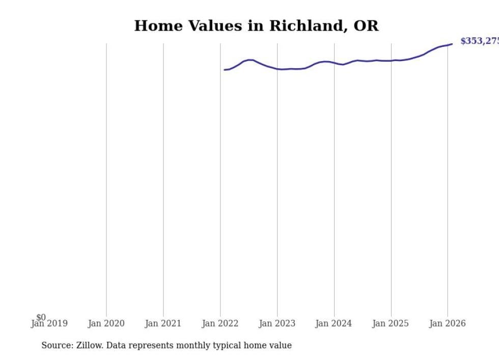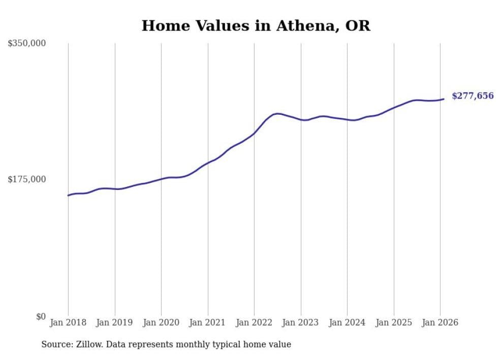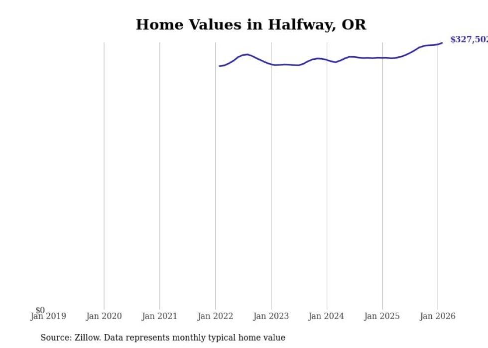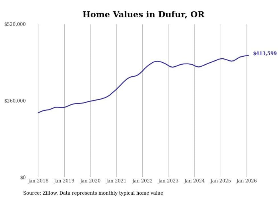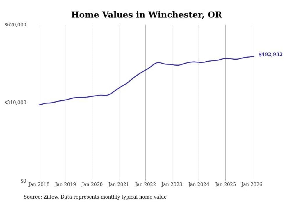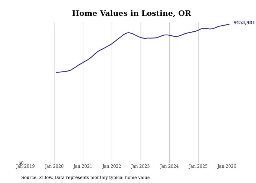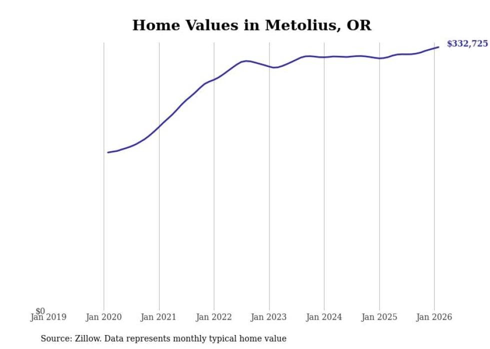 Stacker compiled a list of cities with the fastest-growing home prices in Oregon using data from Zillow. Cities are ranked by the dollar change in the Zillow Home Values Index for all homes from the 12 months ending February 2026. The charts in this story were created automatically using Matplotlib. Data was available for 50 cities and towns in Oregon.