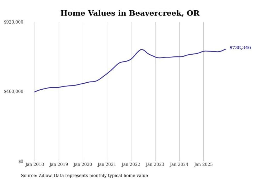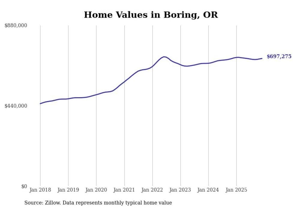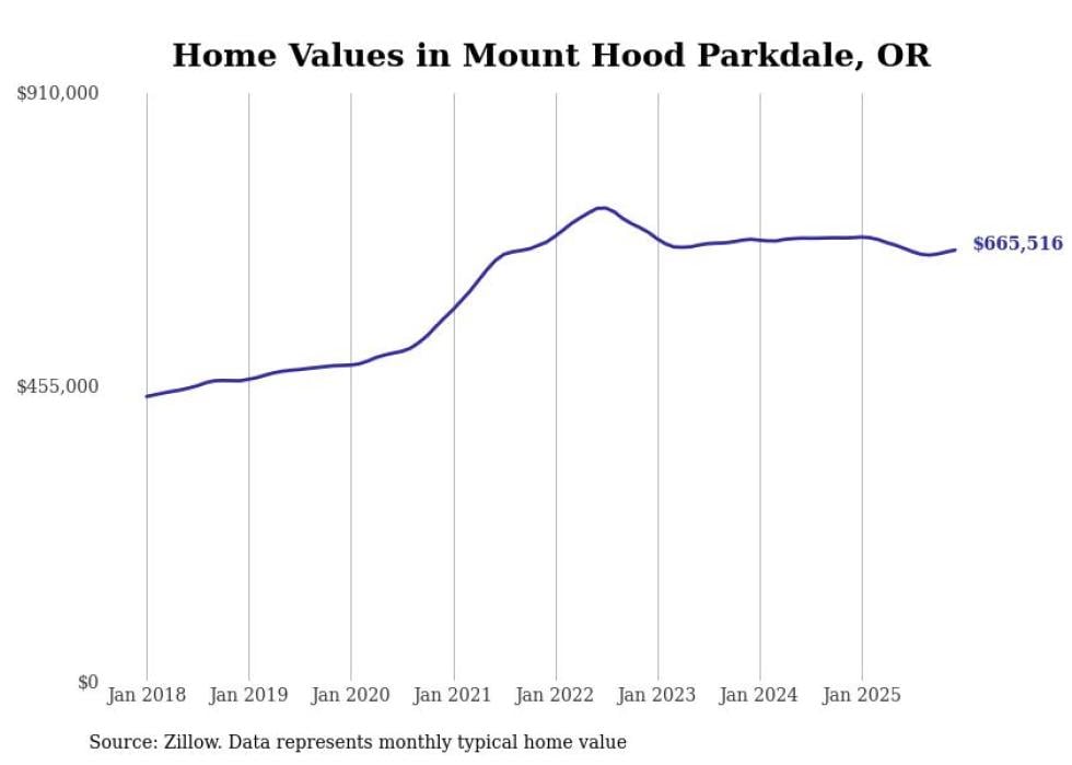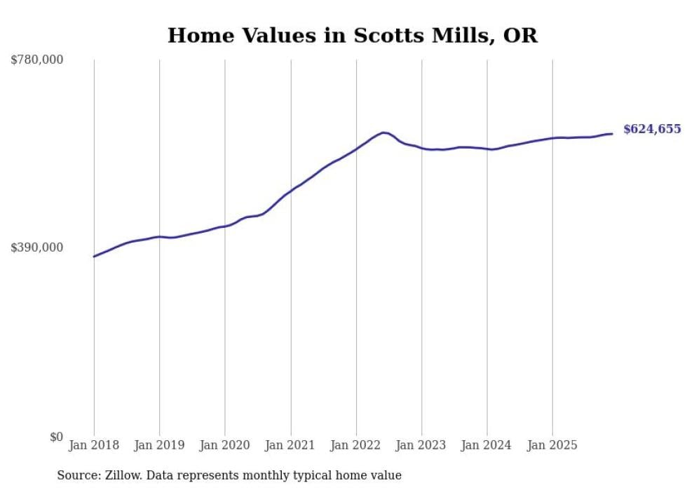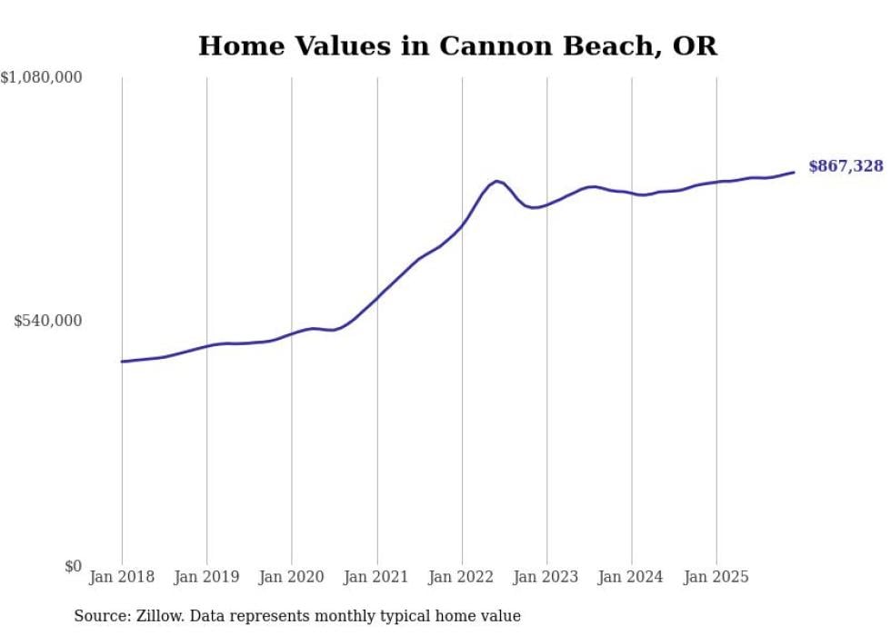 Stacker compiled a list of cities with the most expensive homes in Oregon using data from Zillow. Cities are ranked by the Zillow Home Values Index for all homes as of December 2025. The charts in this story were created automatically using Matplotlib.