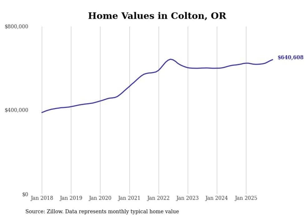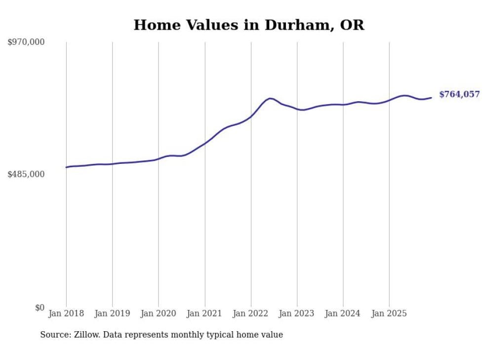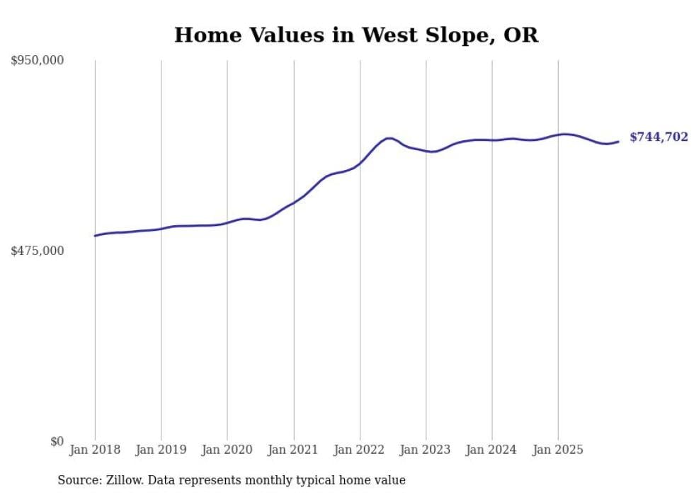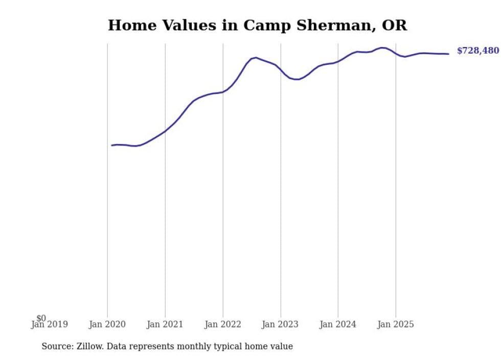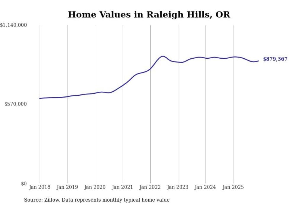 Stacker compiled a list of cities with the most expensive homes in Oregon using data from Zillow. Cities are ranked by the Zillow Home Values Index for all homes as of December 2025. The charts in this story were created automatically using Matplotlib.