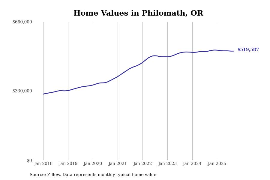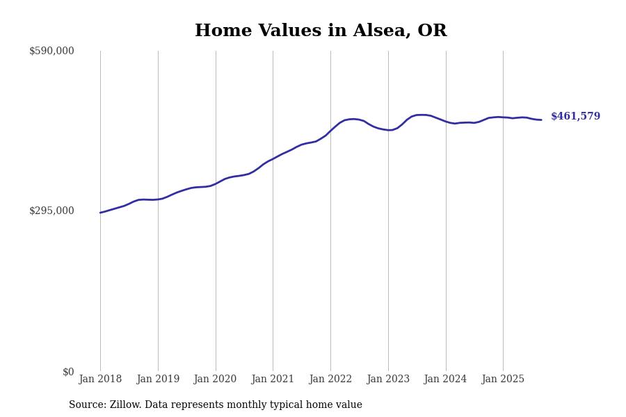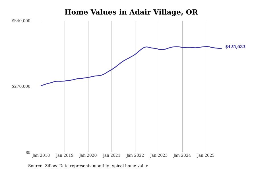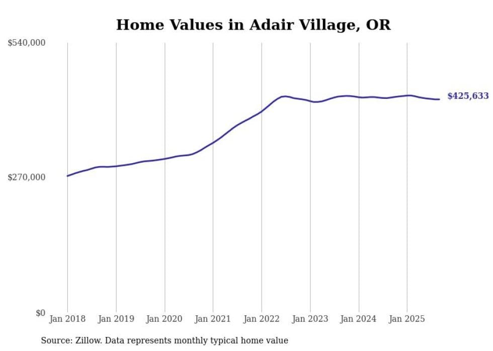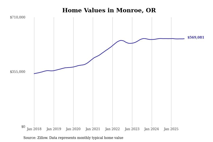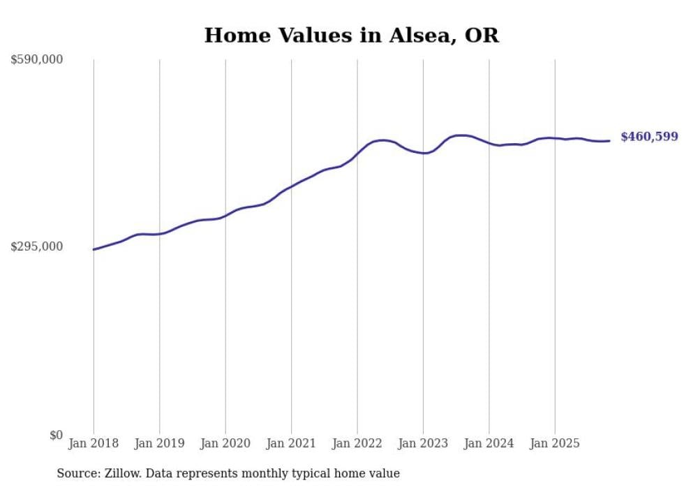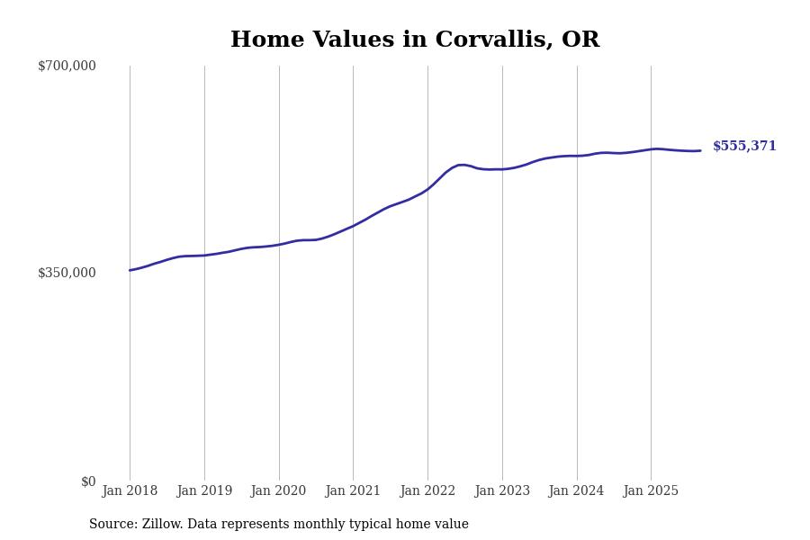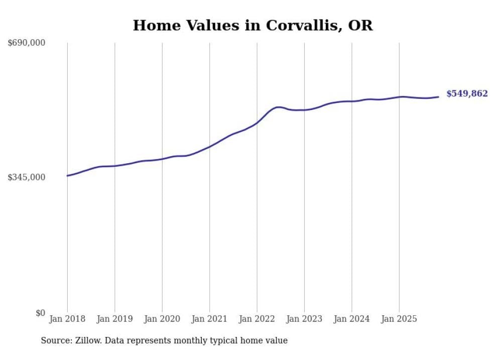 Stacker compiled a list of cities with the most expensive homes in the Corvallis metro area using data from Zillow. Charts show the monthly typical home value since January 2018. All 5 cities and towns with data available were included in the list.