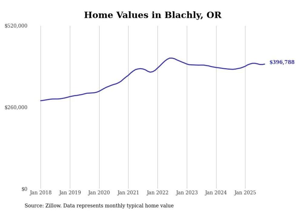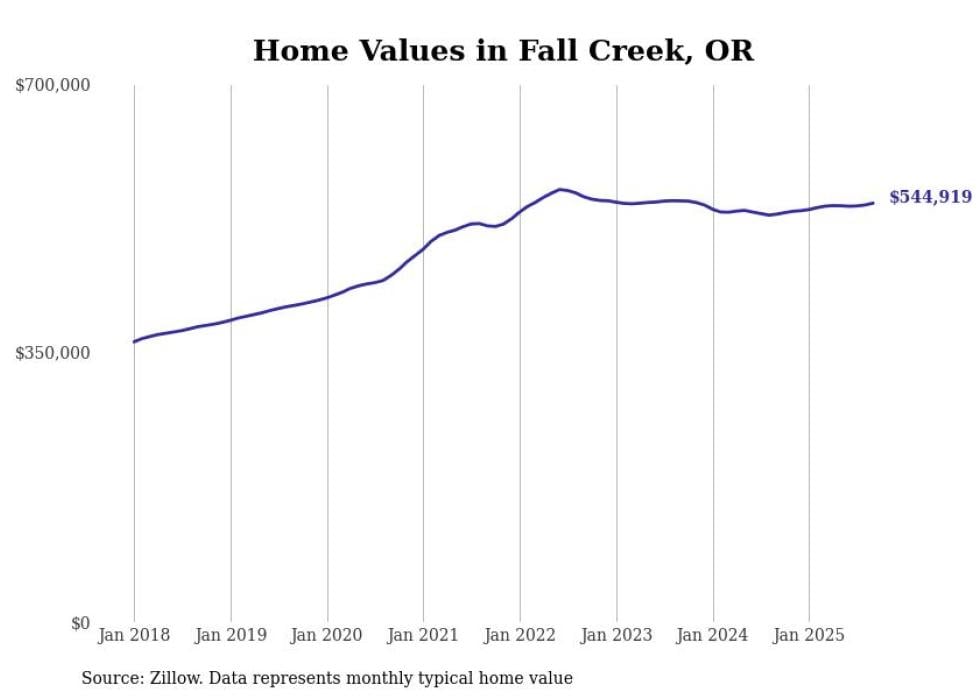 Stacker compiled a list of cities with the most expensive homes in the Eugene metro area using data from Zillow. Charts show the monthly typical home value since January 2018. All 25 cities and towns with data available were included in the list.