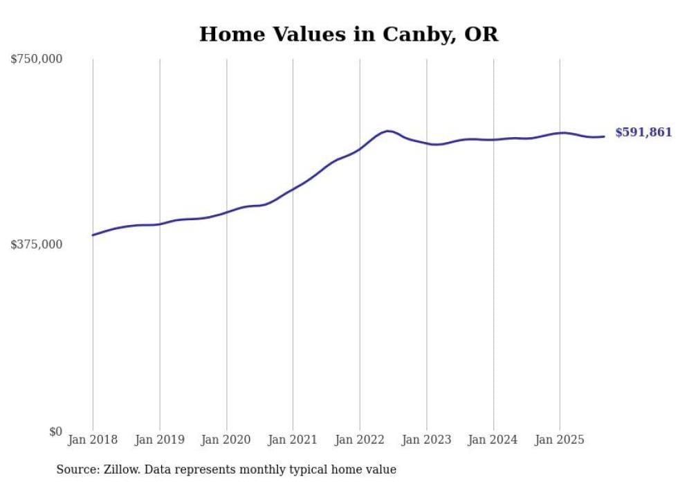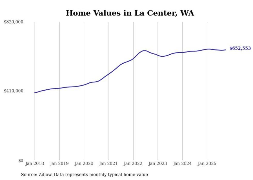 Stacker compiled a list of cities with the most expensive homes in the Portland-Vancouver-Hillsboro, OR-WA metro area using data from Zillow. Charts show the monthly typical home value since January 2018.