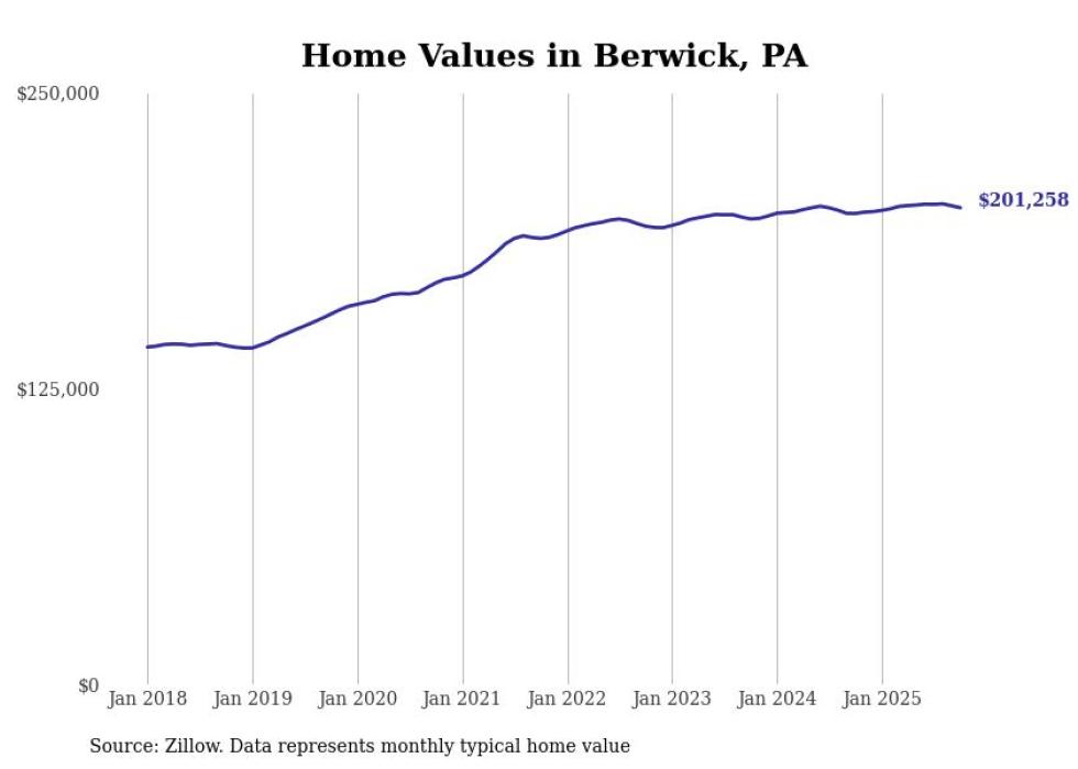 Stacker compiled a list of cities with the most expensive homes in the Bloomsburg-Berwick, PA metro area using data from Zillow. Charts show the monthly typical home value since January 2018.