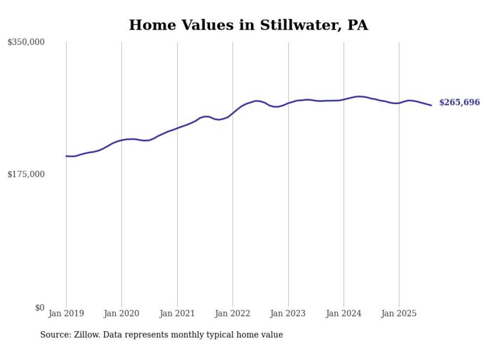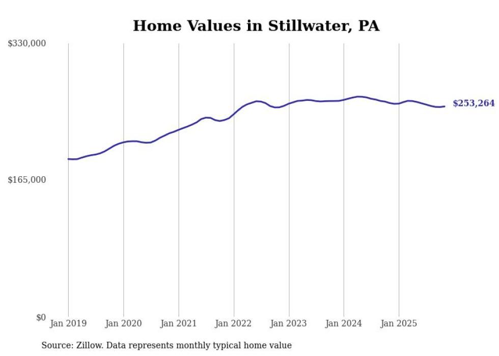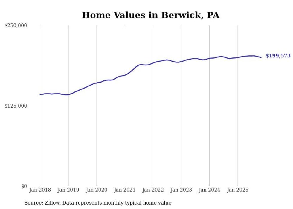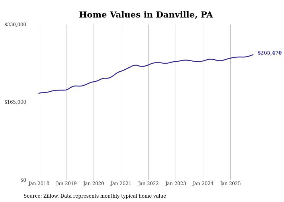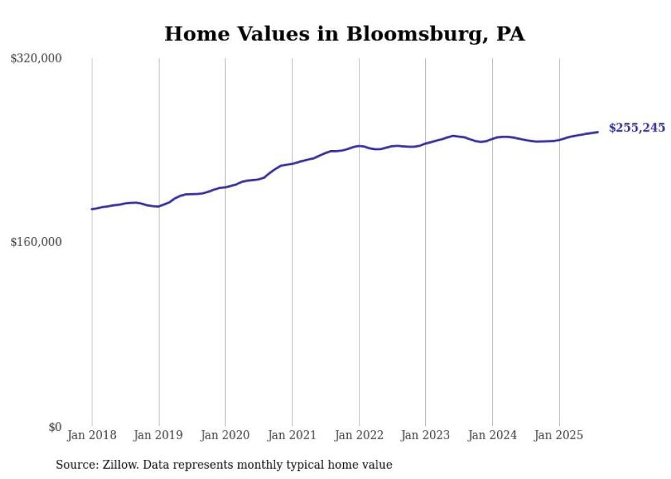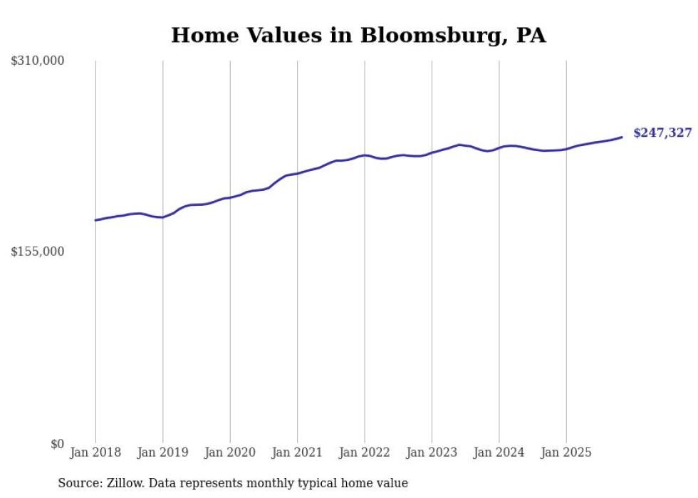 Stacker compiled a list of cities with the most expensive homes in the Bloomsburg metro area using data from Zillow. Charts show the monthly typical home value since January 2018. All 5 cities and towns with data available were included in the list.