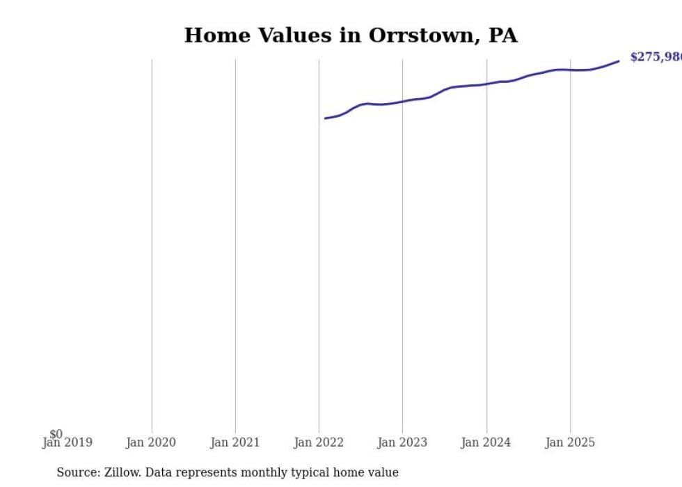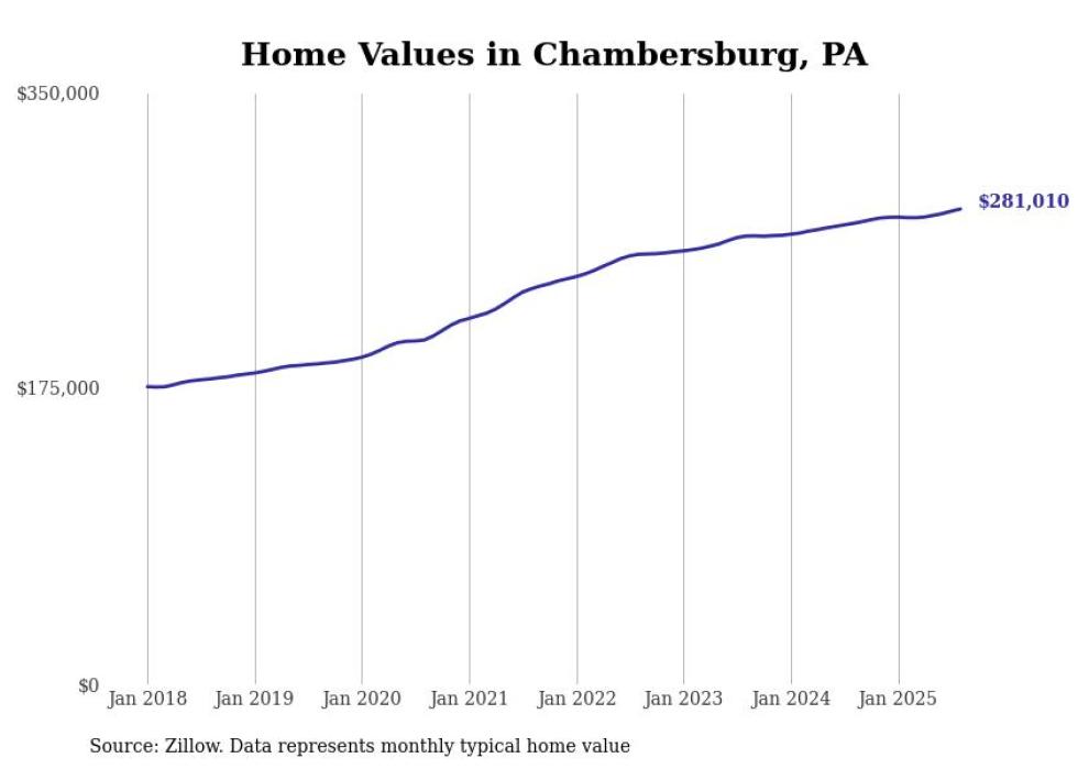 Stacker compiled a list of cities with the most expensive homes in the Chambersburg metro area using data from Zillow. Charts show the monthly typical home value since January 2018. All 7 cities and towns with data available were included in the list.