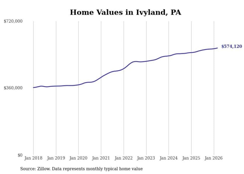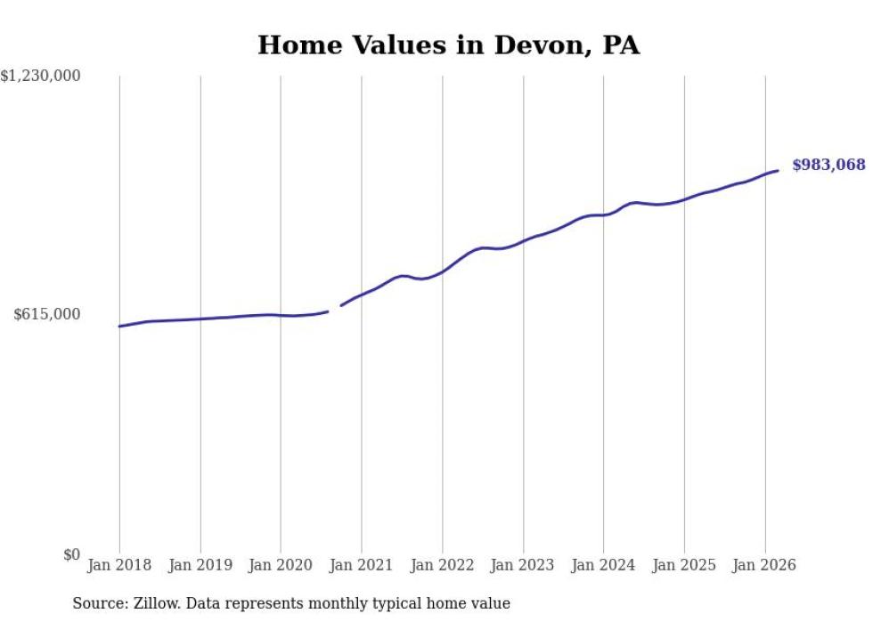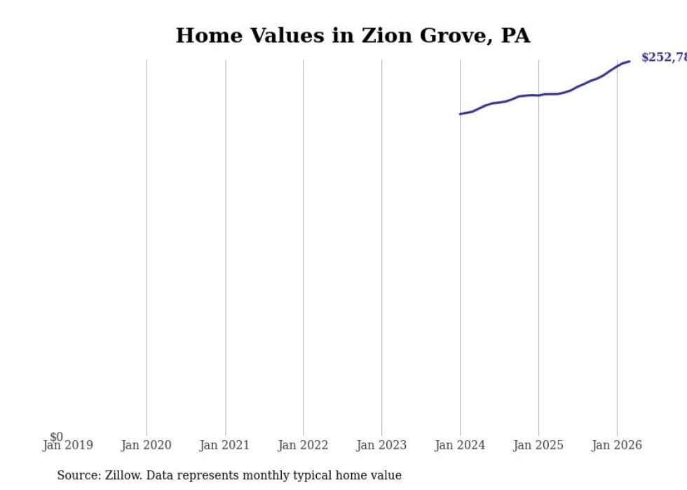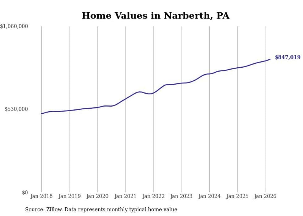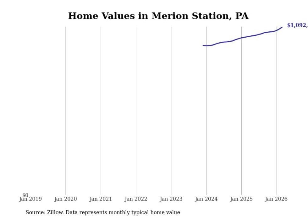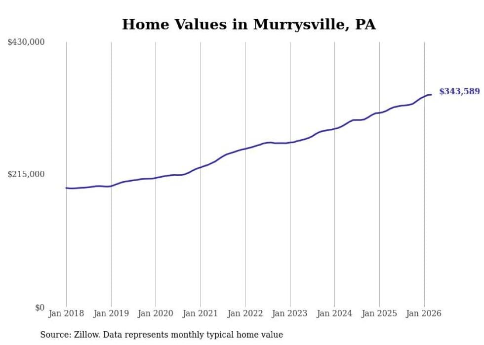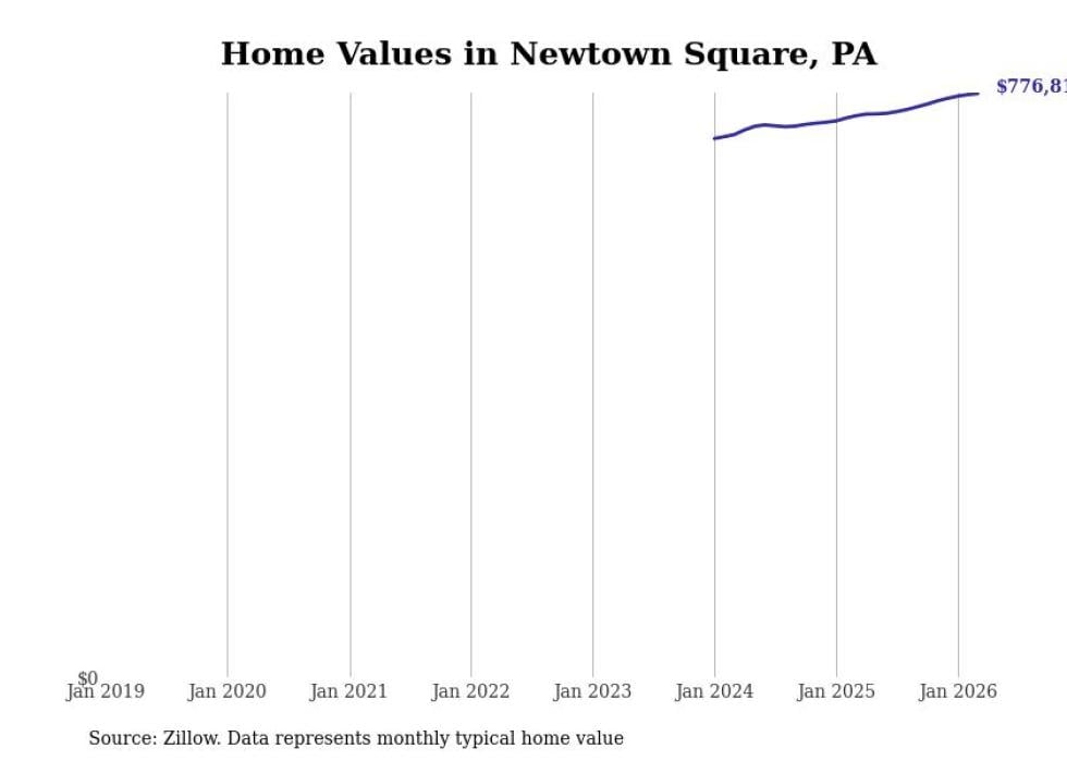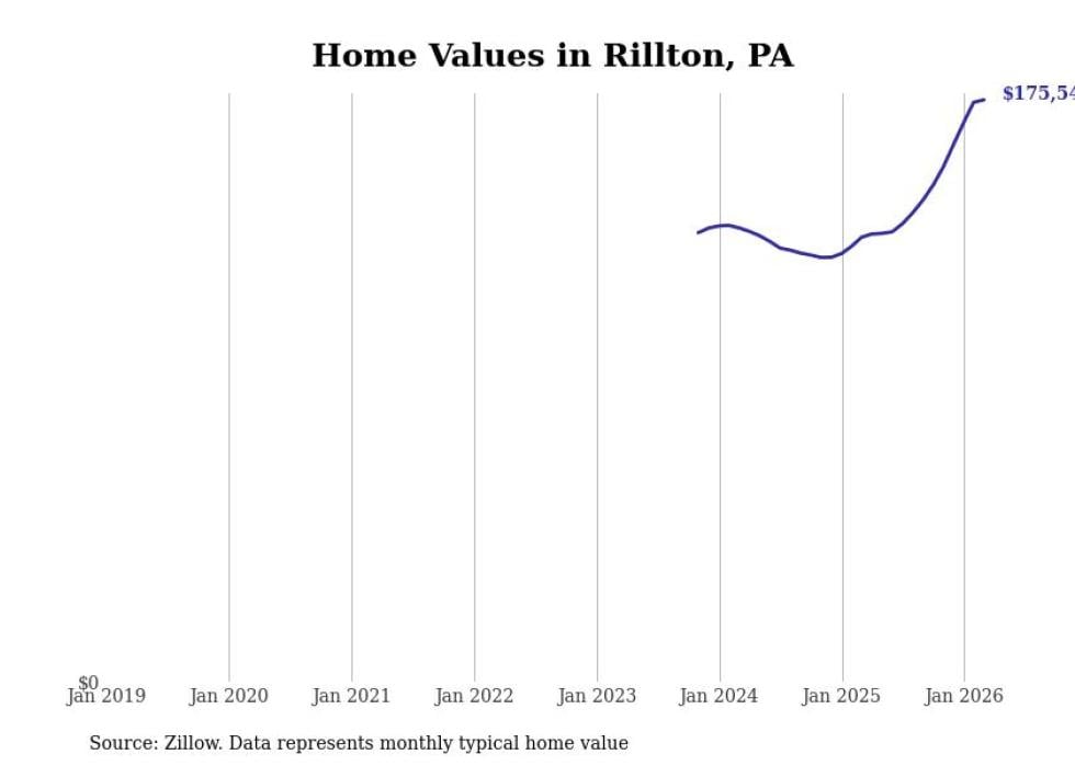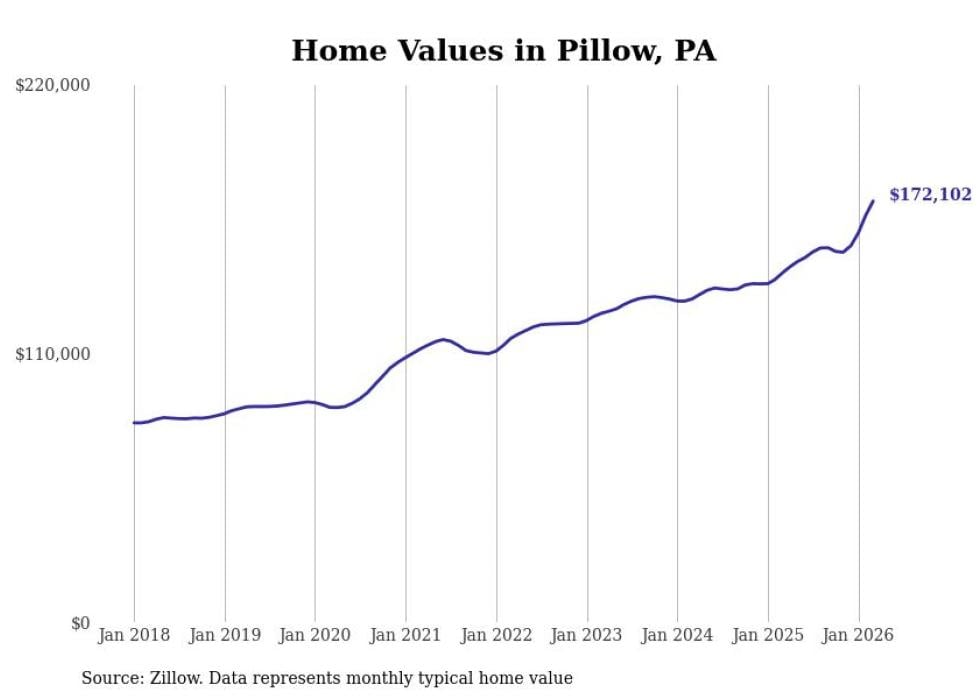 Stacker compiled a list of cities with the fastest-growing home prices in Pennsylvania using data from Zillow. Cities are ranked by the dollar change in the Zillow Home Values Index for all homes from the 12 months ending February 2026. The charts in this story were created automatically using Matplotlib. Data was available for 50 cities and towns in Pennsylvania.