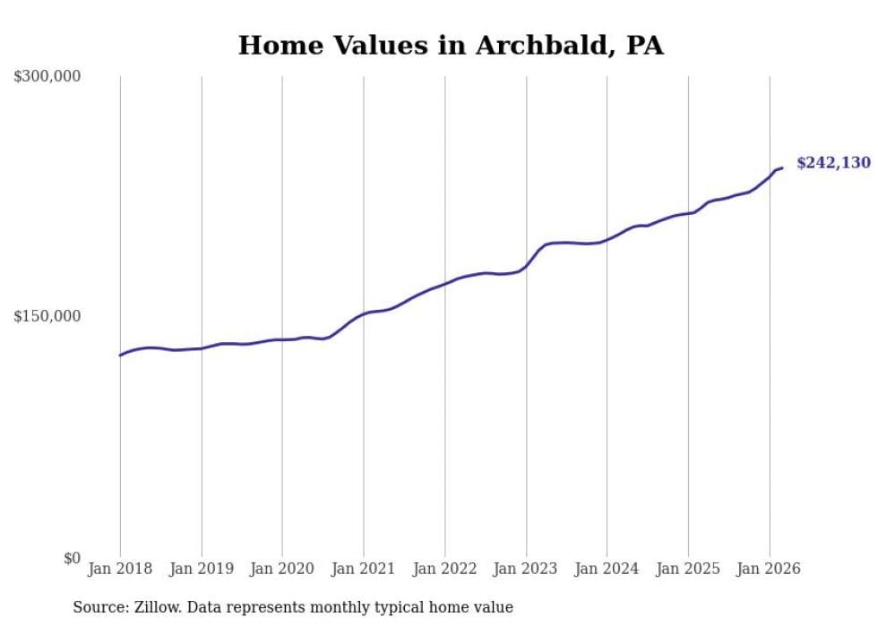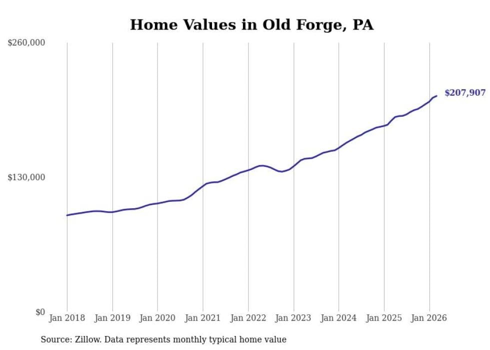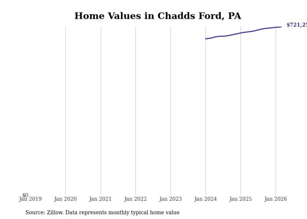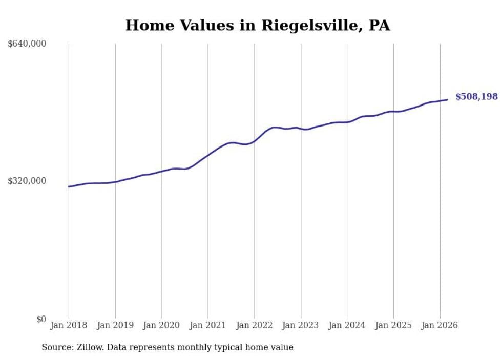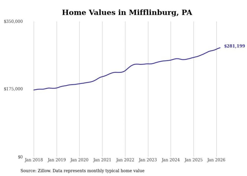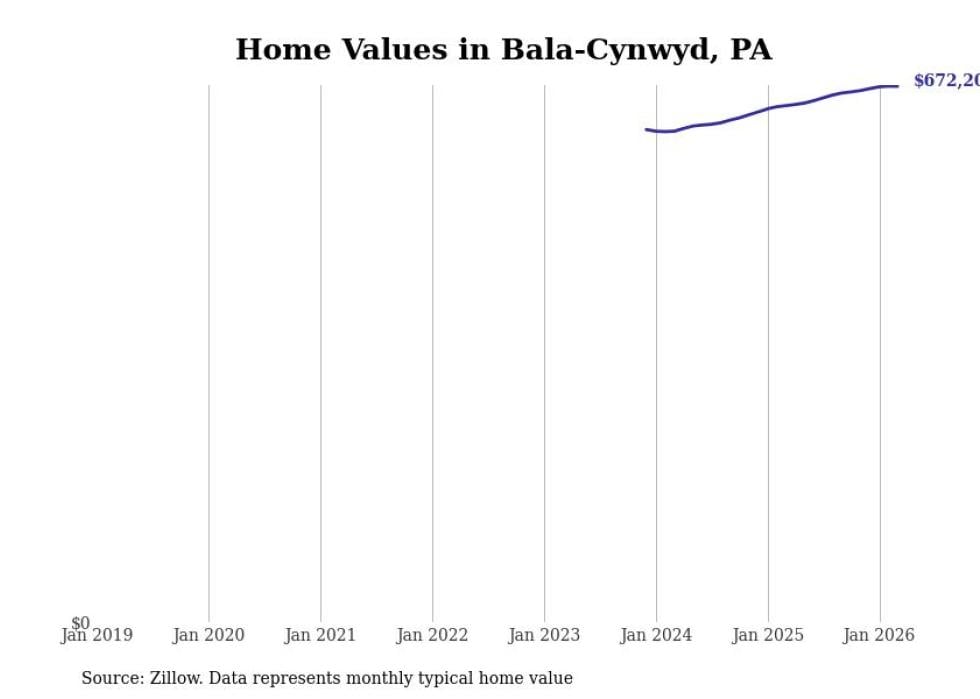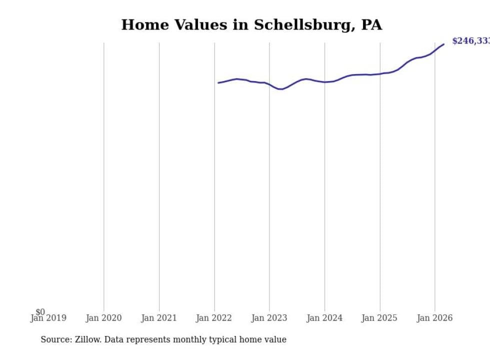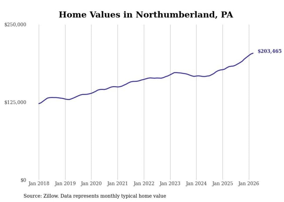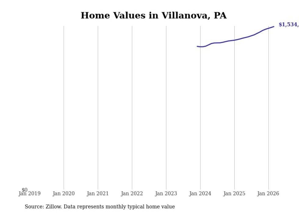 Stacker compiled a list of cities with the fastest-growing home prices in Pennsylvania using data from Zillow. Cities are ranked by the dollar change in the Zillow Home Values Index for all homes from the 12 months ending February 2026. The charts in this story were created automatically using Matplotlib. Data was available for 50 cities and towns in Pennsylvania.