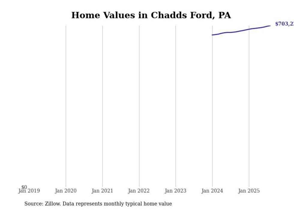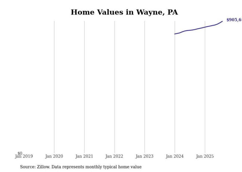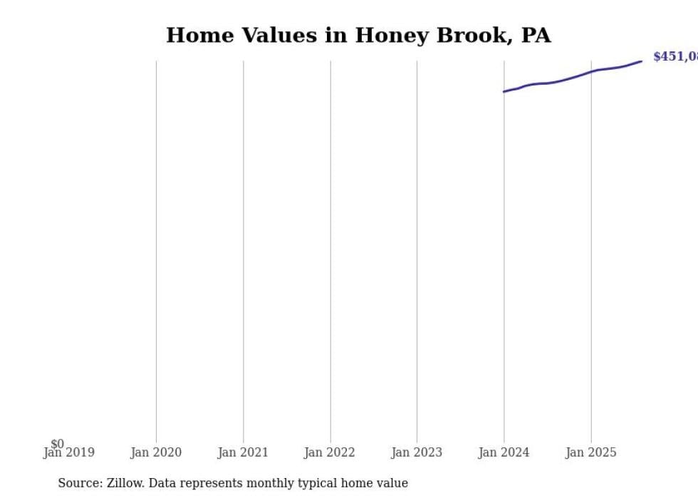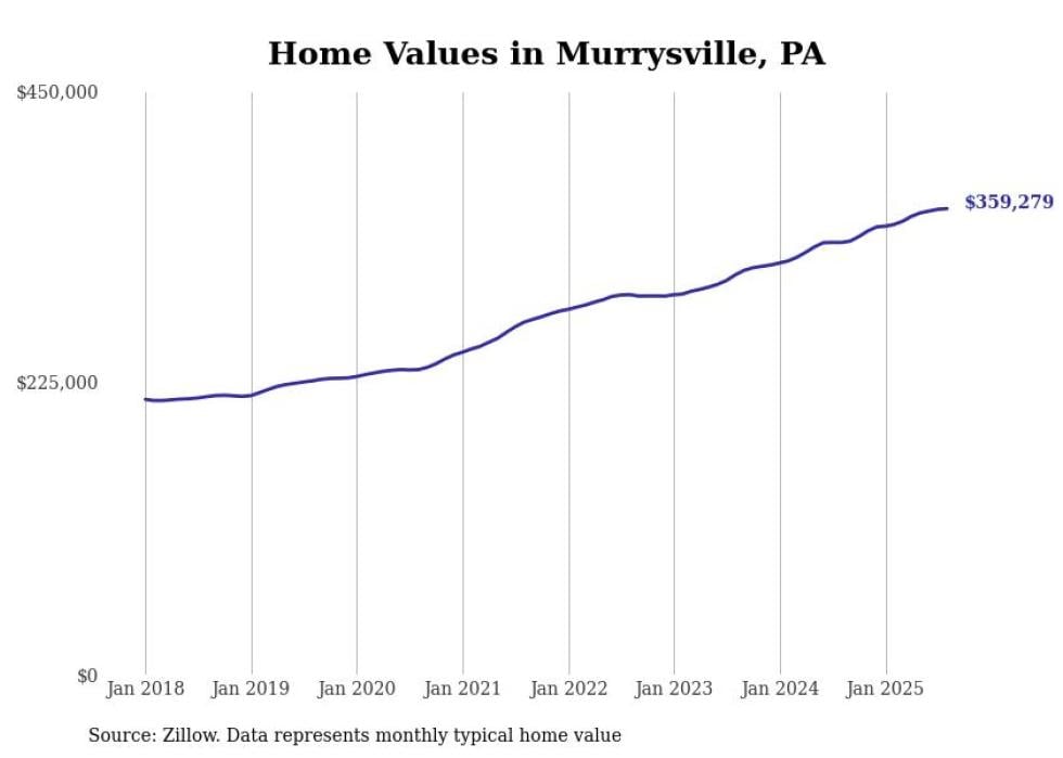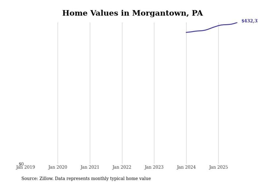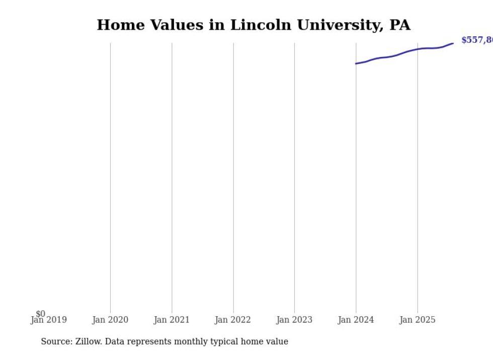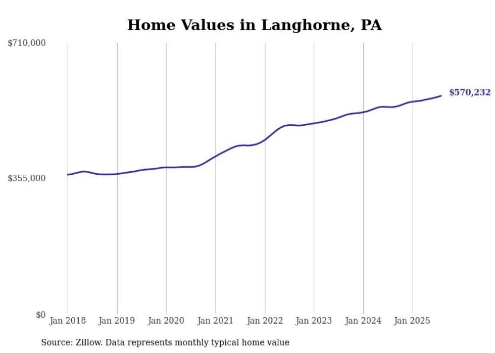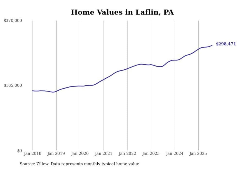 Stacker compiled a list of cities with the fastest-growing home prices in Pennsylvania using data from Zillow. Cities are ranked by the dollar change in the Zillow Home Values Index for all homes from the 12 months ending August 2025. The charts in this story were created automatically using Matplotlib. Data was available for 50 cities and towns in Pennsylvania.