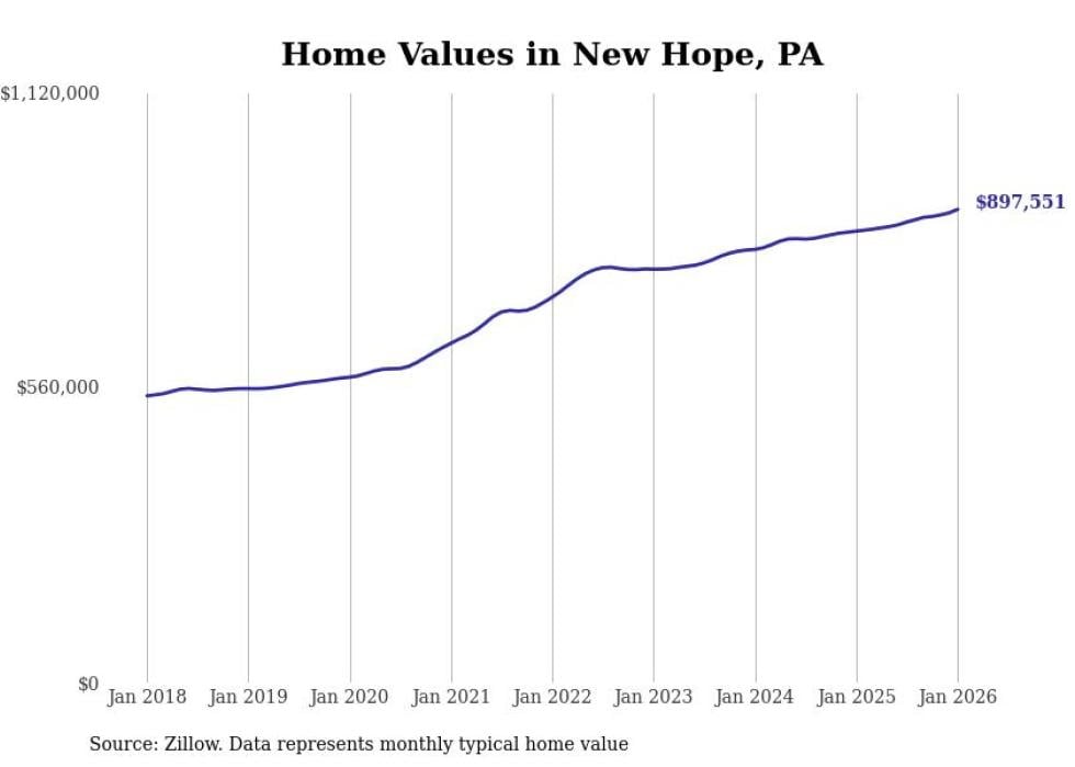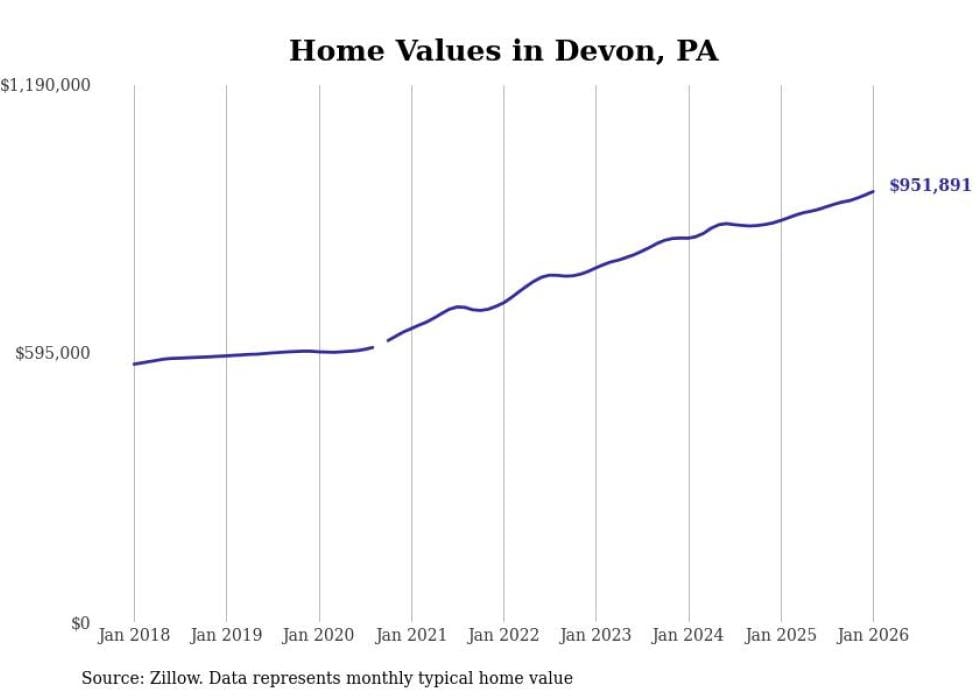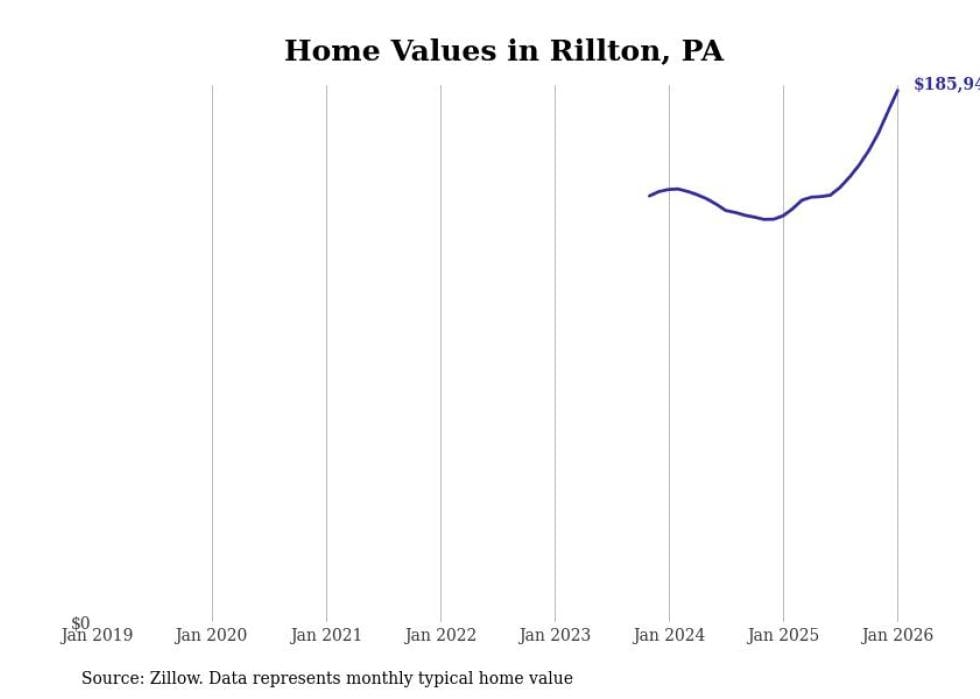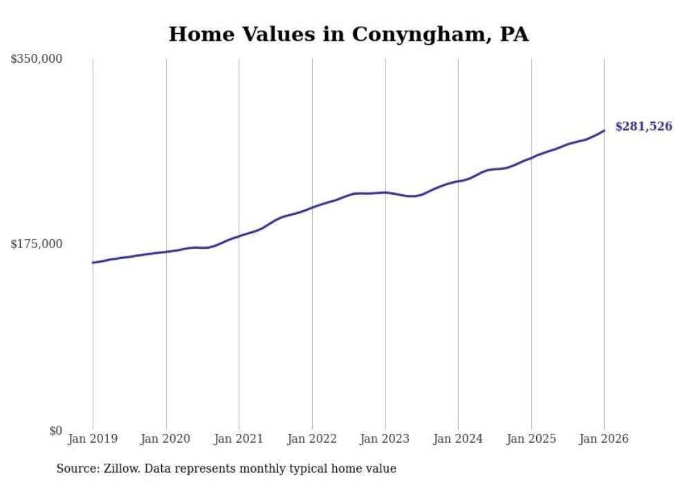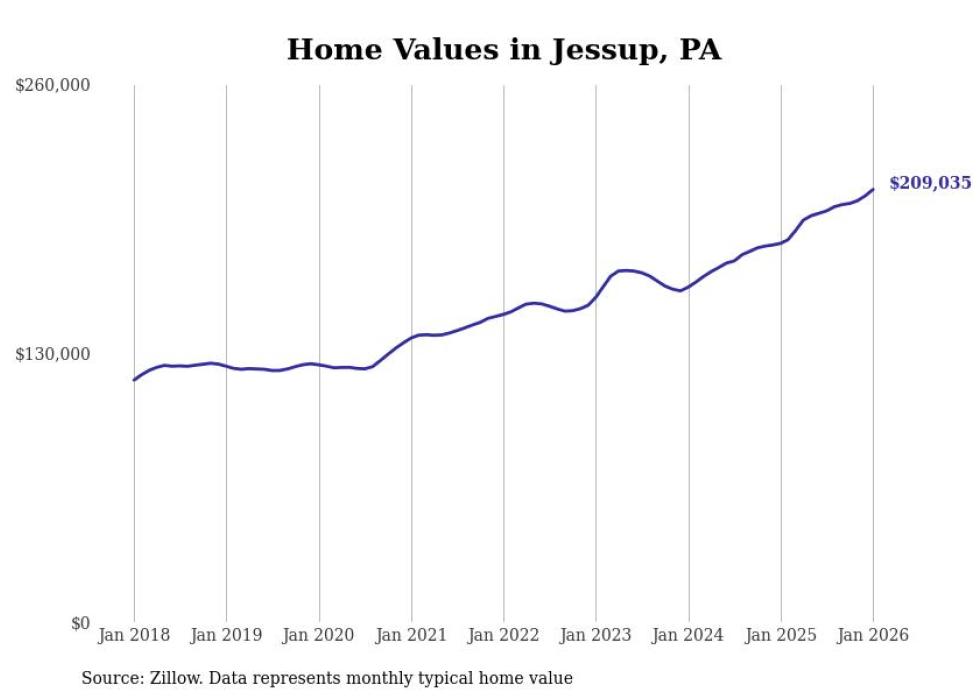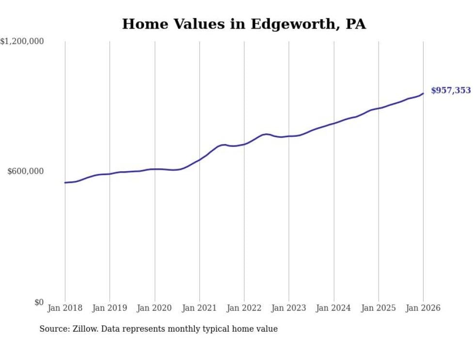 Stacker compiled a list of cities with the fastest-growing home prices in Pennsylvania using data from Zillow. Cities are ranked by the dollar change in the Zillow Home Values Index for all homes from the 12 months ending January 2026. The charts in this story were created automatically using Matplotlib. Data was available for 50 cities and towns in Pennsylvania.