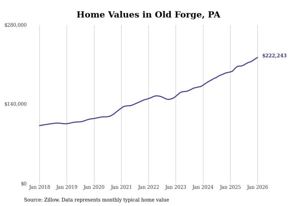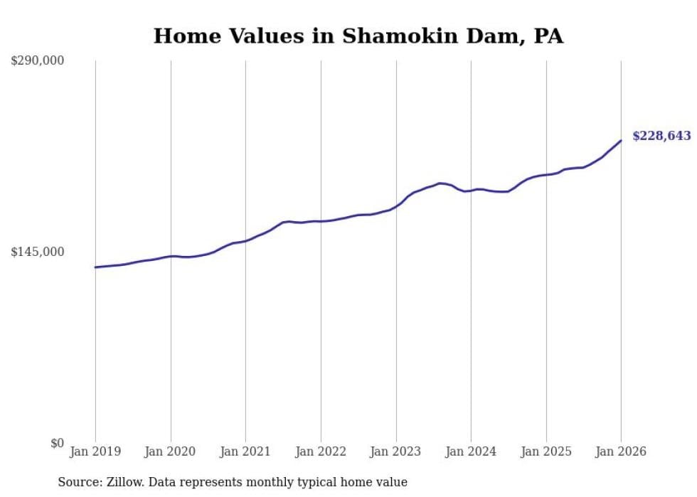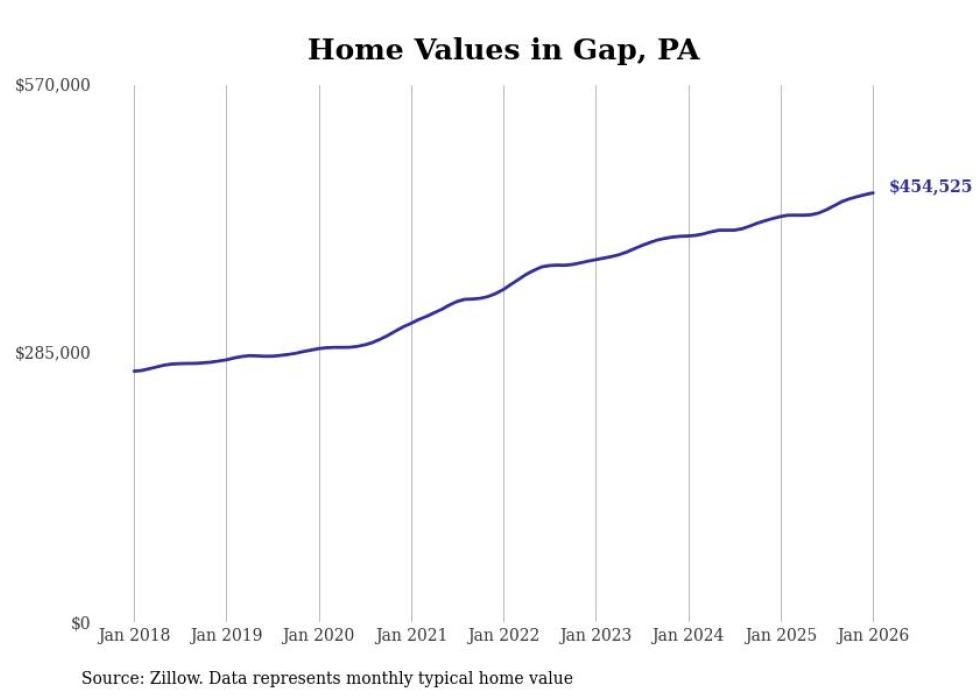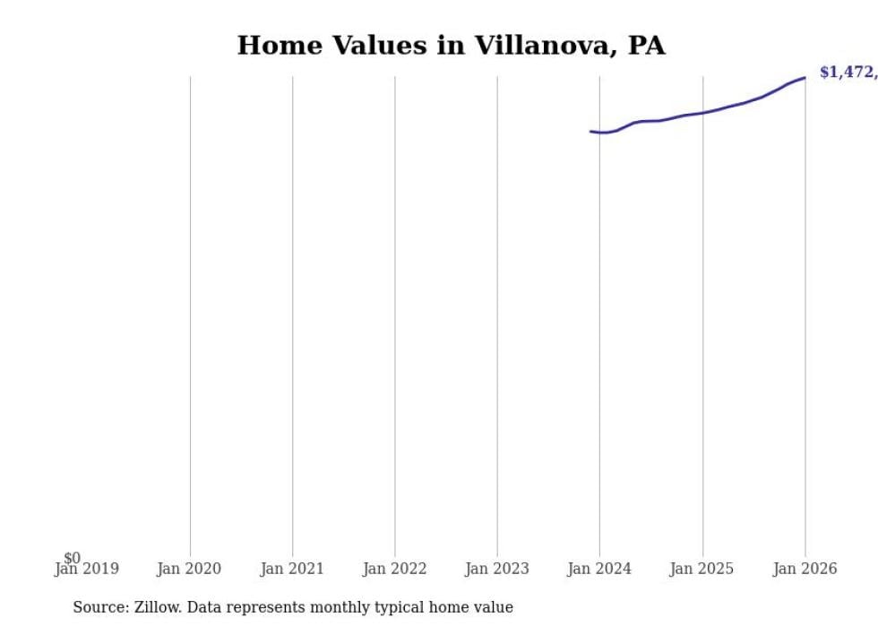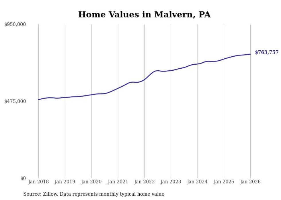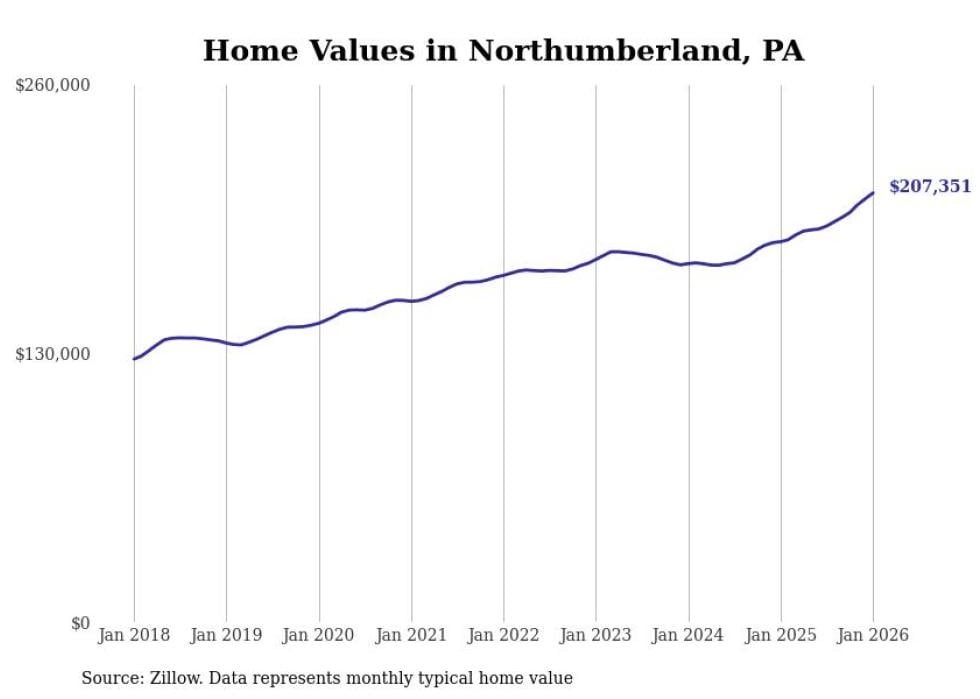 Stacker compiled a list of cities with the fastest-growing home prices in Pennsylvania using data from Zillow. Cities are ranked by the dollar change in the Zillow Home Values Index for all homes from the 12 months ending January 2026. The charts in this story were created automatically using Matplotlib. Data was available for 50 cities and towns in Pennsylvania.