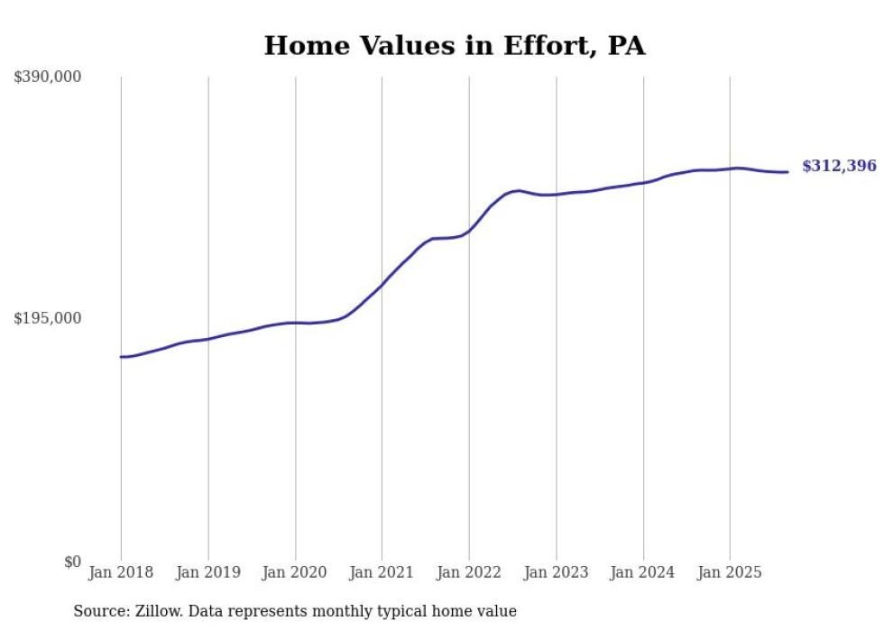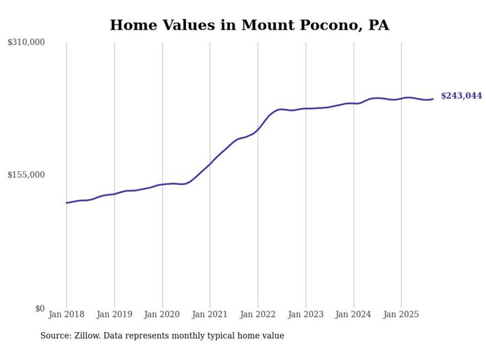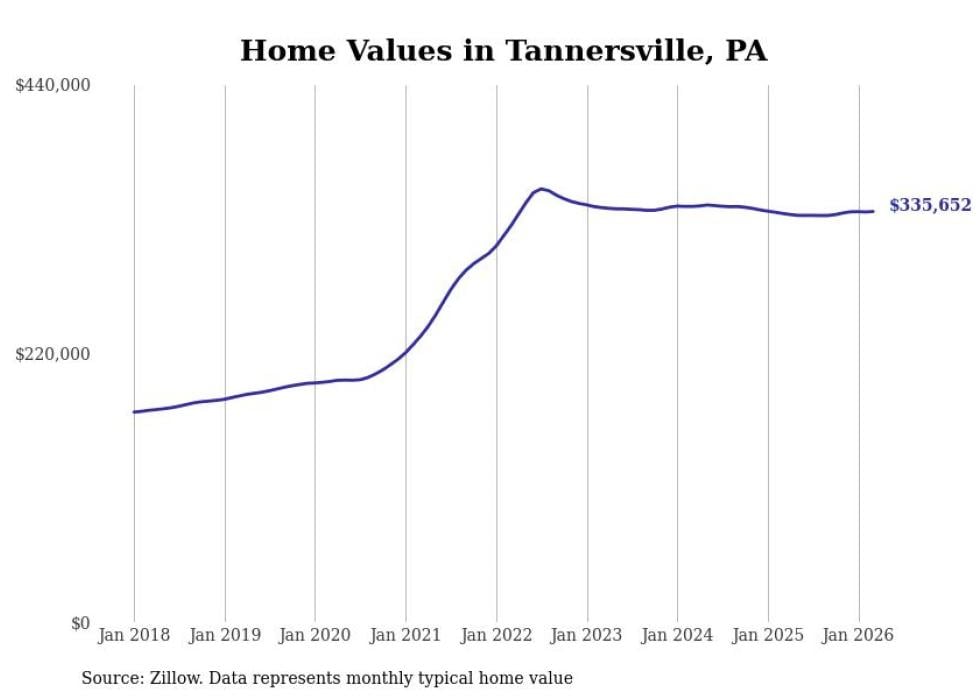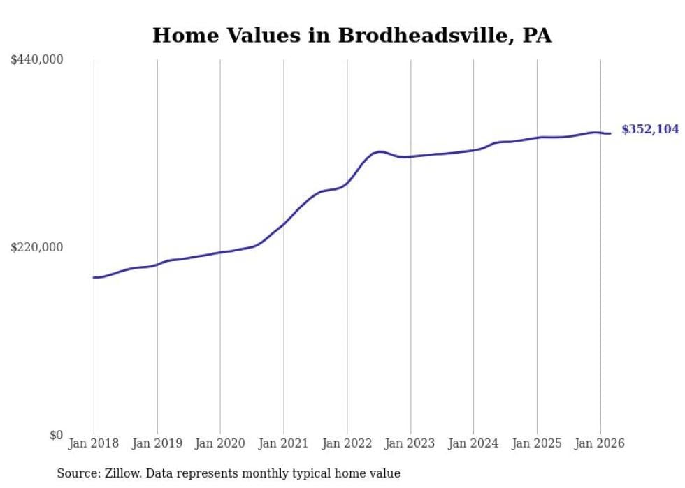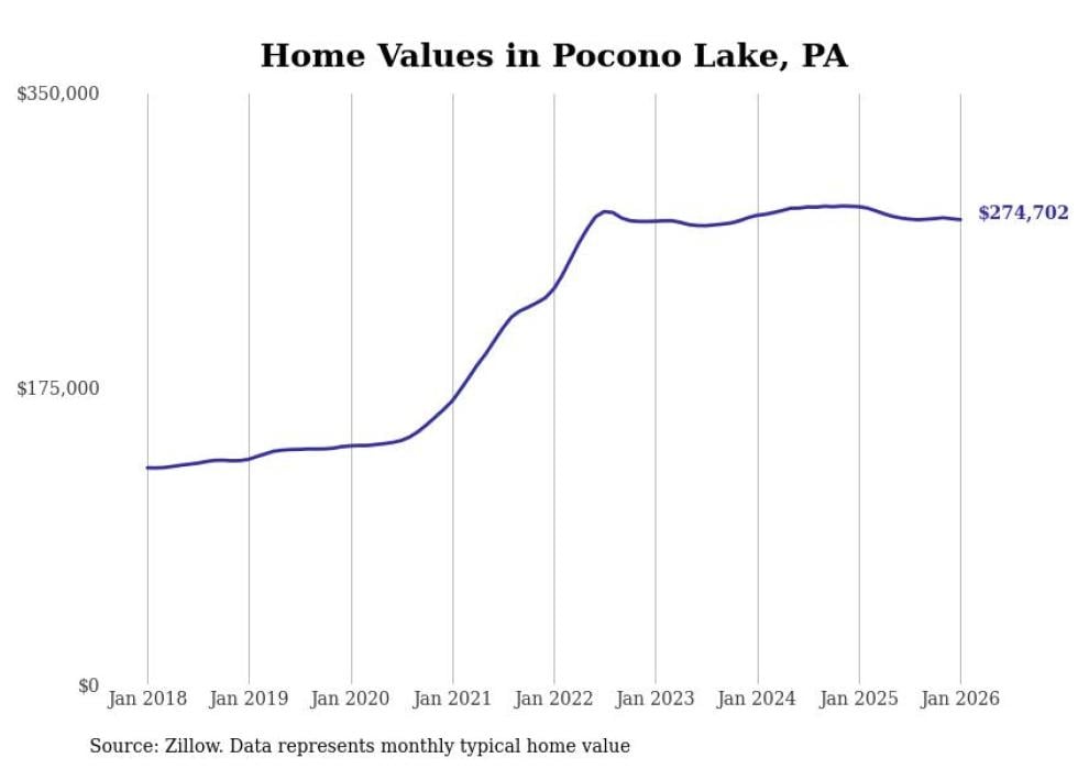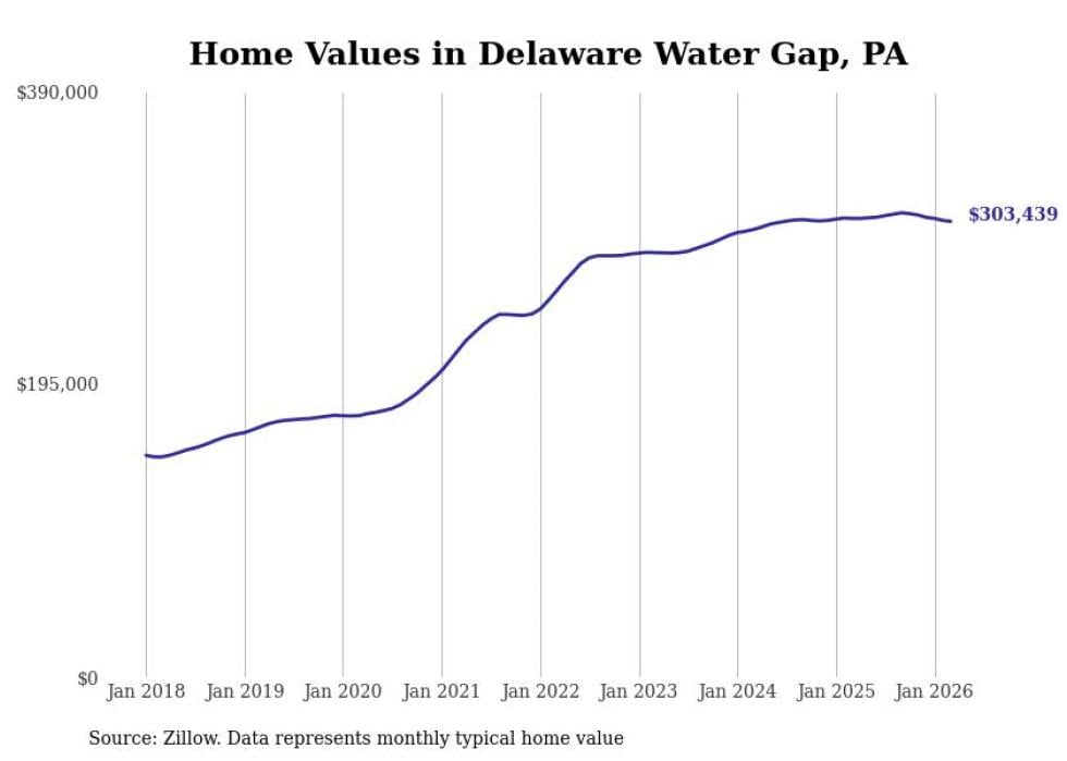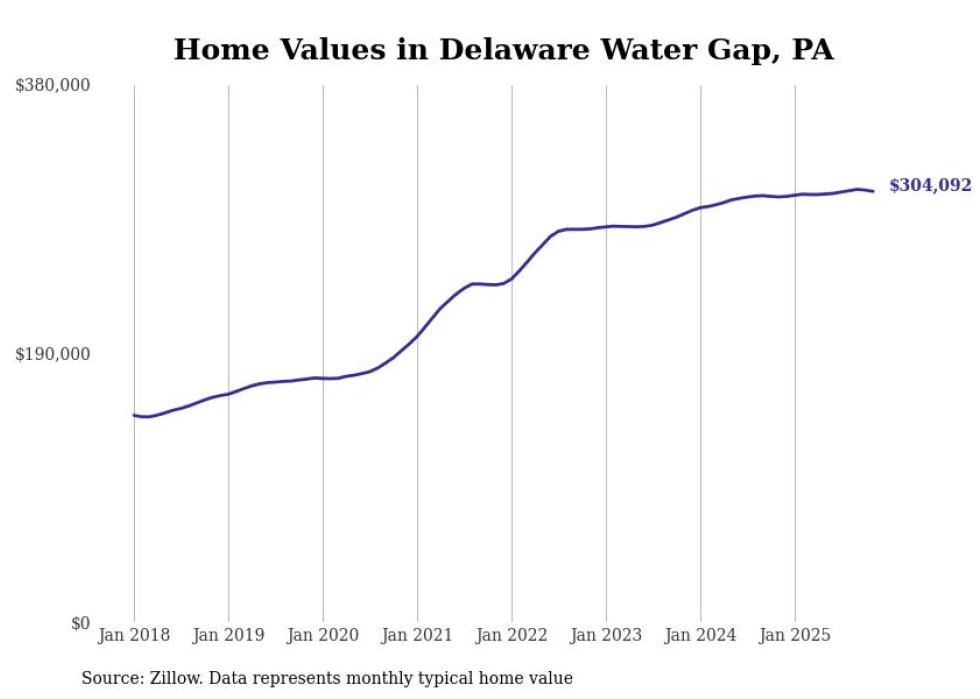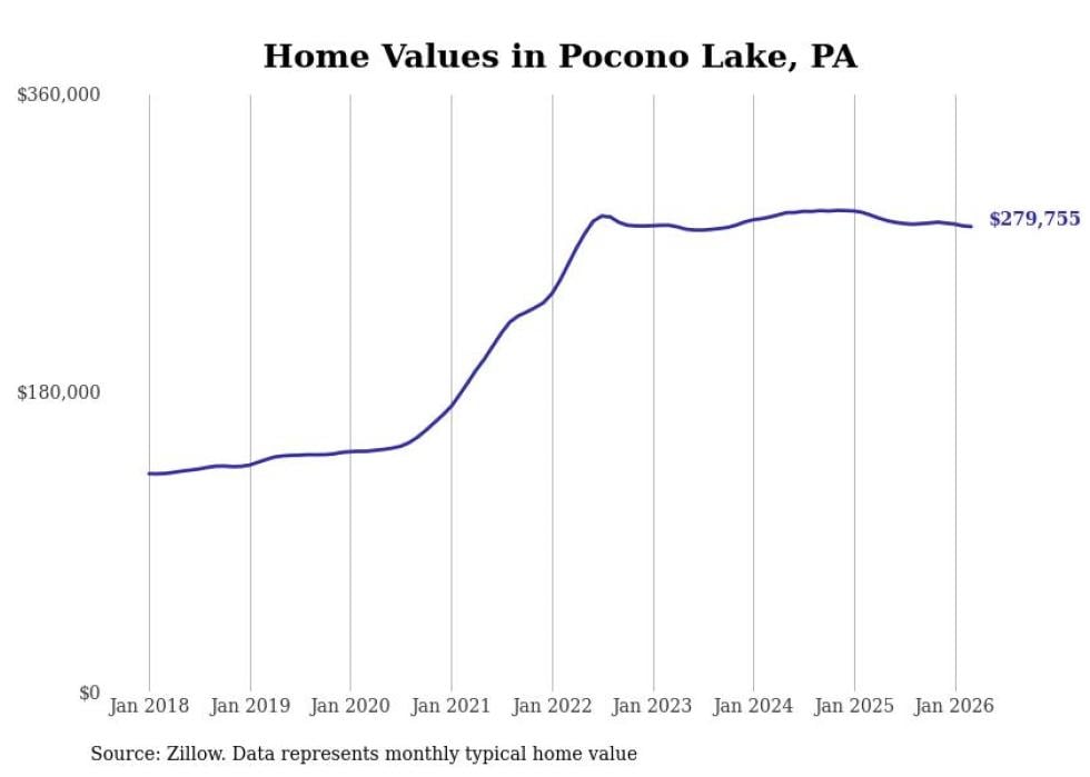 Stacker compiled a list of cities with the most expensive homes in the East Stroudsburg metro area using data from Zillow. Charts show the monthly typical home value since January 2018. All 10 cities and towns with data available were included in the list.