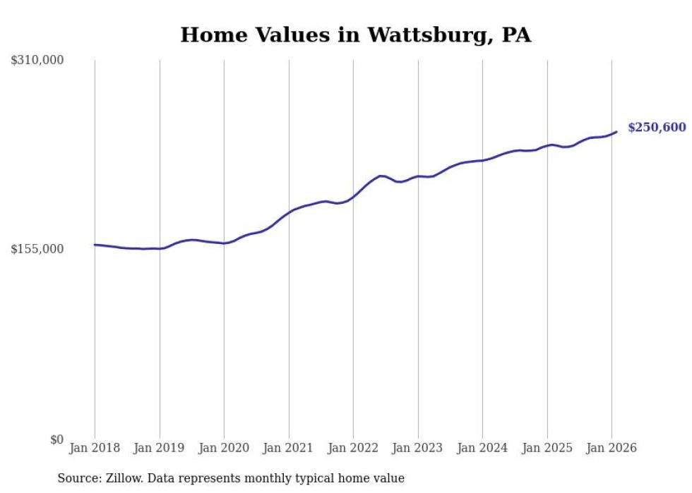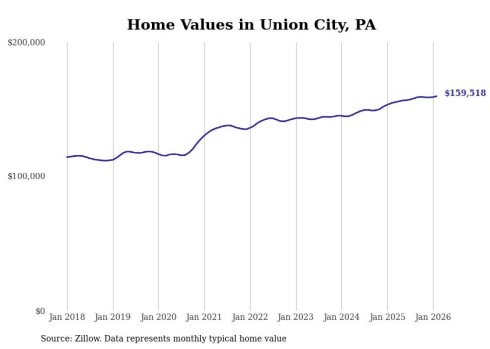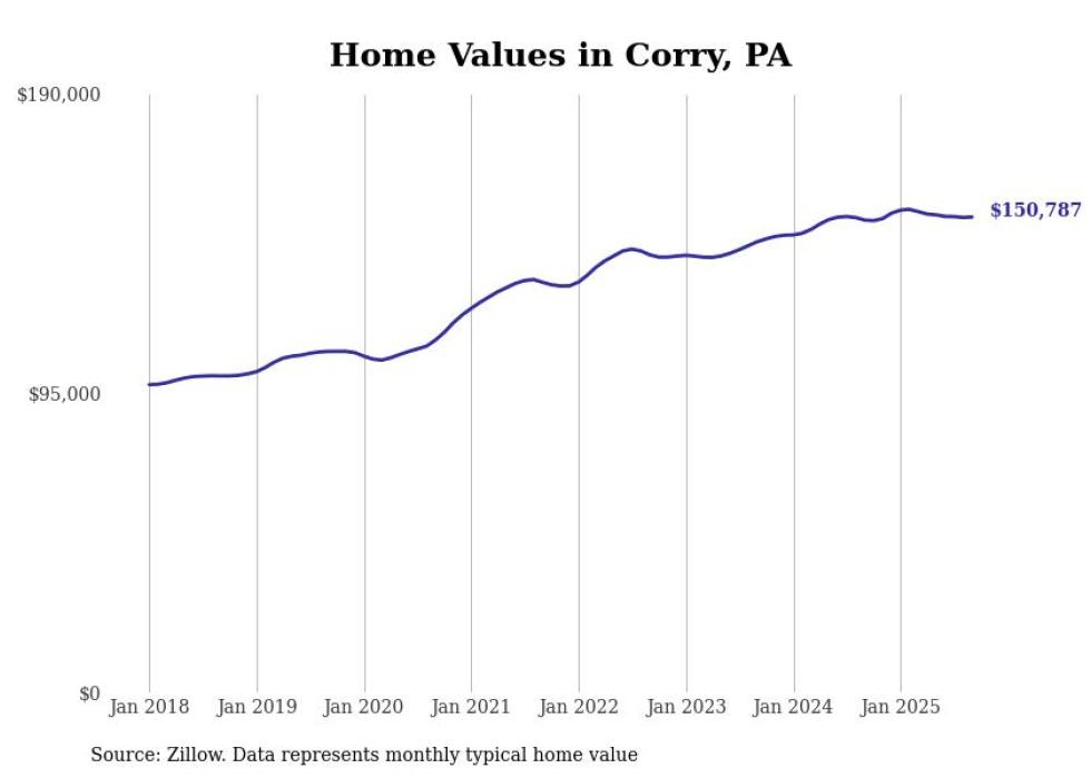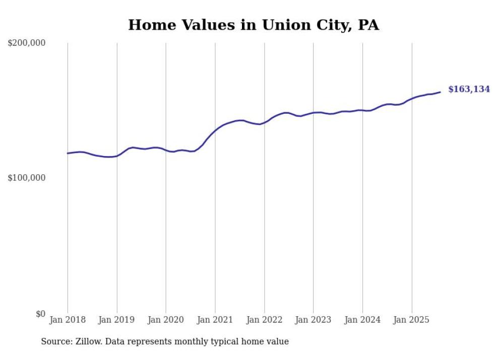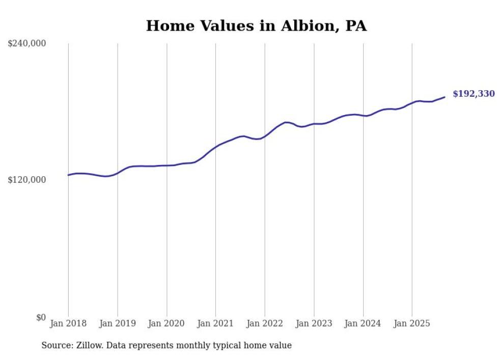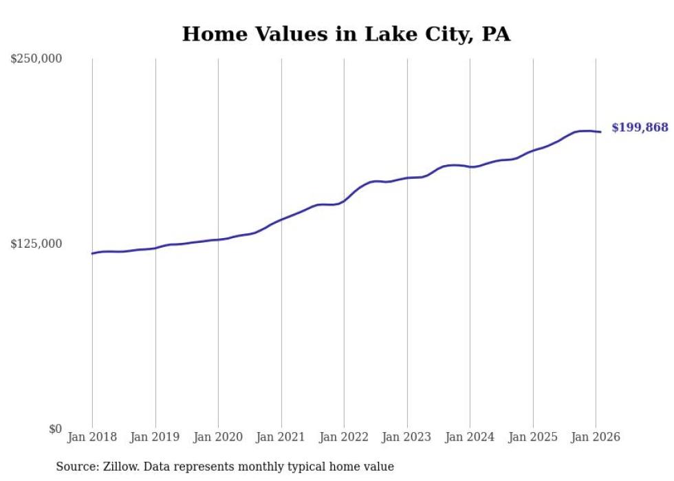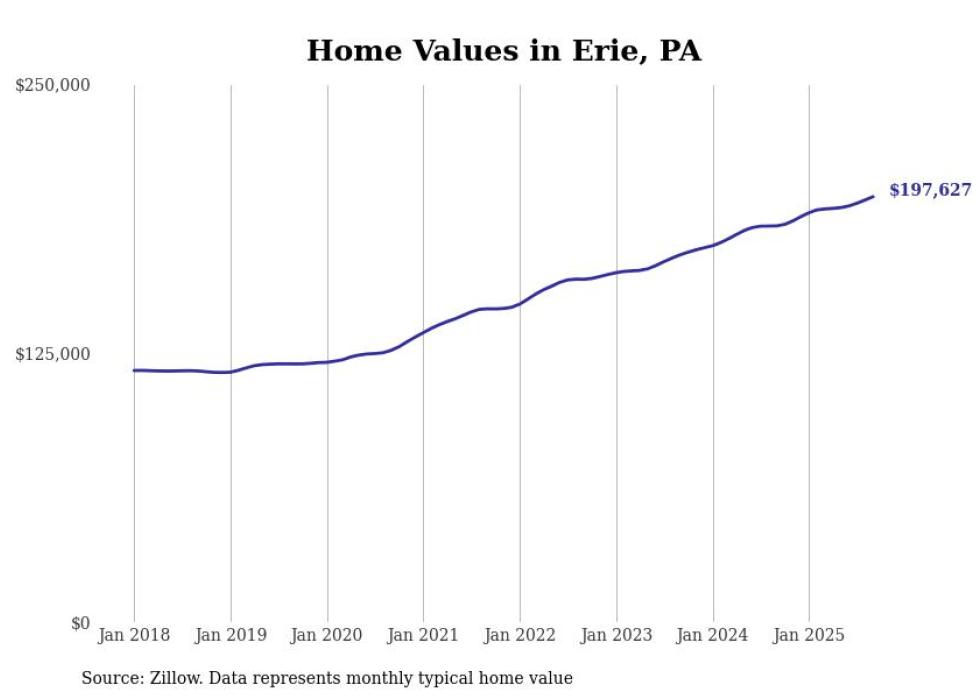 Stacker compiled a list of cities with the most expensive homes in the Erie, PA metro area using data from Zillow. Charts show the monthly typical home value since January 2018.