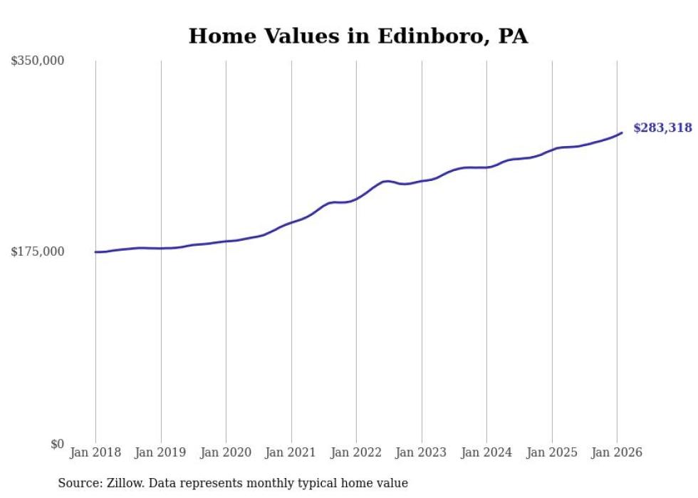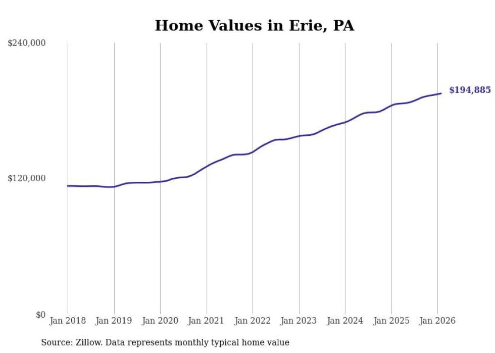 Stacker compiled a list of cities with the most expensive homes in the Erie metro area using data from Zillow. Charts show the monthly typical home value since January 2018. All 9 cities and towns with data available were included in the list.