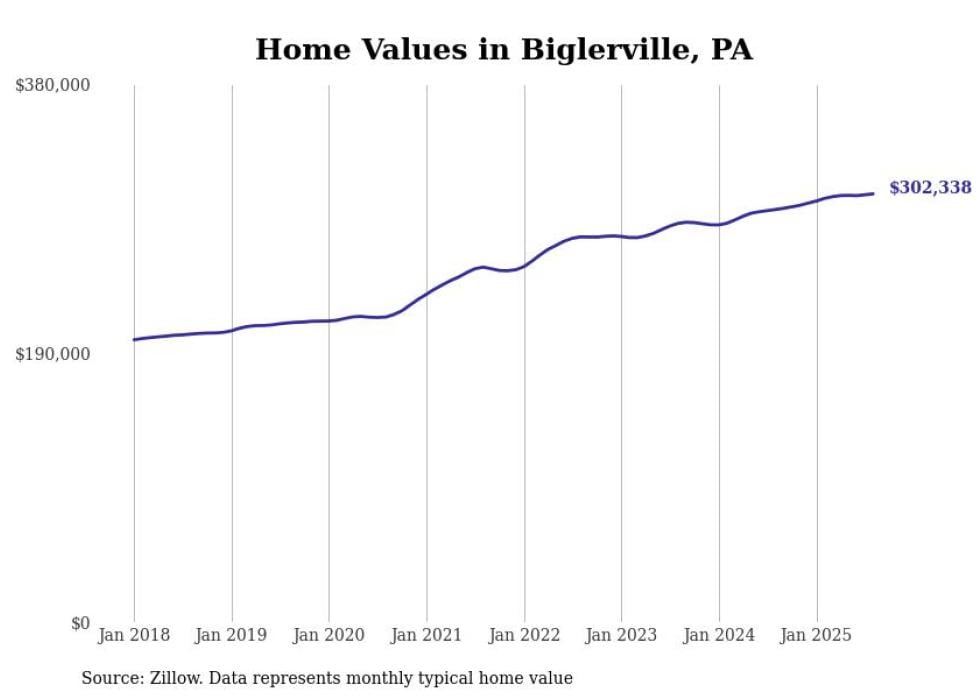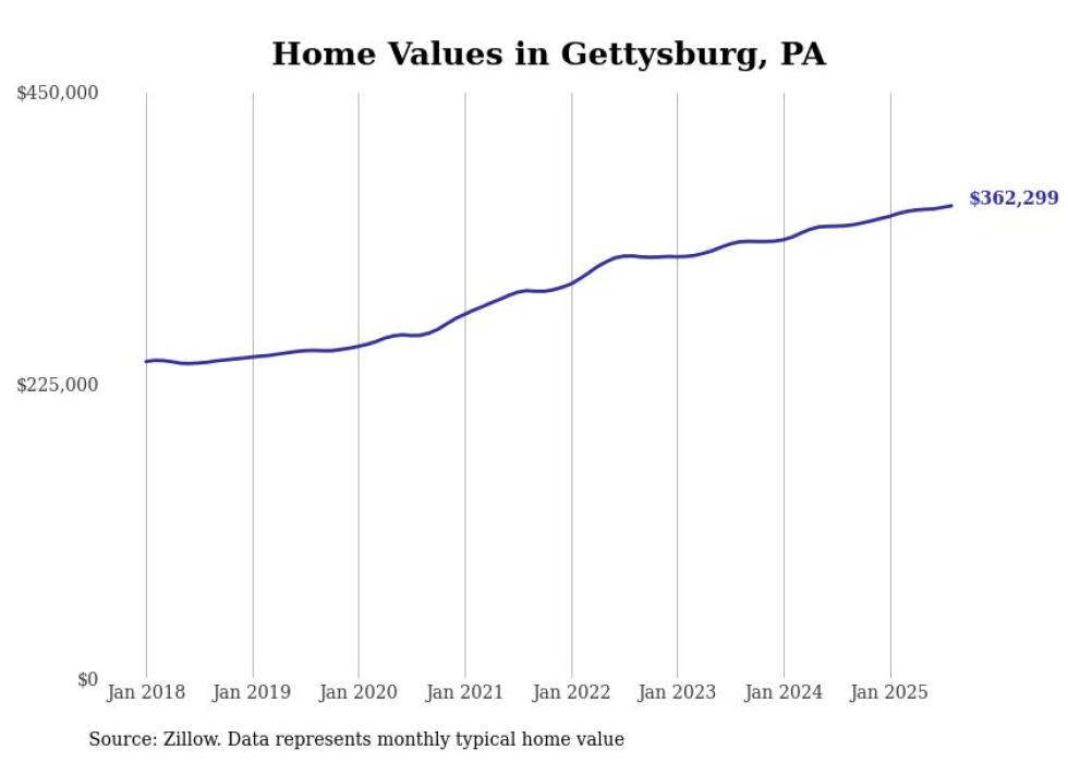 Stacker compiled a list of cities with the most expensive homes in the Gettysburg metro area using data from Zillow. Charts show the monthly typical home value since January 2018. All 10 cities and towns with data available were included in the list.