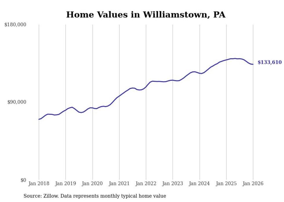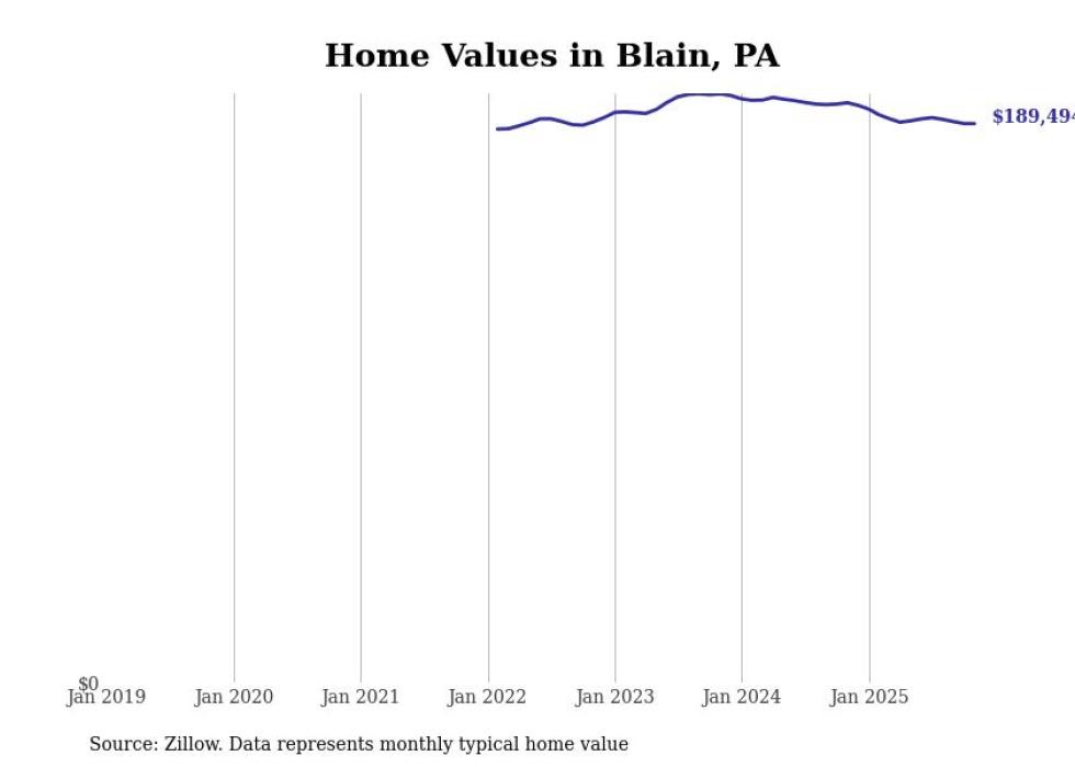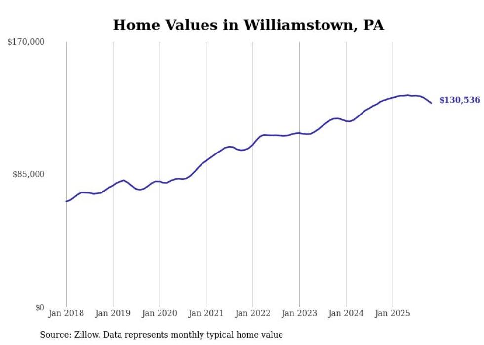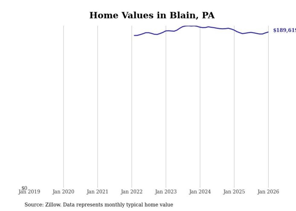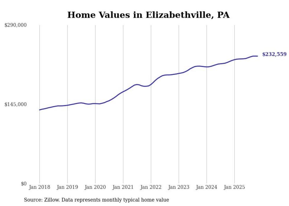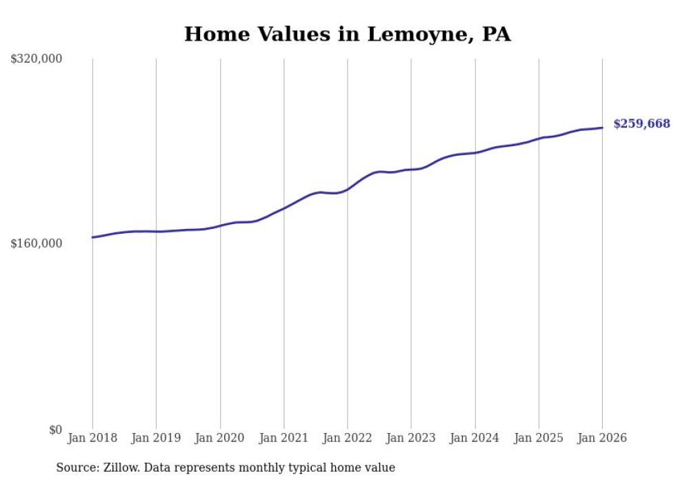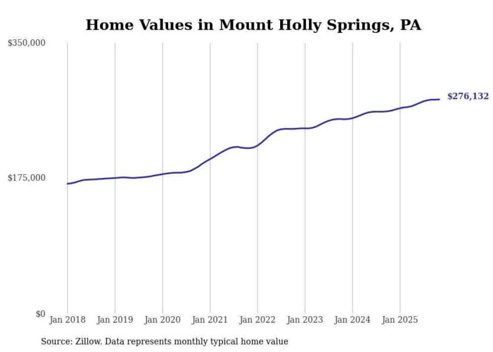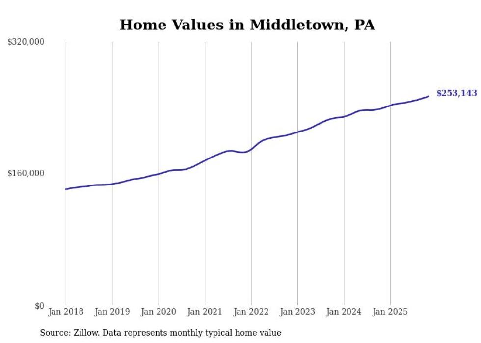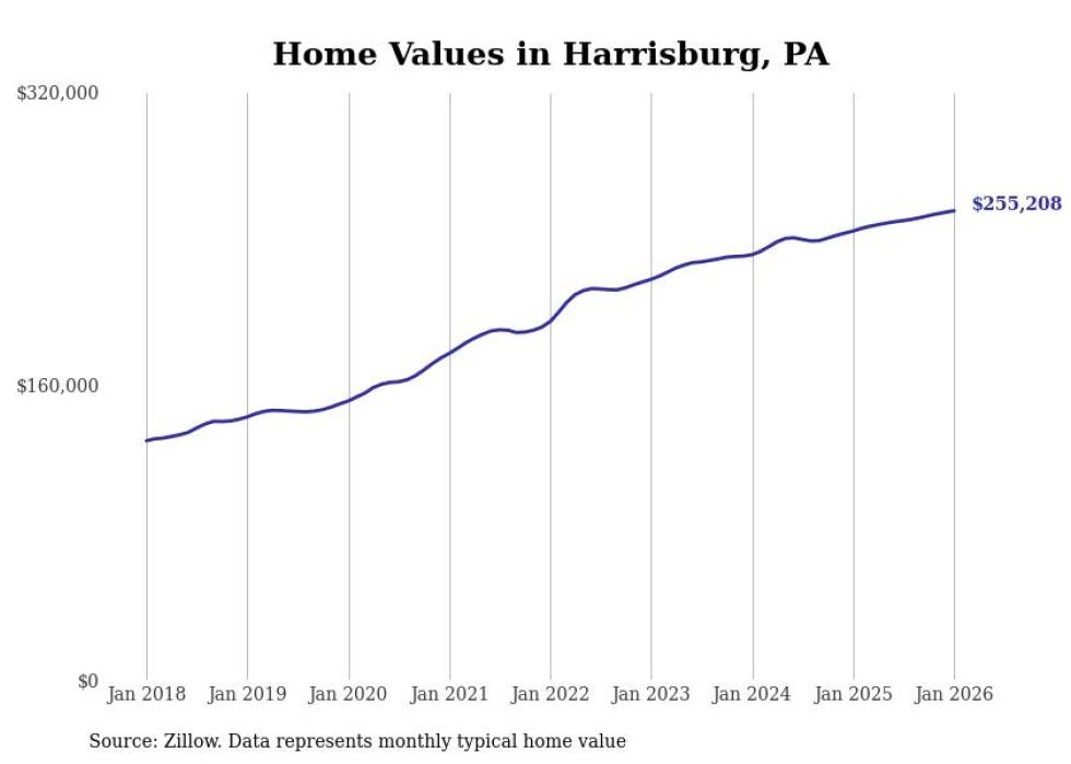 Stacker compiled a list of cities with the most expensive homes in the Harrisburg metro area using data from Zillow. Charts show the monthly typical home value since January 2018. All 28 cities and towns with data available were included in the list.