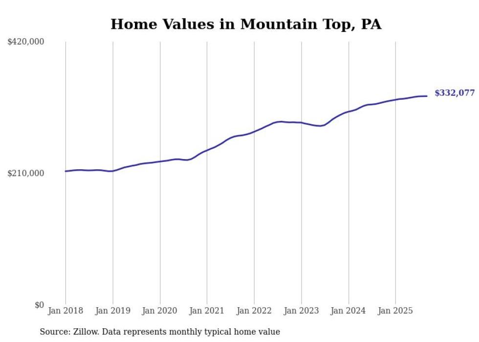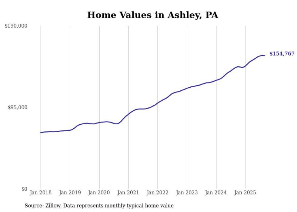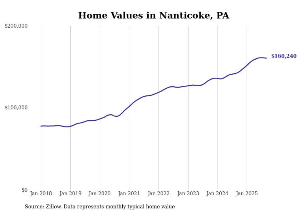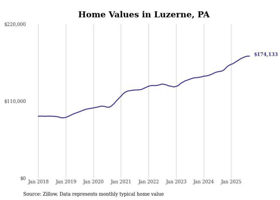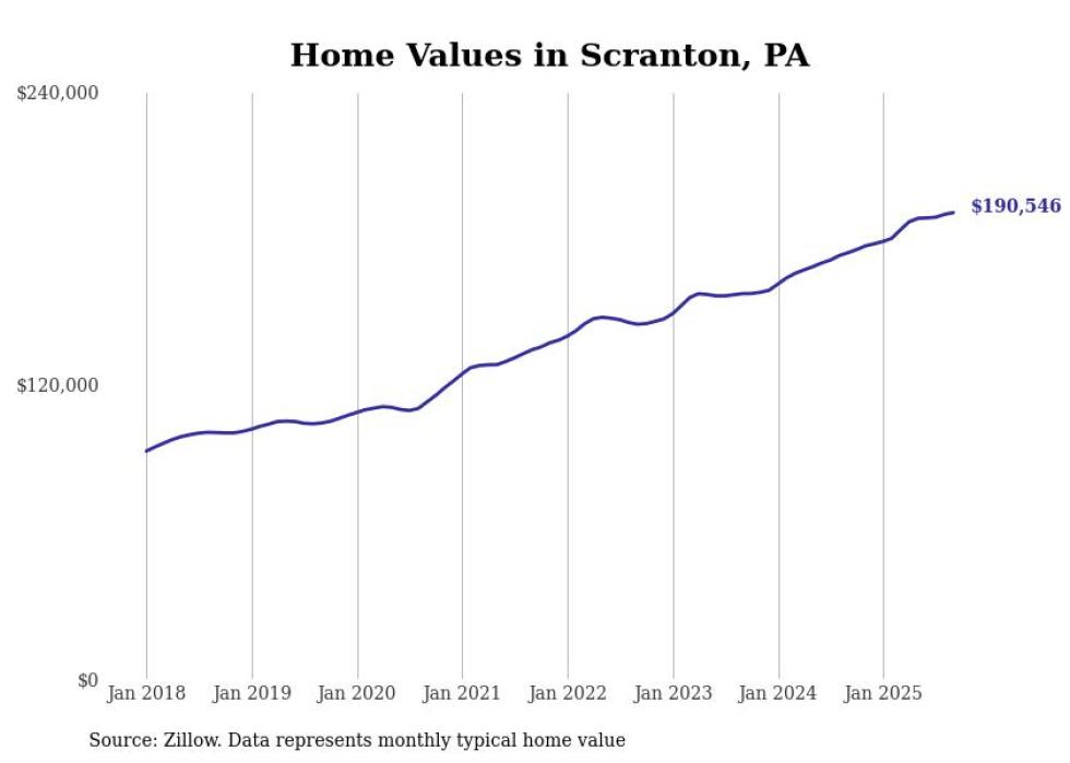 Stacker compiled a list of cities with the most expensive homes in the Scranton--Wilkes-Barre, PA metro area using data from Zillow. Charts show the monthly typical home value since January 2018.