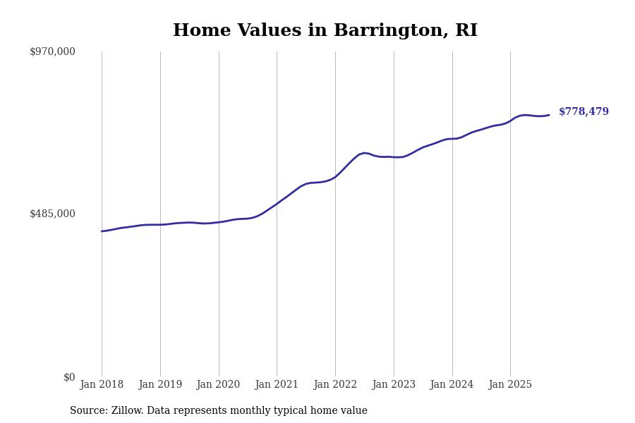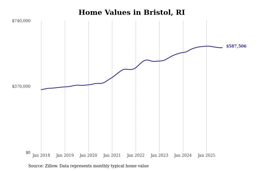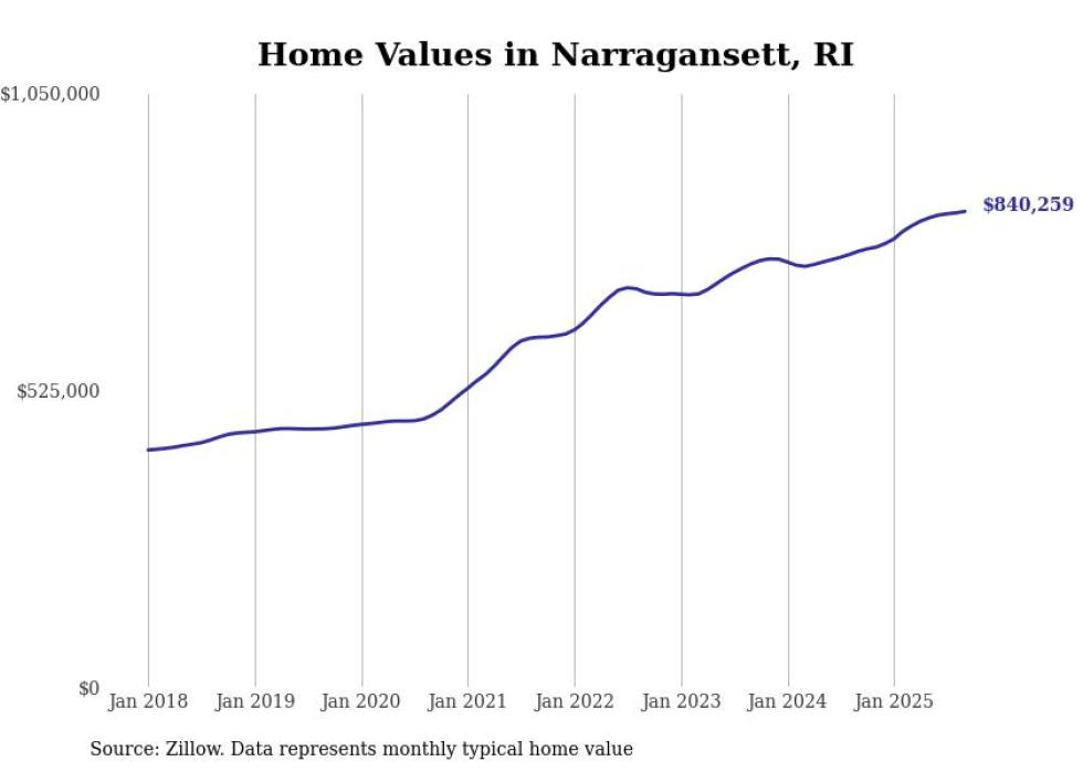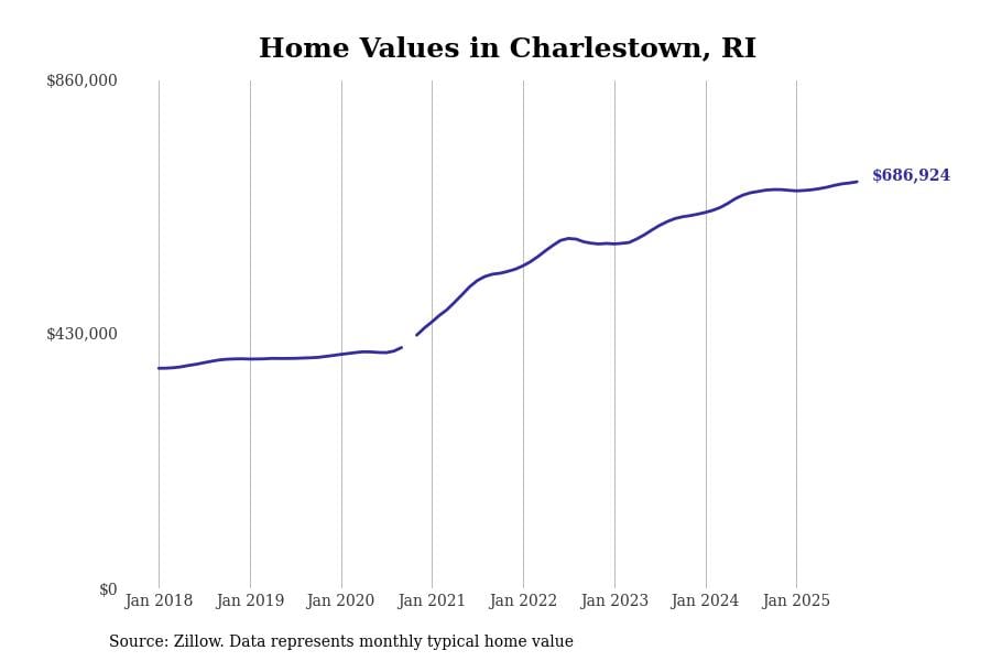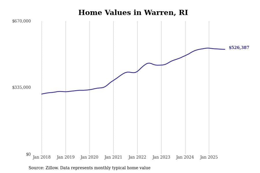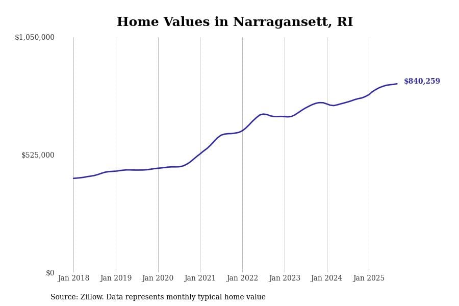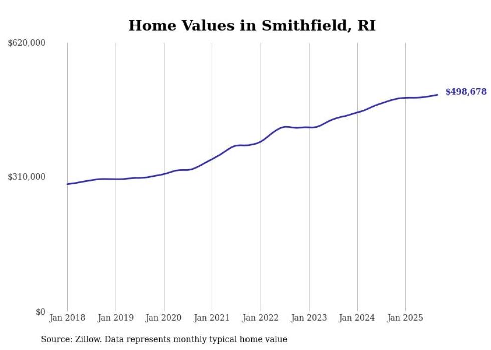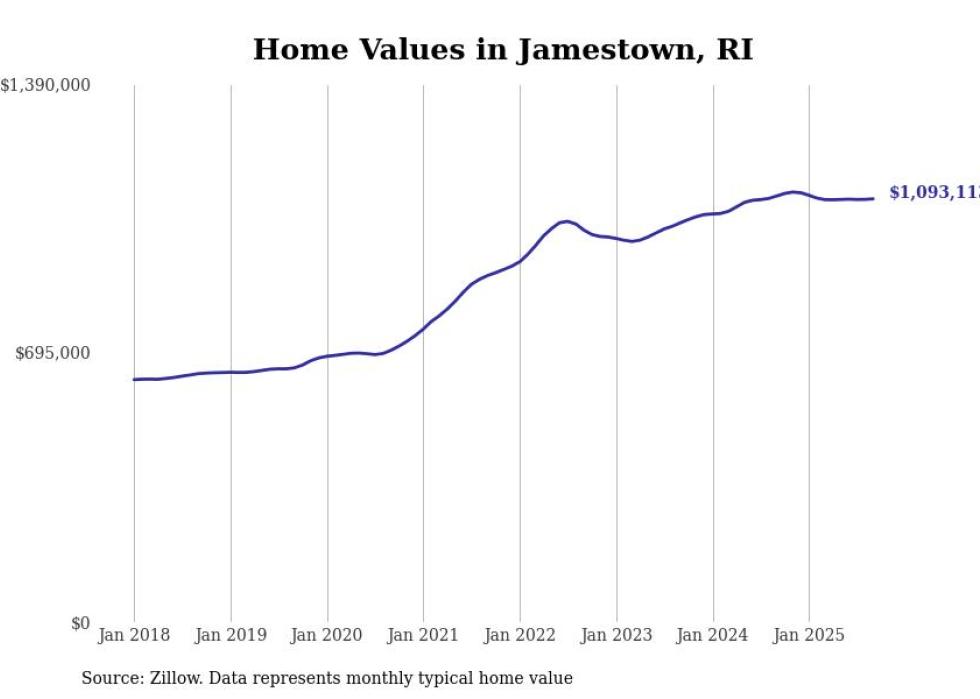 Stacker compiled a list of cities with the fastest-growing home prices in Rhode Island using data from Zillow. Cities are ranked by the dollar change in the Zillow Home Values Index for all homes from the 12 months ending September 2025. The charts in this story were created automatically using Matplotlib. Data was available for 41 cities and towns in Rhode Island.