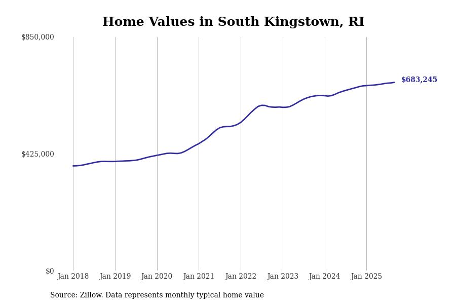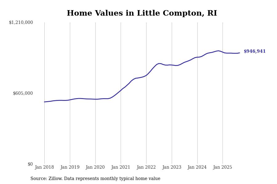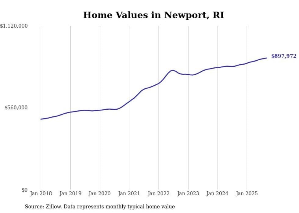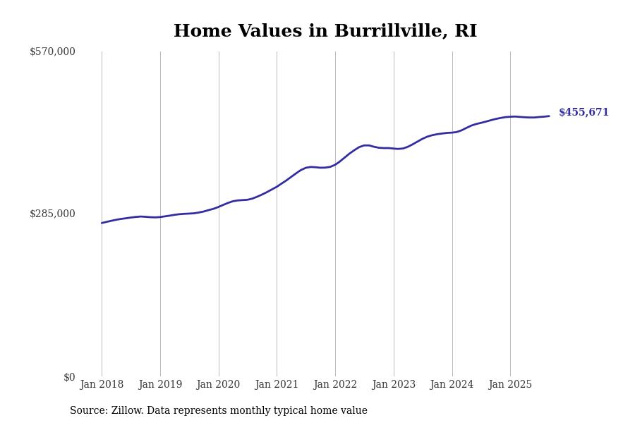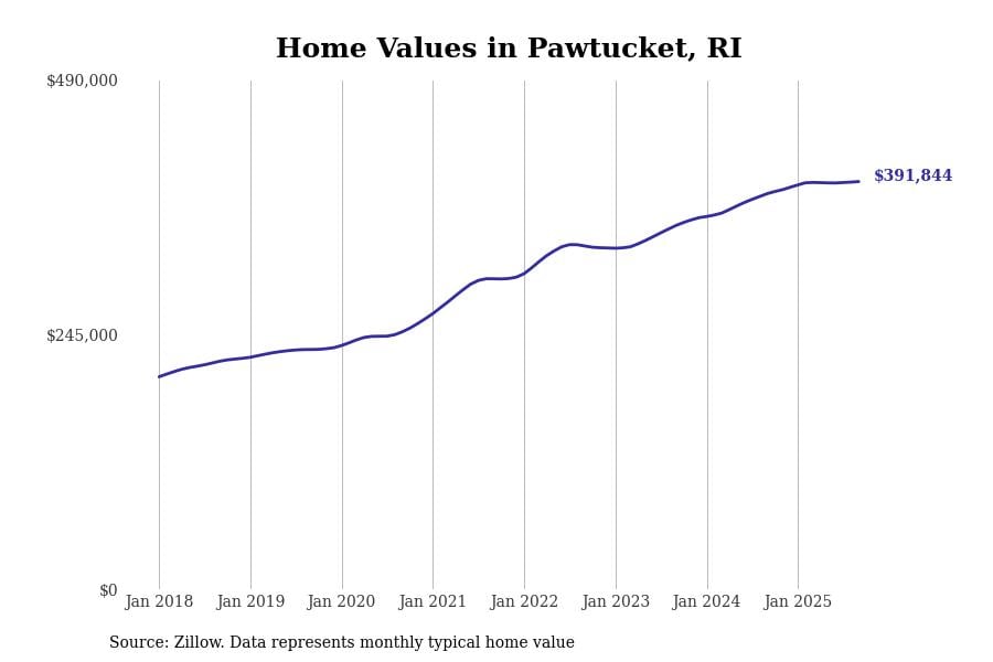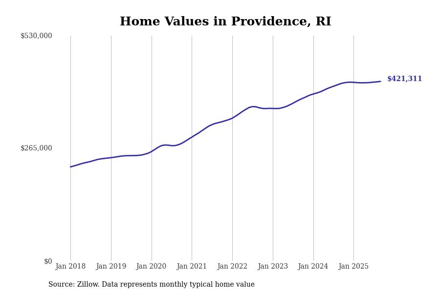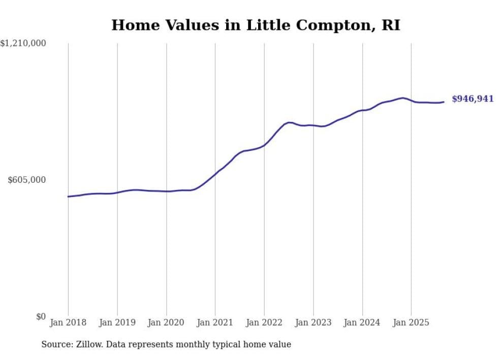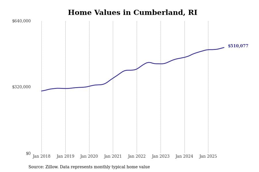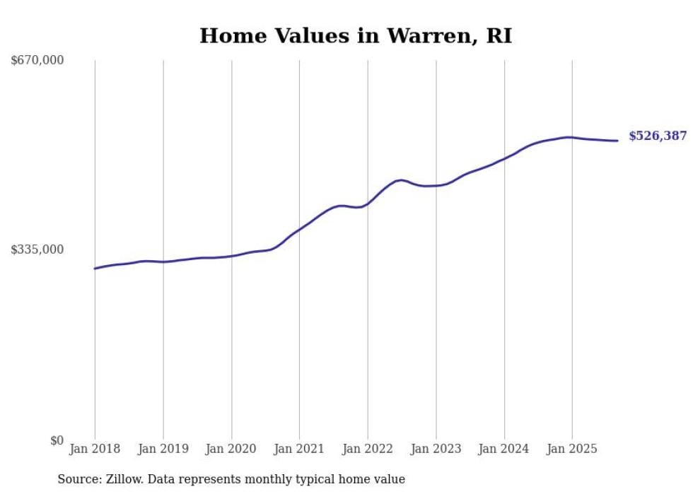 Stacker compiled a list of cities with the fastest-growing home prices in Rhode Island using data from Zillow. Cities are ranked by the dollar change in the Zillow Home Values Index for all homes from the 12 months ending September 2025. The charts in this story were created automatically using Matplotlib. Data was available for 41 cities and towns in Rhode Island.