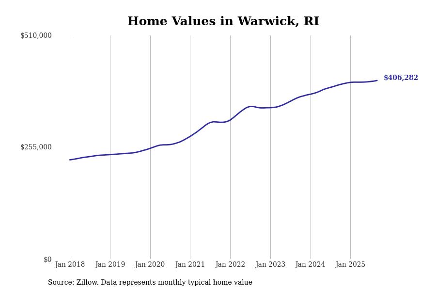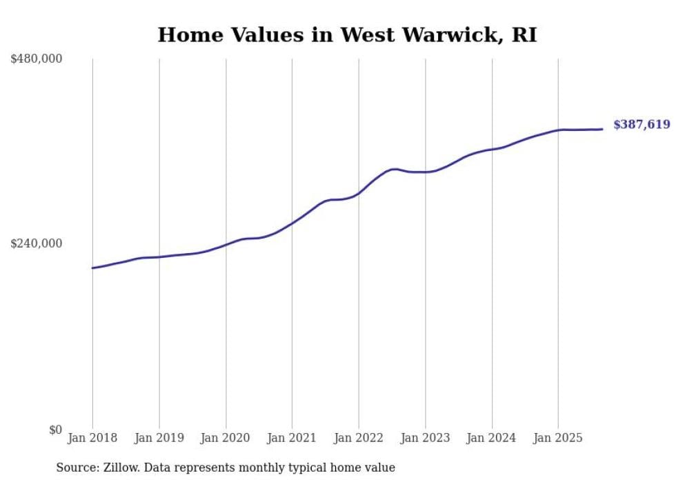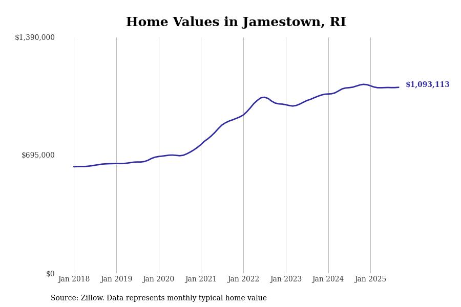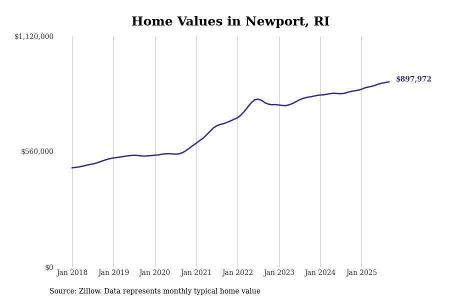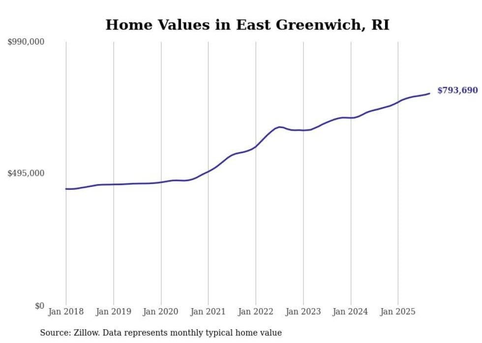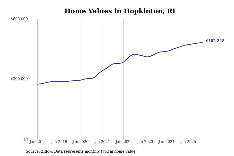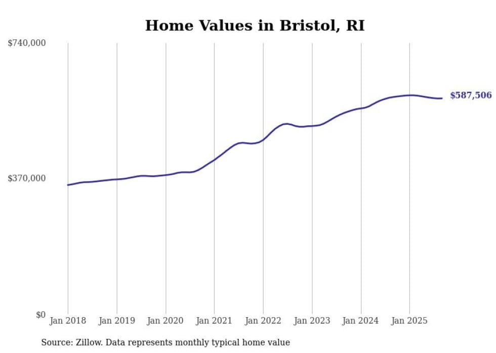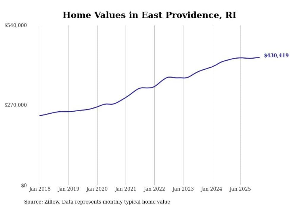 Stacker compiled a list of cities with the fastest-growing home prices in Rhode Island using data from Zillow. Cities are ranked by the dollar change in the Zillow Home Values Index for all homes from the 12 months ending September 2025. The charts in this story were created automatically using Matplotlib. Data was available for 41 cities and towns in Rhode Island.