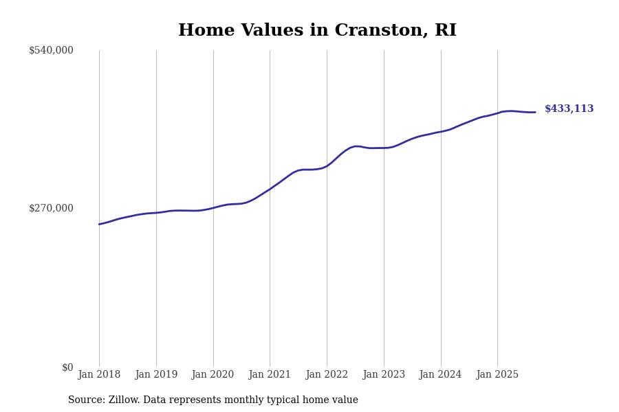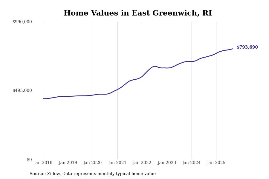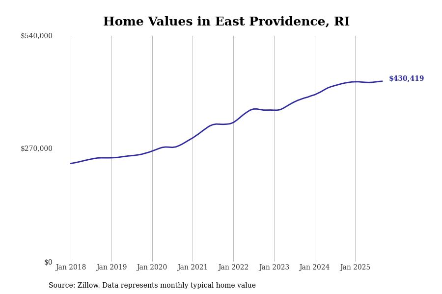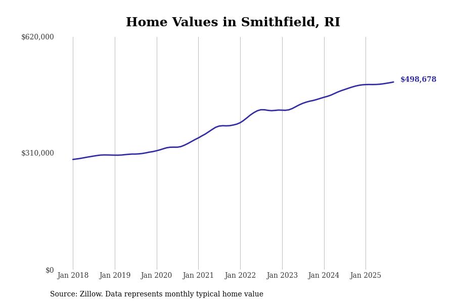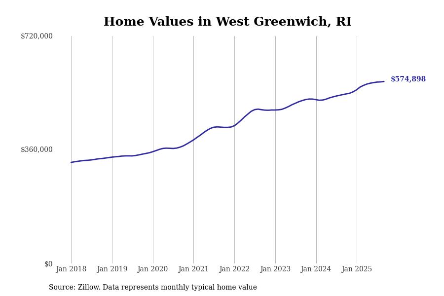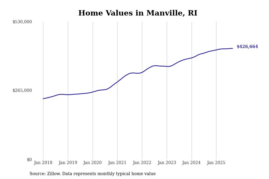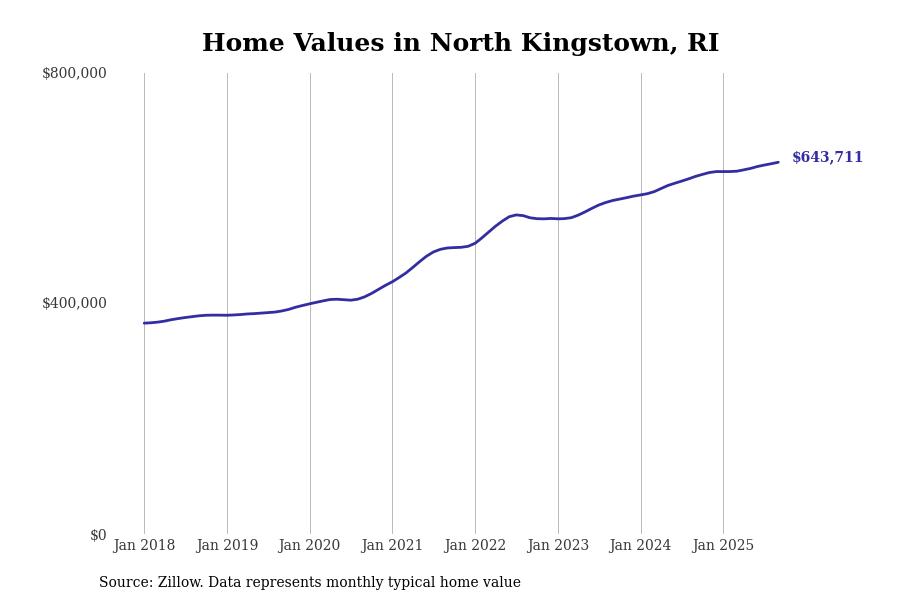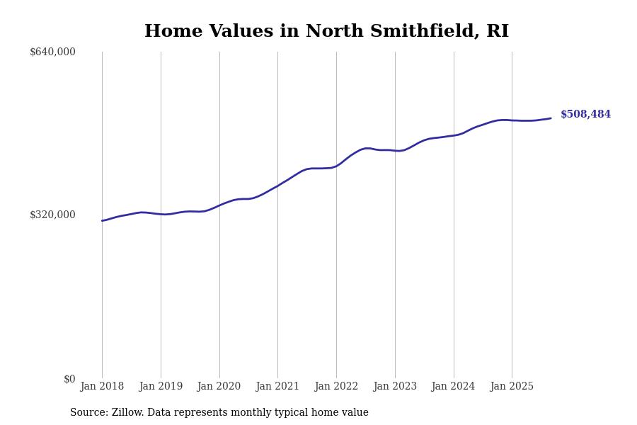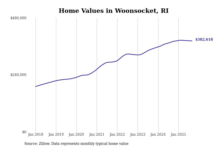 Stacker compiled a list of cities with the fastest-growing home prices in Rhode Island using data from Zillow. Cities are ranked by the dollar change in the Zillow Home Values Index for all homes from the 12 months ending September 2025. The charts in this story were created automatically using Matplotlib. Data was available for 41 cities and towns in Rhode Island.