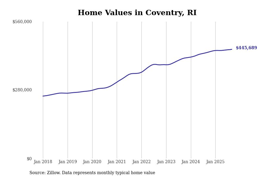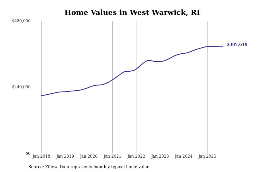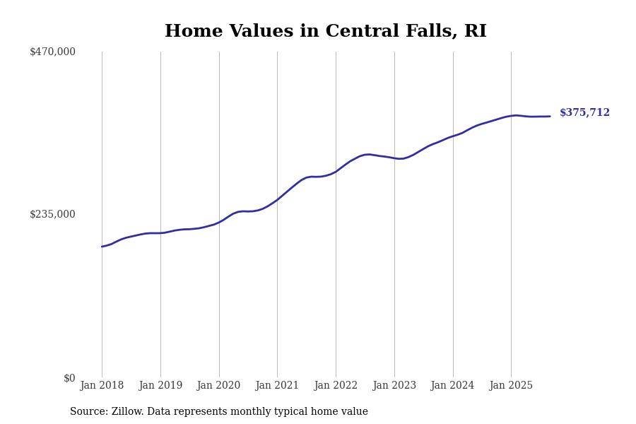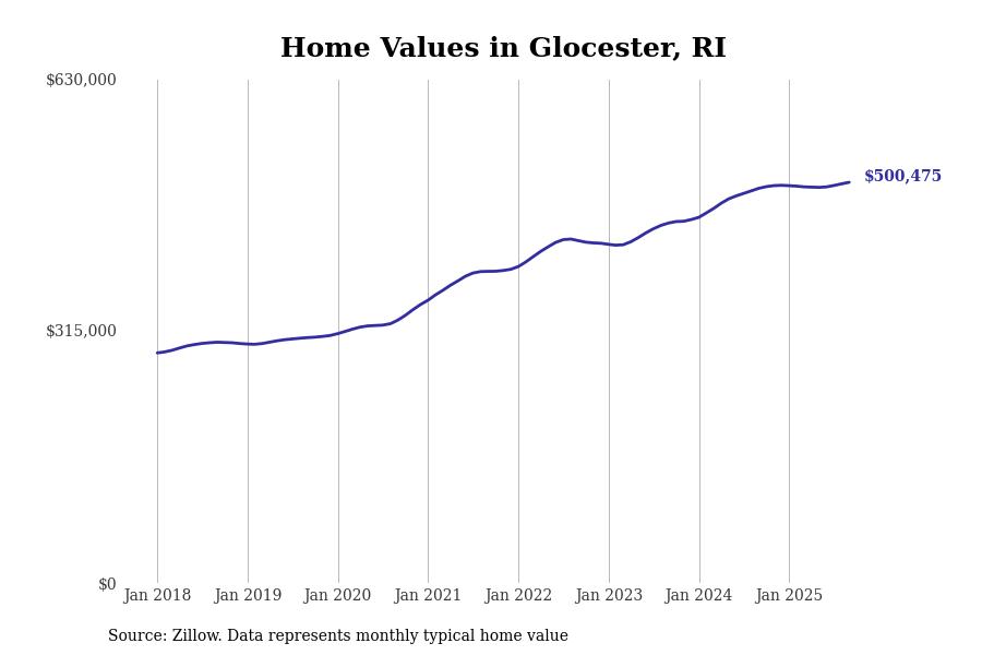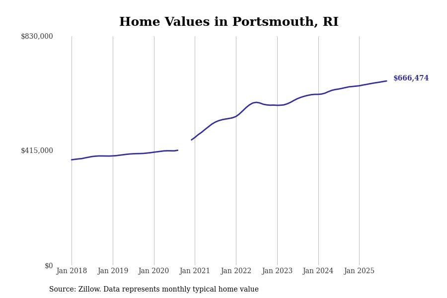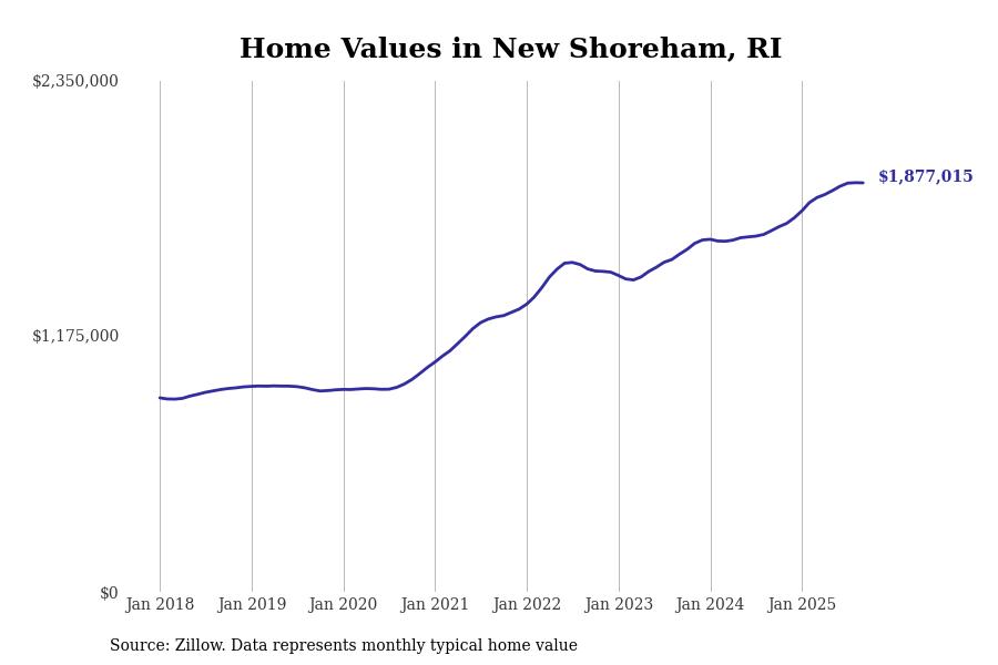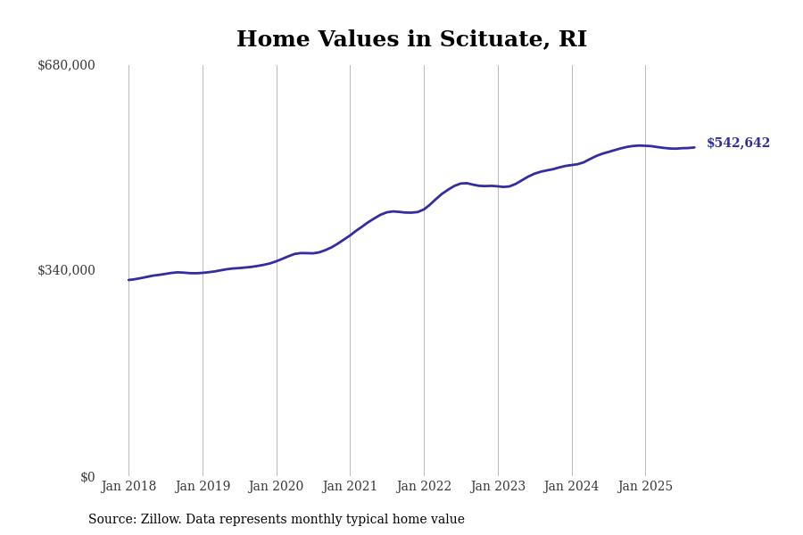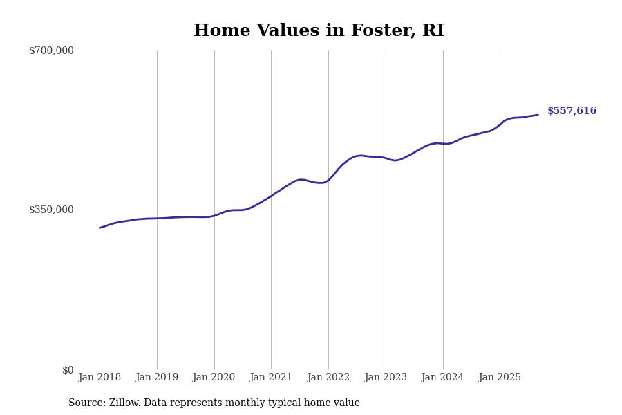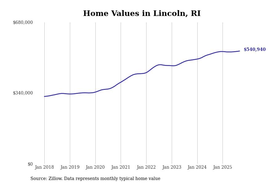 Stacker compiled a list of cities with the fastest-growing home prices in Rhode Island using data from Zillow. Cities are ranked by the dollar change in the Zillow Home Values Index for all homes from the 12 months ending September 2025. The charts in this story were created automatically using Matplotlib. Data was available for 41 cities and towns in Rhode Island.