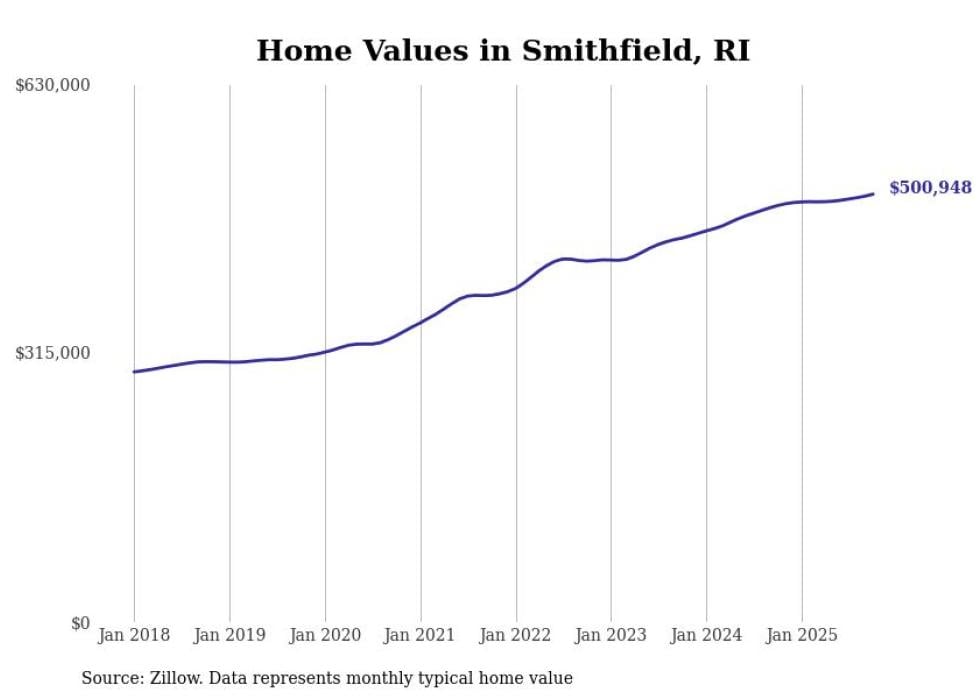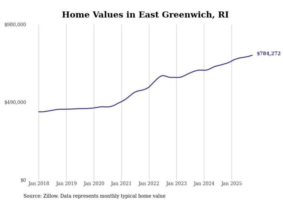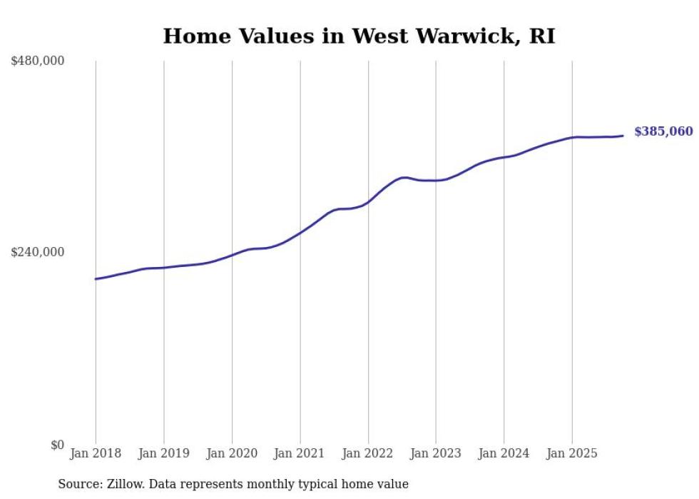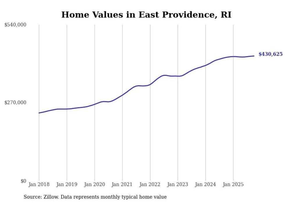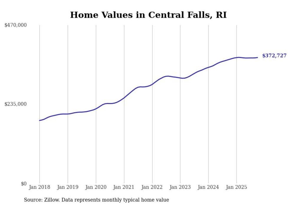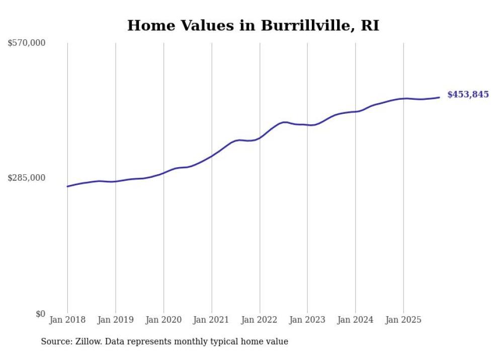 Stacker compiled a list of cities with the fastest-growing home prices in Rhode Island using data from Zillow. Cities are ranked by the dollar change in the Zillow Home Values Index for all homes from the 12 months ending October 2025. The charts in this story were created automatically using Matplotlib. Data was available for 41 cities and towns in Rhode Island.
