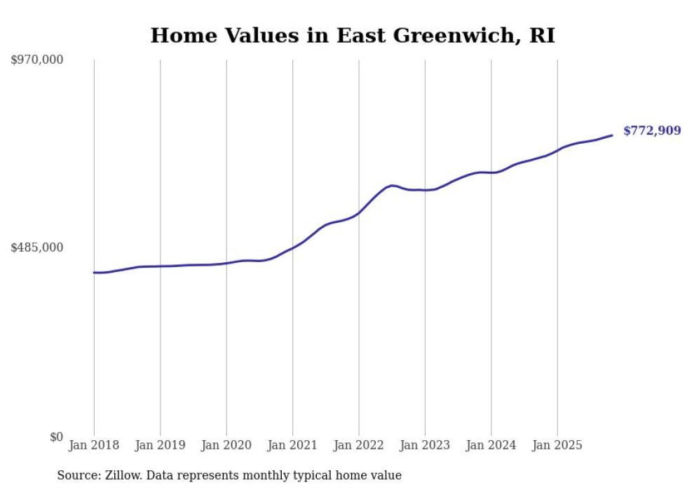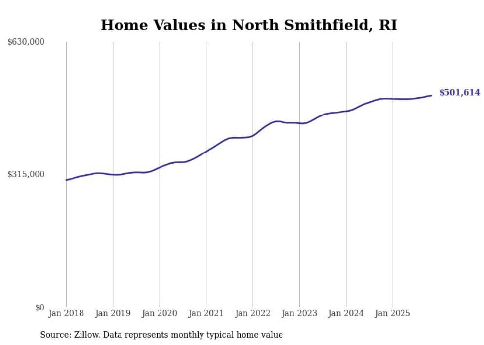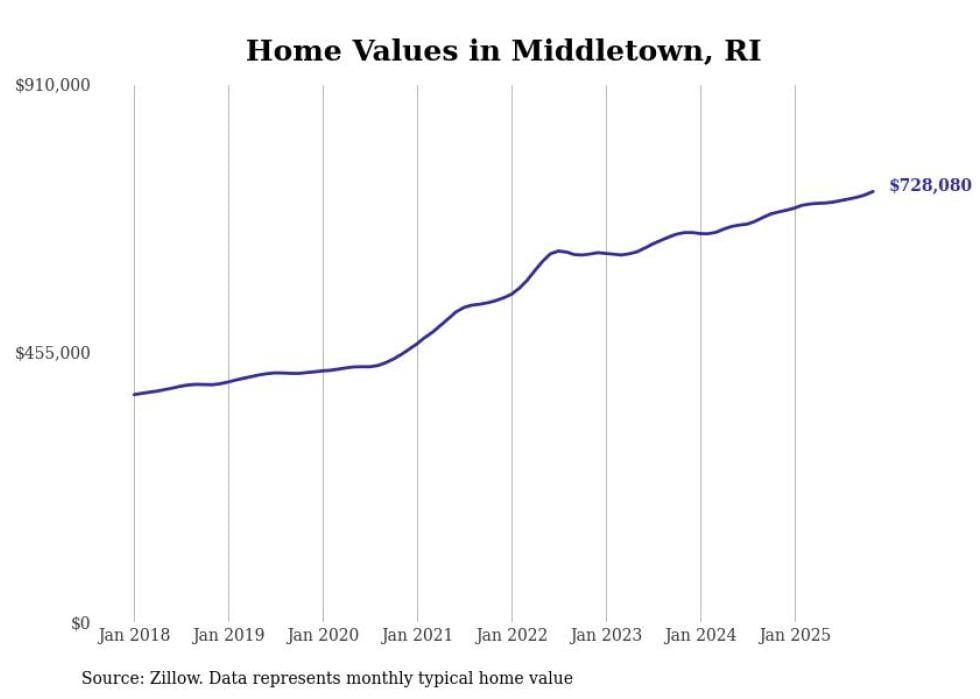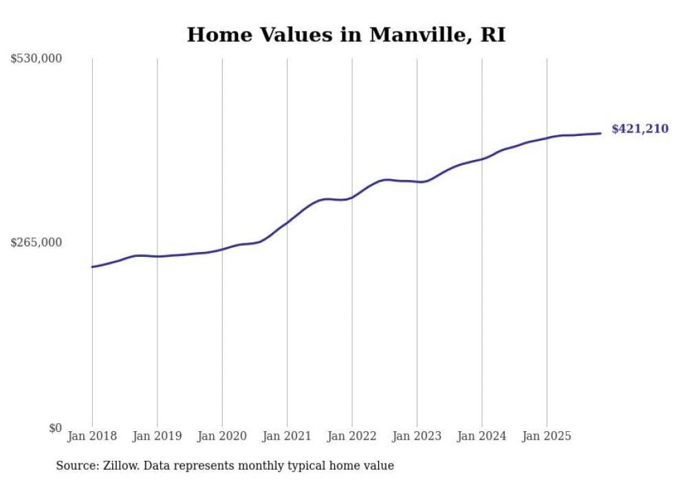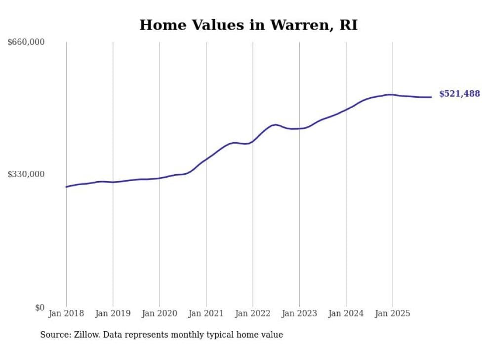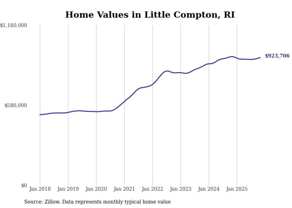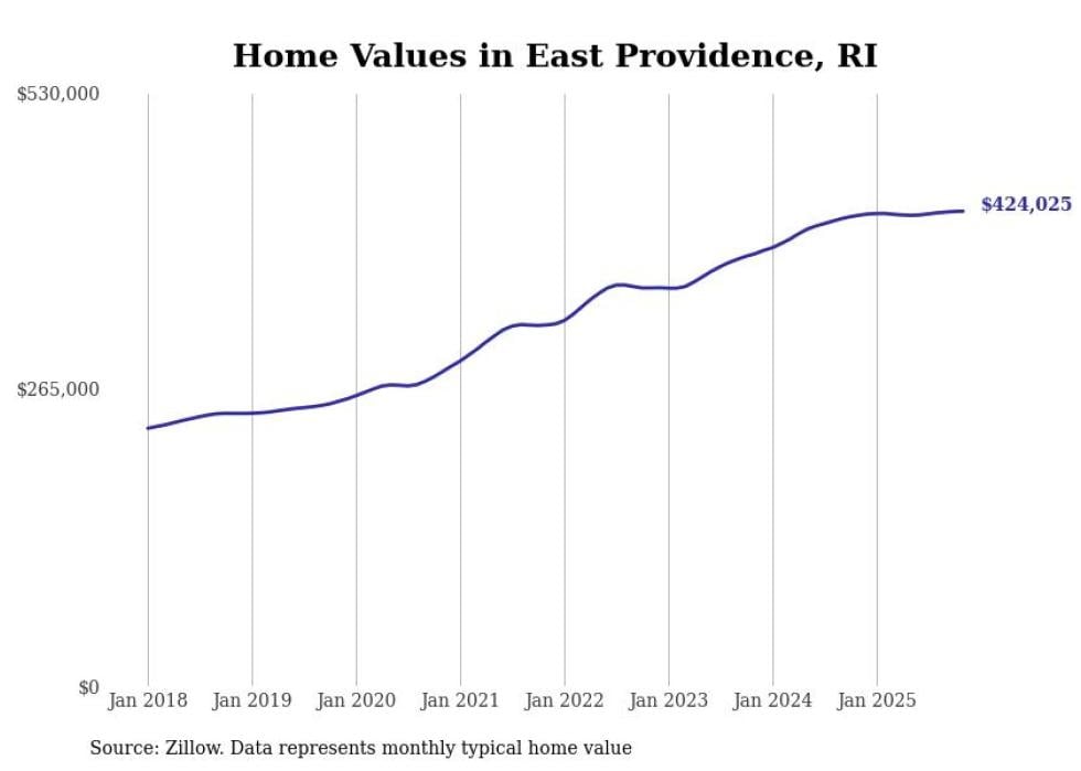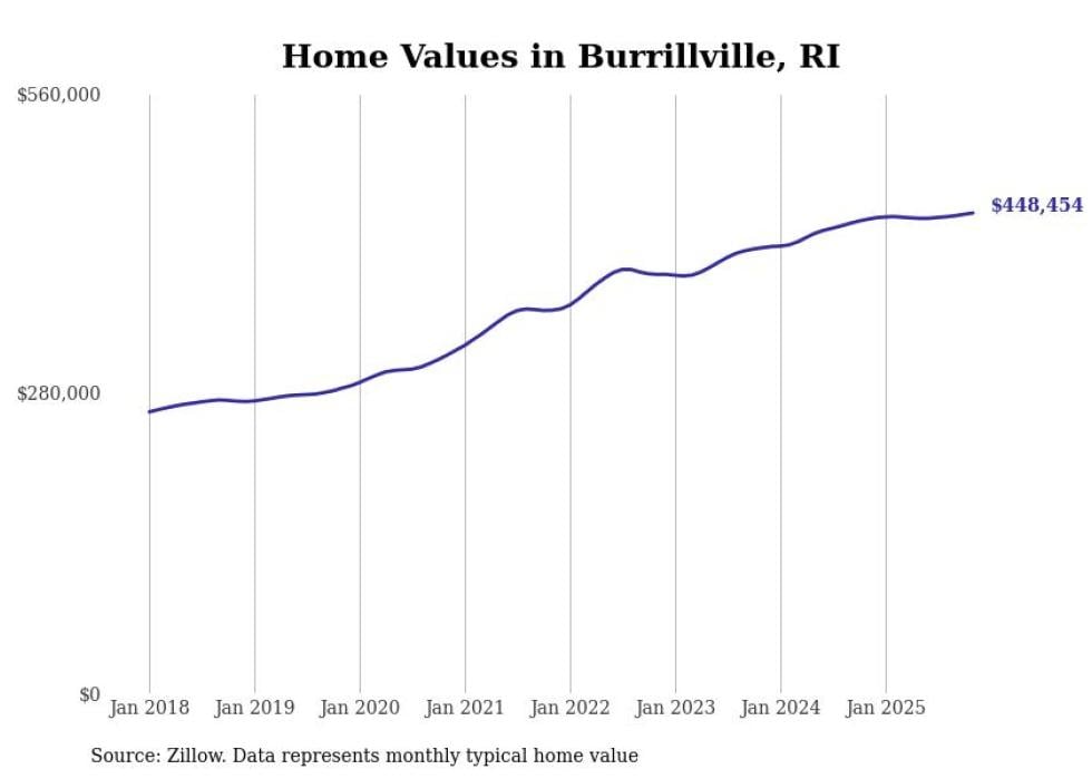 Stacker compiled a list of cities with the fastest-growing home prices in Rhode Island using data from Zillow. Cities are ranked by the dollar change in the Zillow Home Values Index for all homes from the 12 months ending November 2025. The charts in this story were created automatically using Matplotlib. Data was available for 41 cities and towns in Rhode Island.
