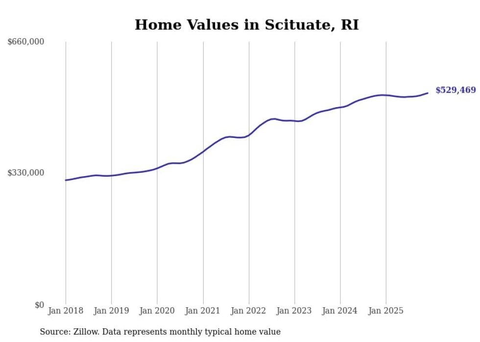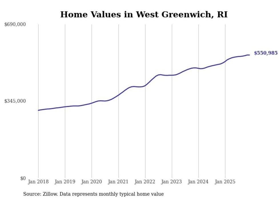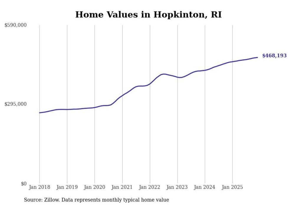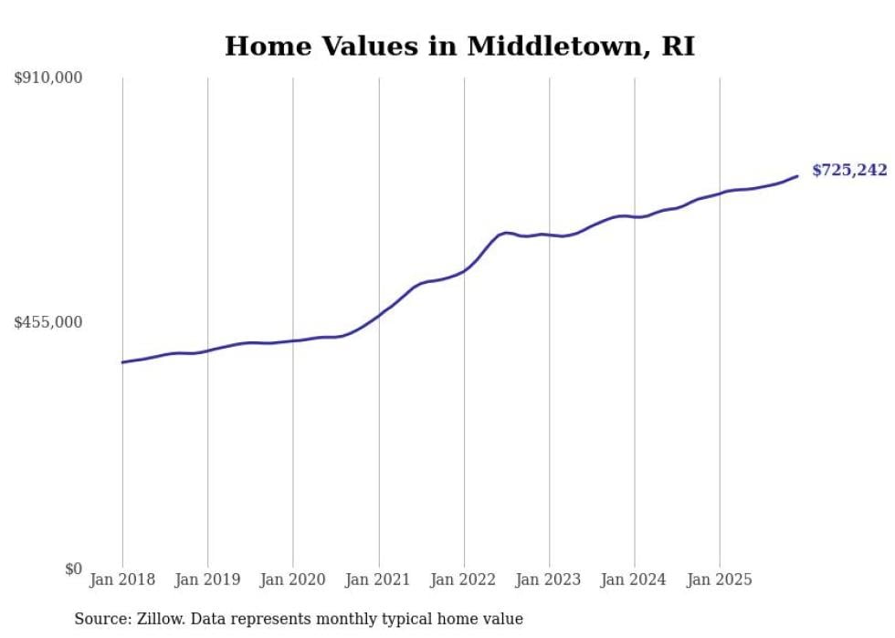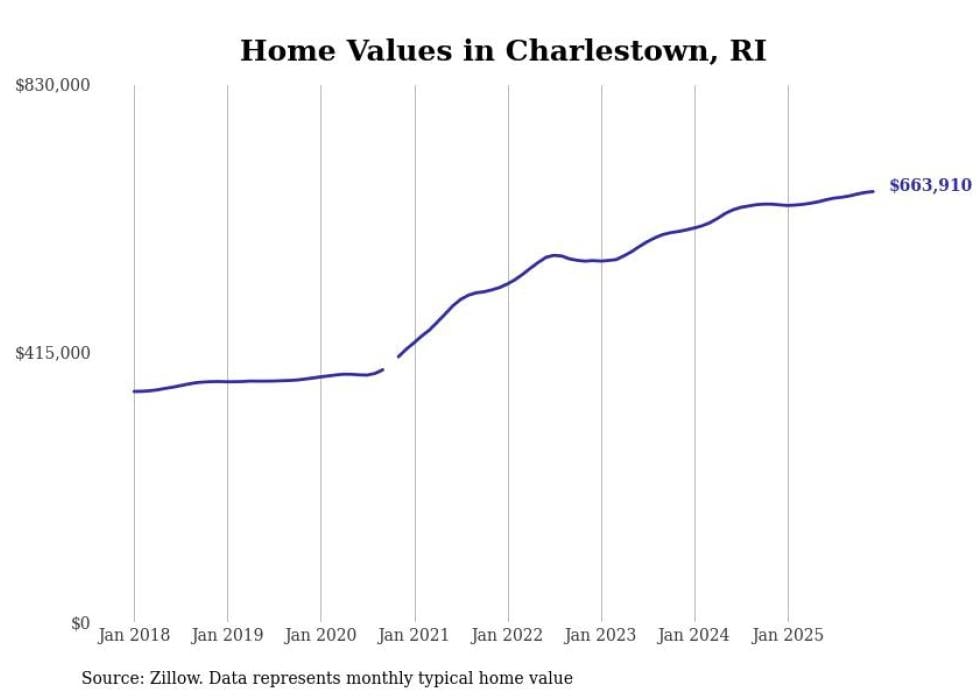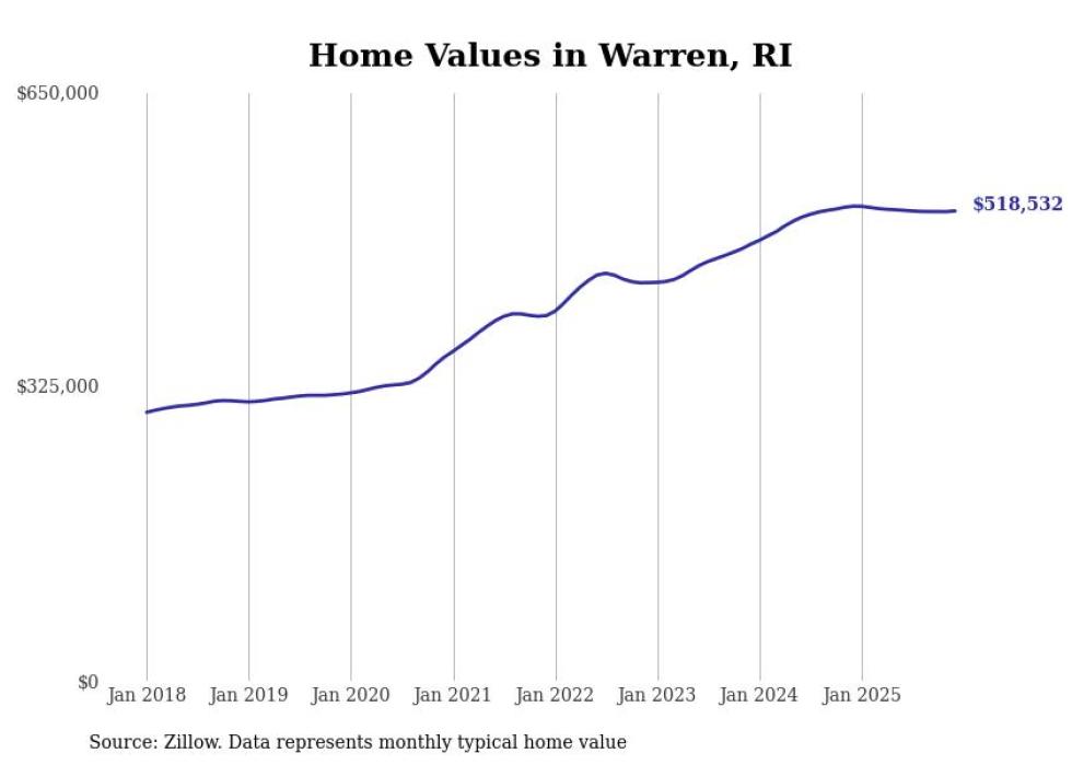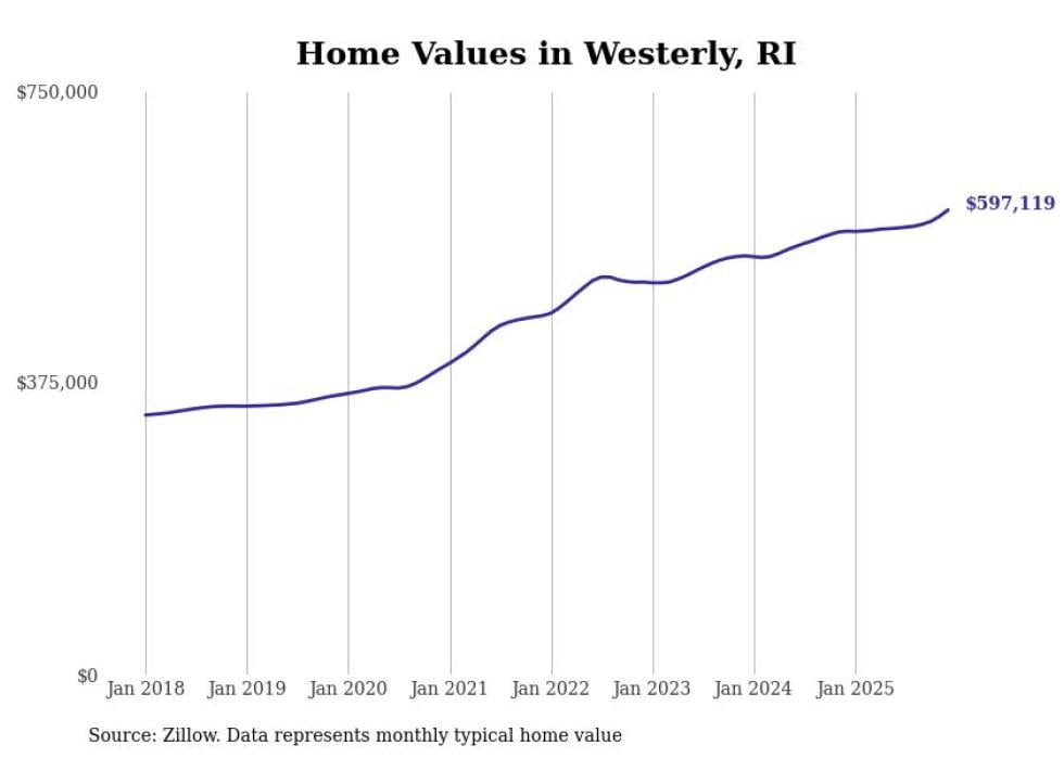 Stacker compiled a list of cities with the most expensive homes in Rhode Island using data from Zillow. Cities are ranked by the Zillow Home Values Index for all homes as of December 2025. The charts in this story were created automatically using Matplotlib.