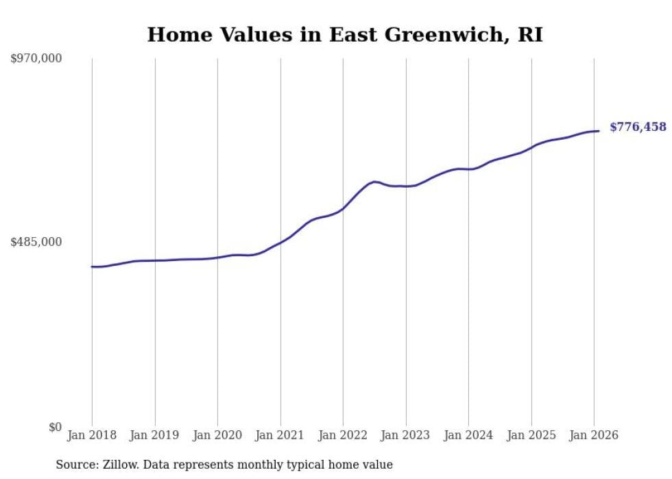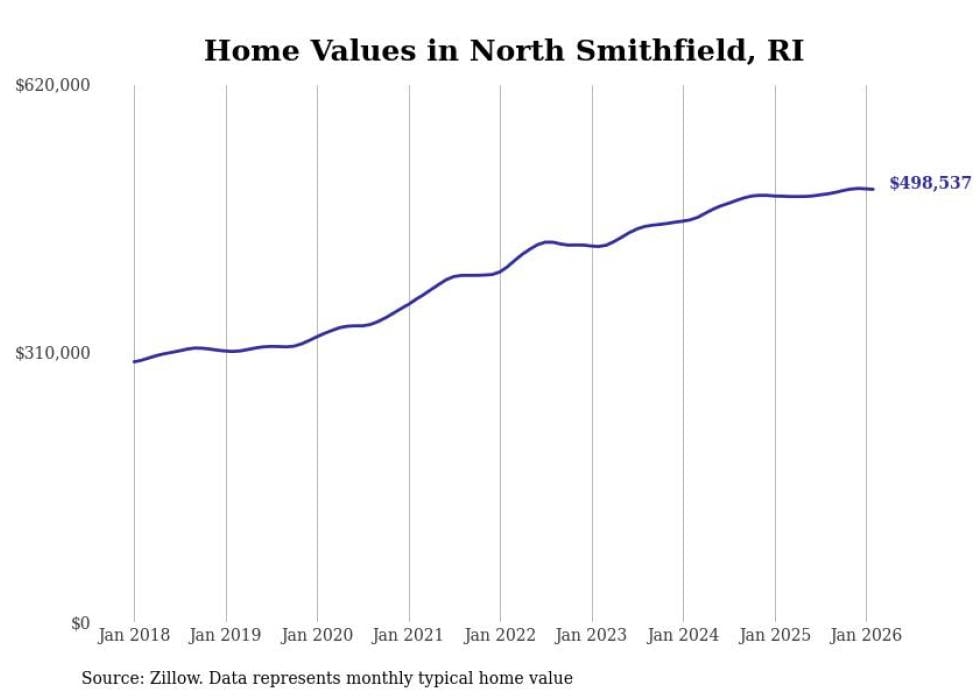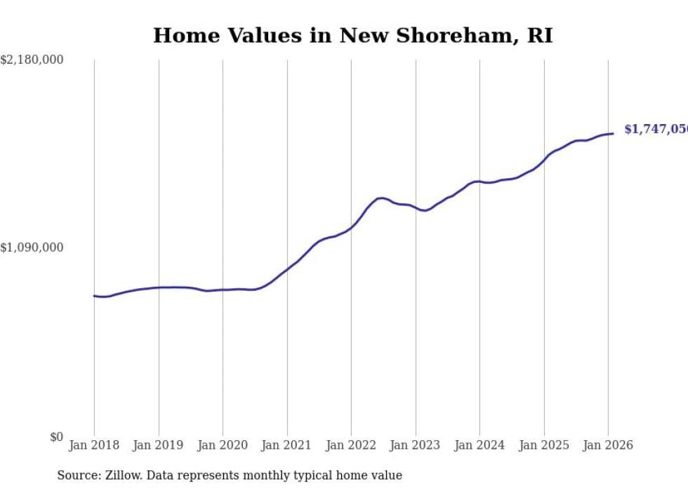 Stacker compiled a list of cities with the most expensive homes in Rhode Island using data from Zillow. Cities are ranked by the Zillow Home Values Index for all homes as of February 2026. The charts in this story were created automatically using Matplotlib.