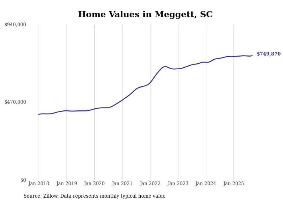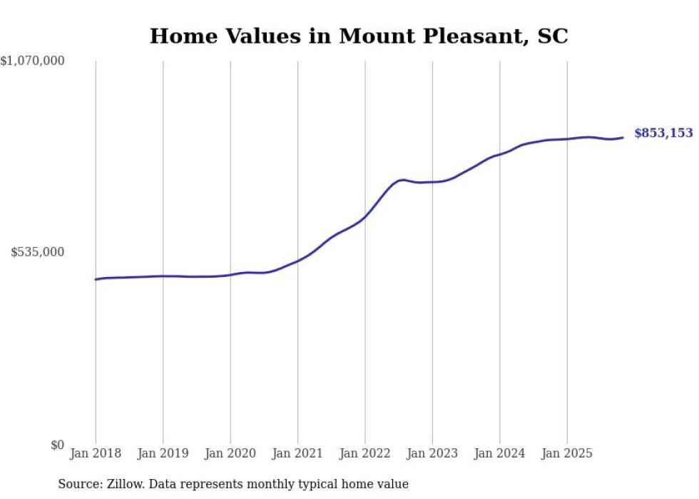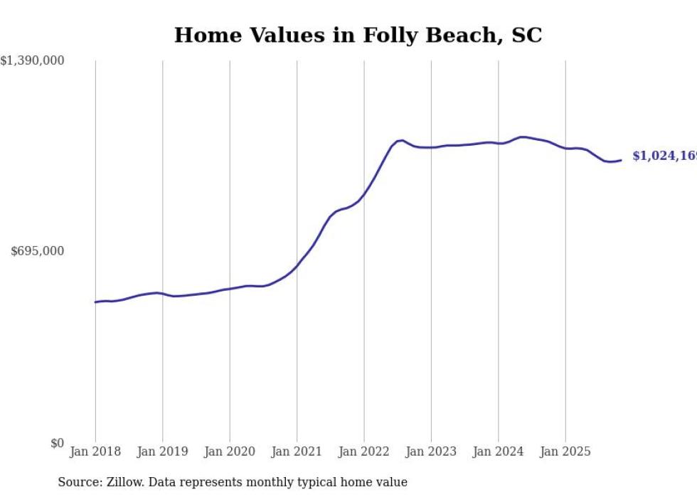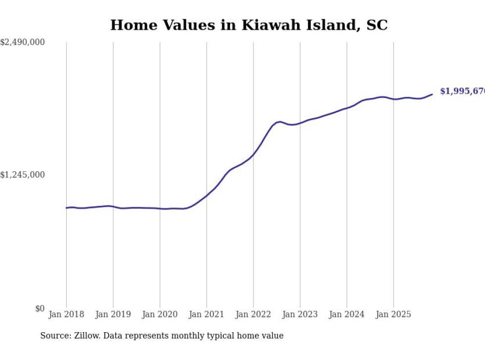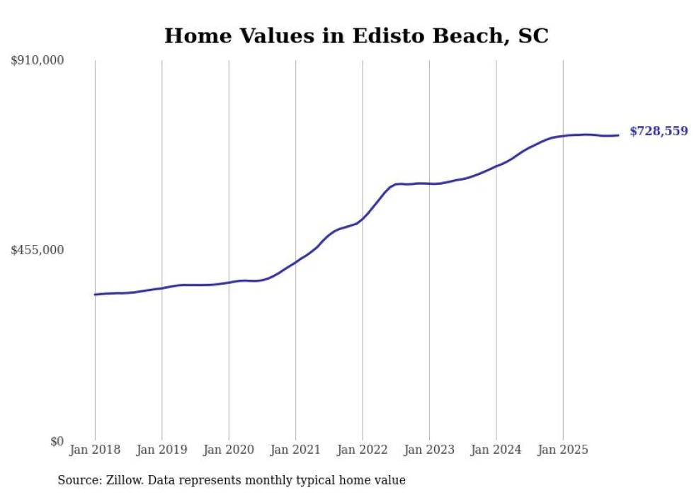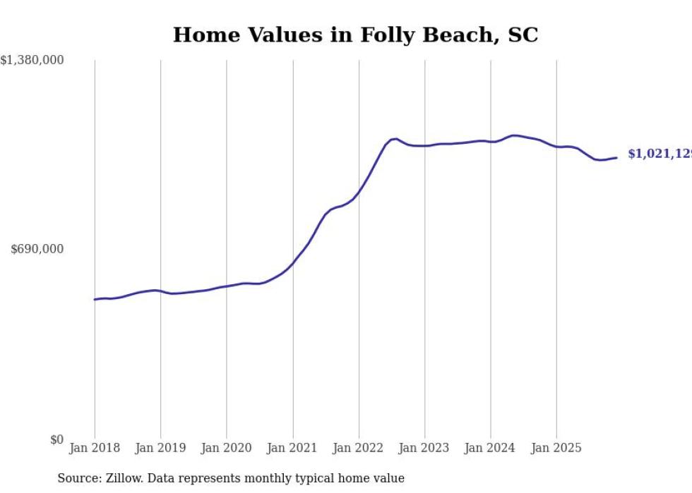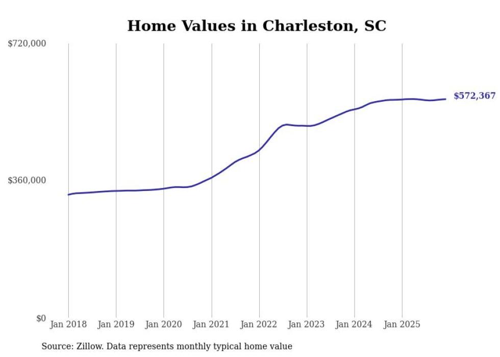 Stacker compiled a list of cities with the most expensive homes in the Charleston, South Carolina metro area using data from Zillow. Charts show the monthly typical home value since January 2018. Data was available for 35 cities and towns.