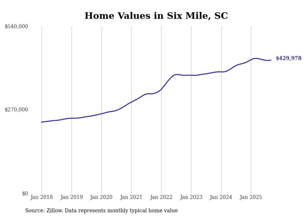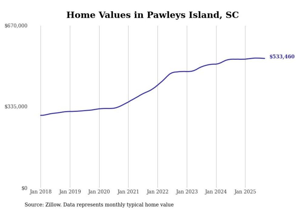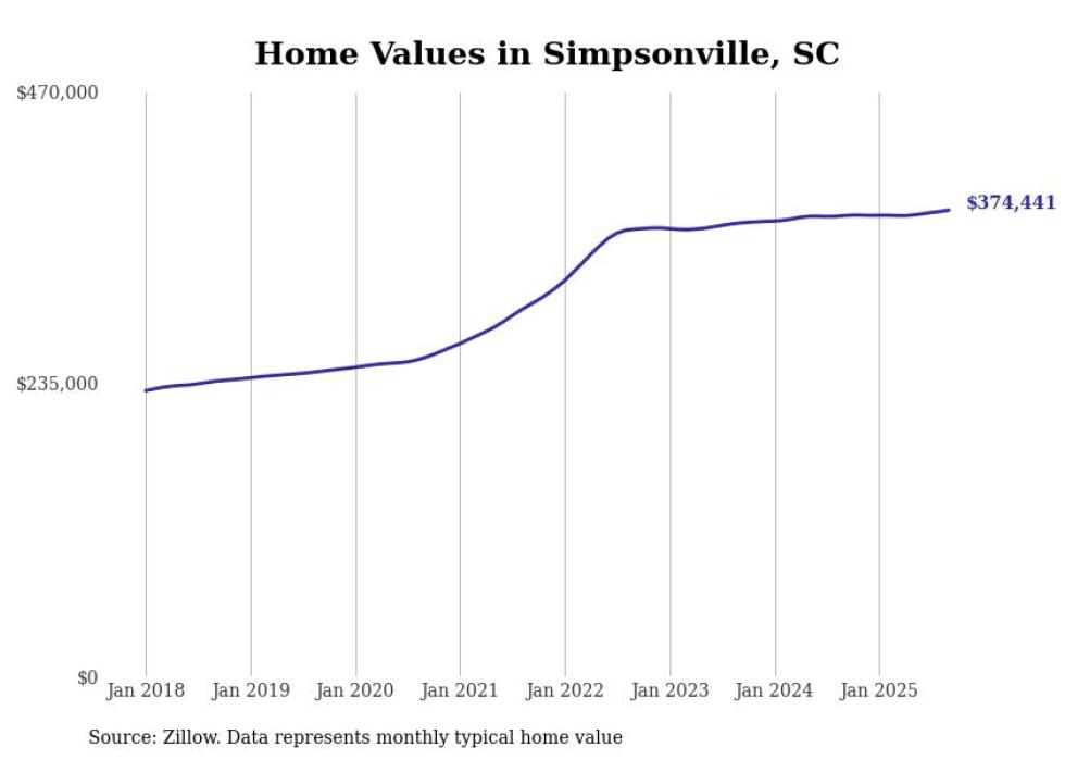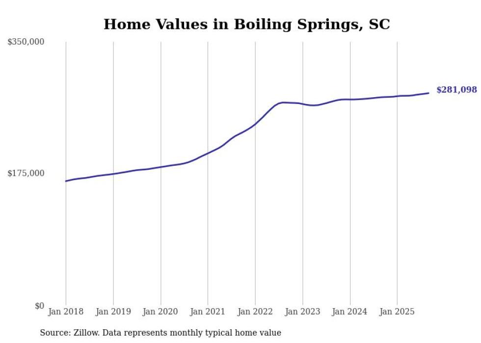 Stacker compiled a list of cities with the fastest-growing home prices in South Carolina using data from Zillow. Cities are ranked by the dollar change in the Zillow Home Values Index for all homes from the 12 months ending September 2025. The charts in this story were created automatically using Matplotlib. Data was available for 50 cities and towns in South Carolina.