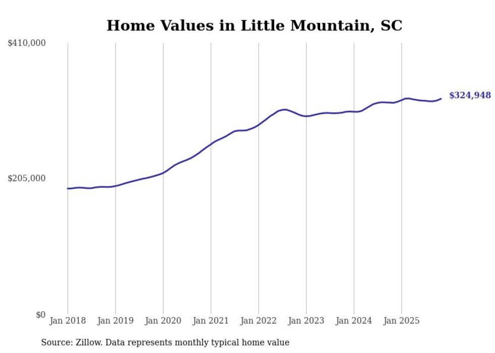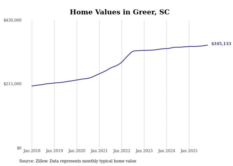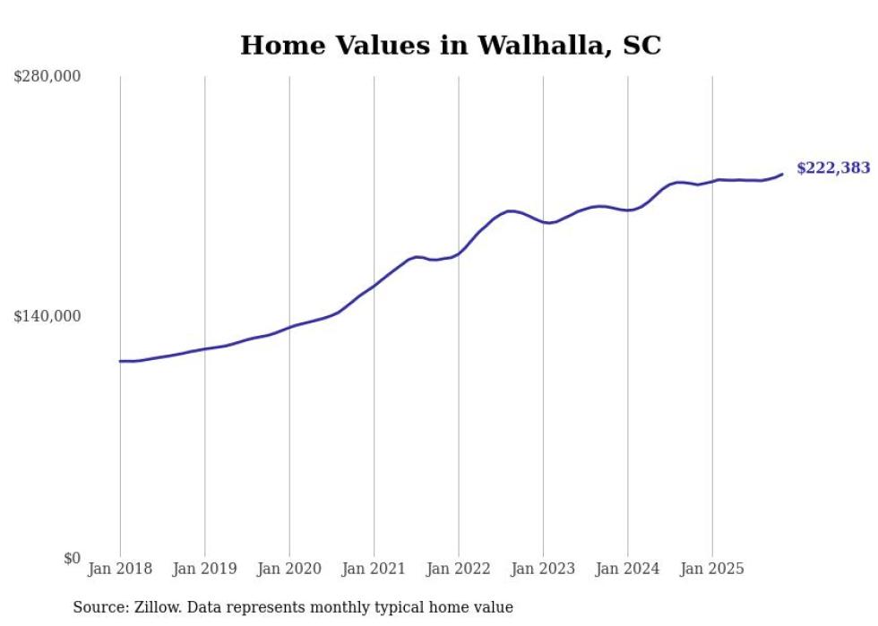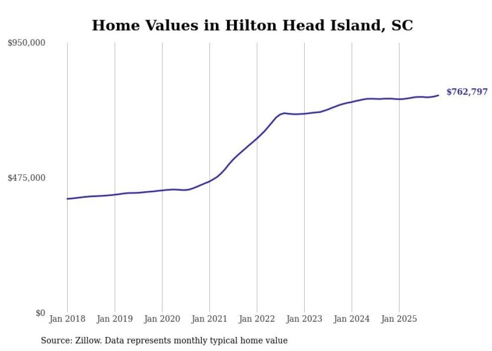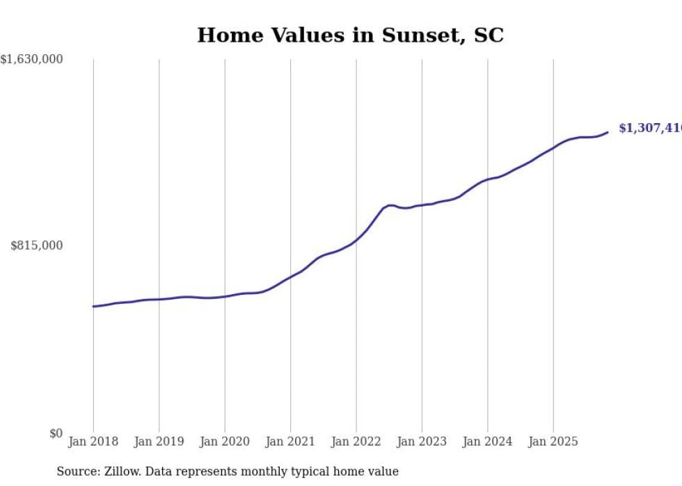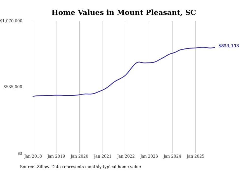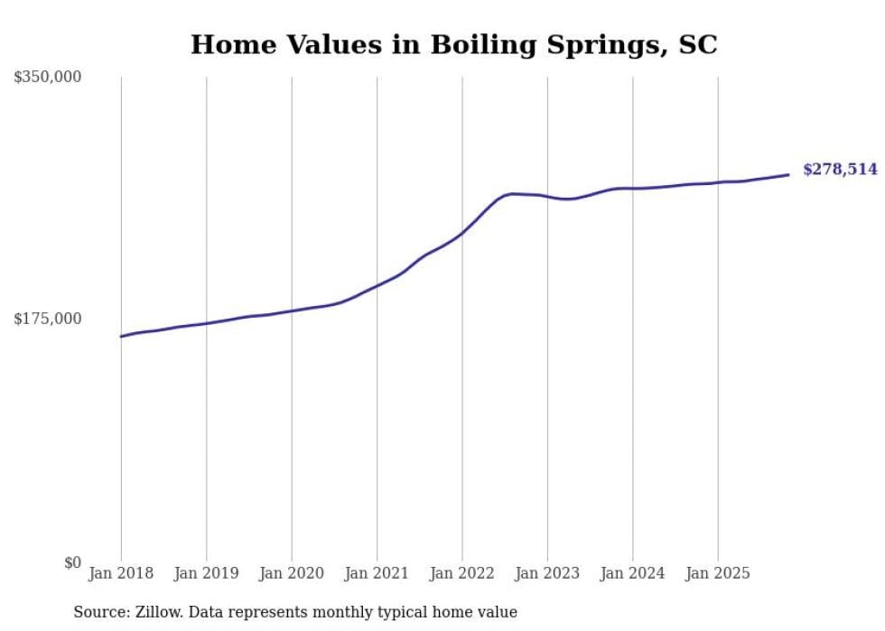 Stacker compiled a list of cities with the fastest-growing home prices in South Carolina using data from Zillow. Cities are ranked by the dollar change in the Zillow Home Values Index for all homes from the 12 months ending November 2025. The charts in this story were created automatically using Matplotlib. Data was available for 50 cities and towns in South Carolina.