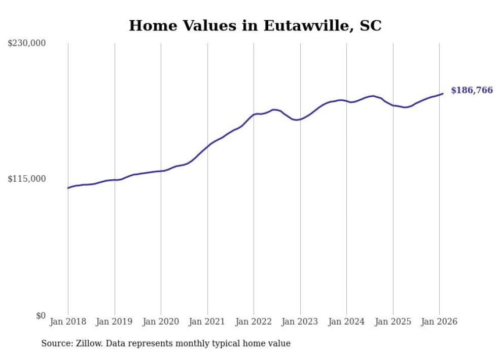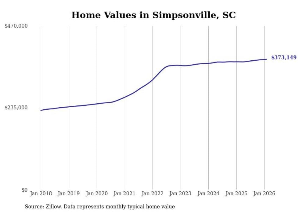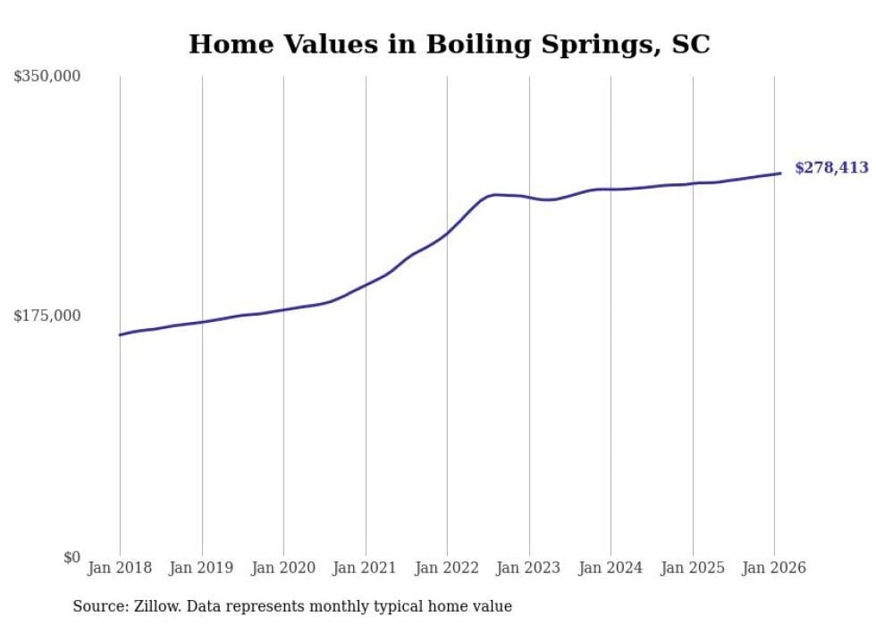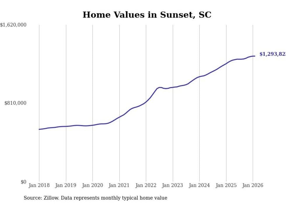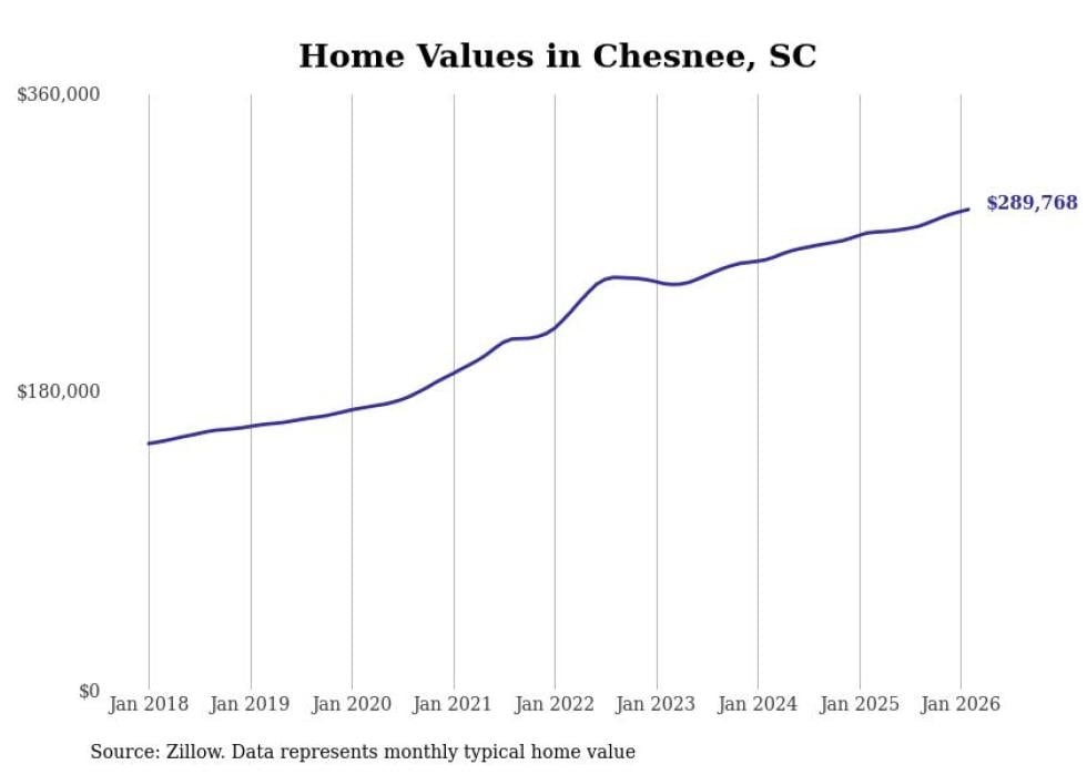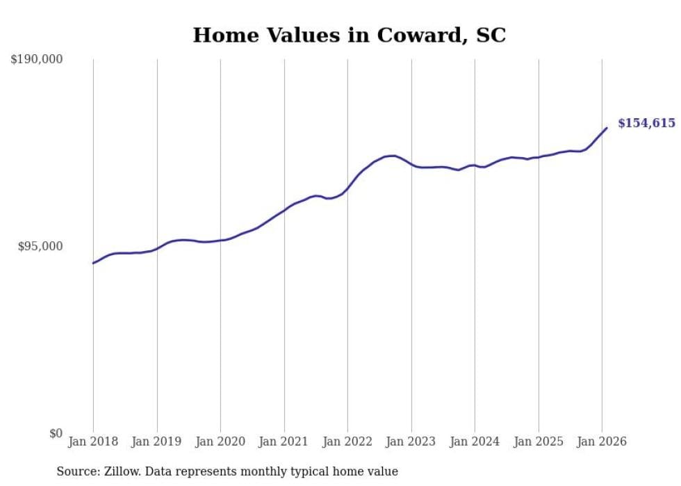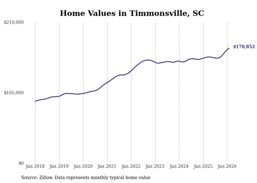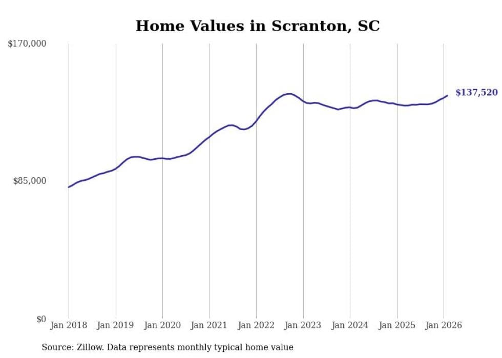 Stacker compiled a list of cities with the fastest-growing home prices in South Carolina using data from Zillow. Cities are ranked by the dollar change in the Zillow Home Values Index for all homes from the 12 months ending February 2026. The charts in this story were created automatically using Matplotlib. Data was available for 50 cities and towns in South Carolina.