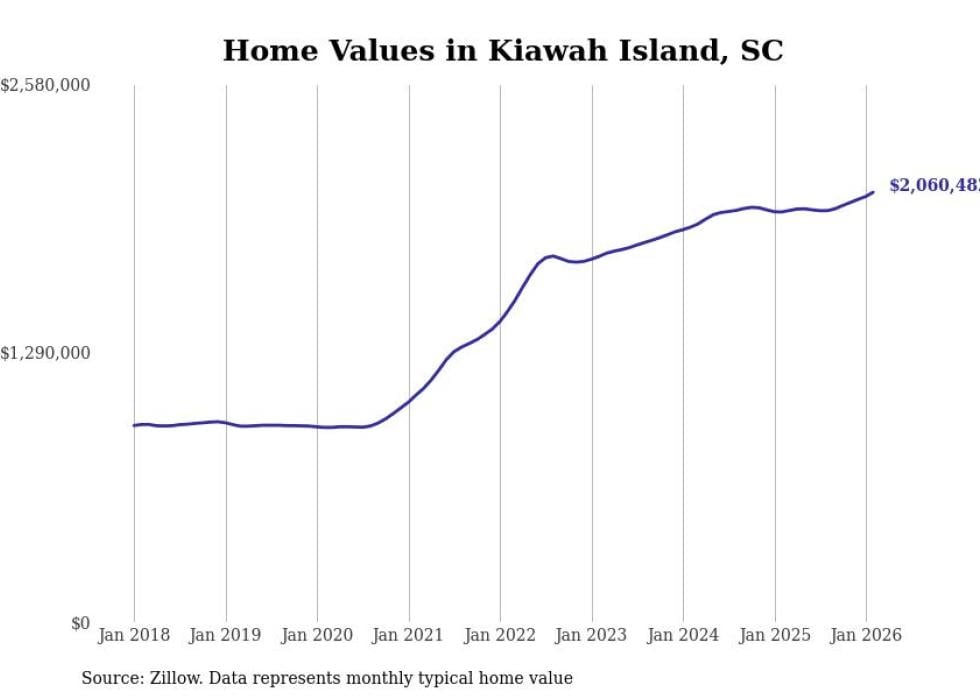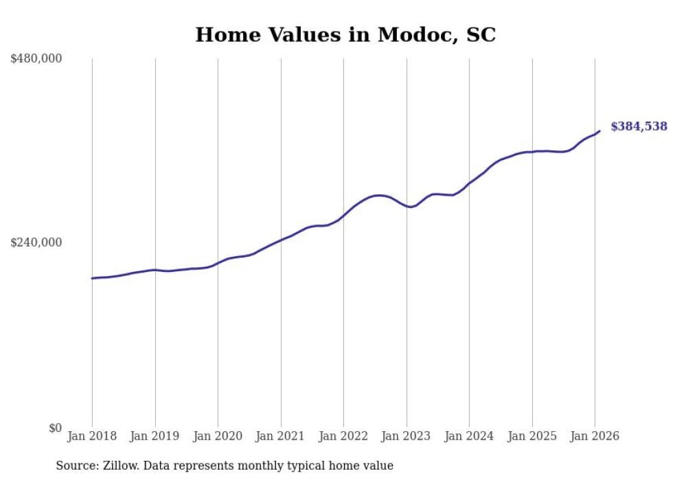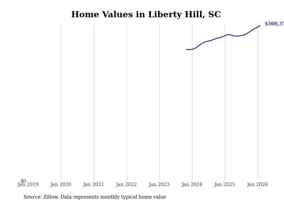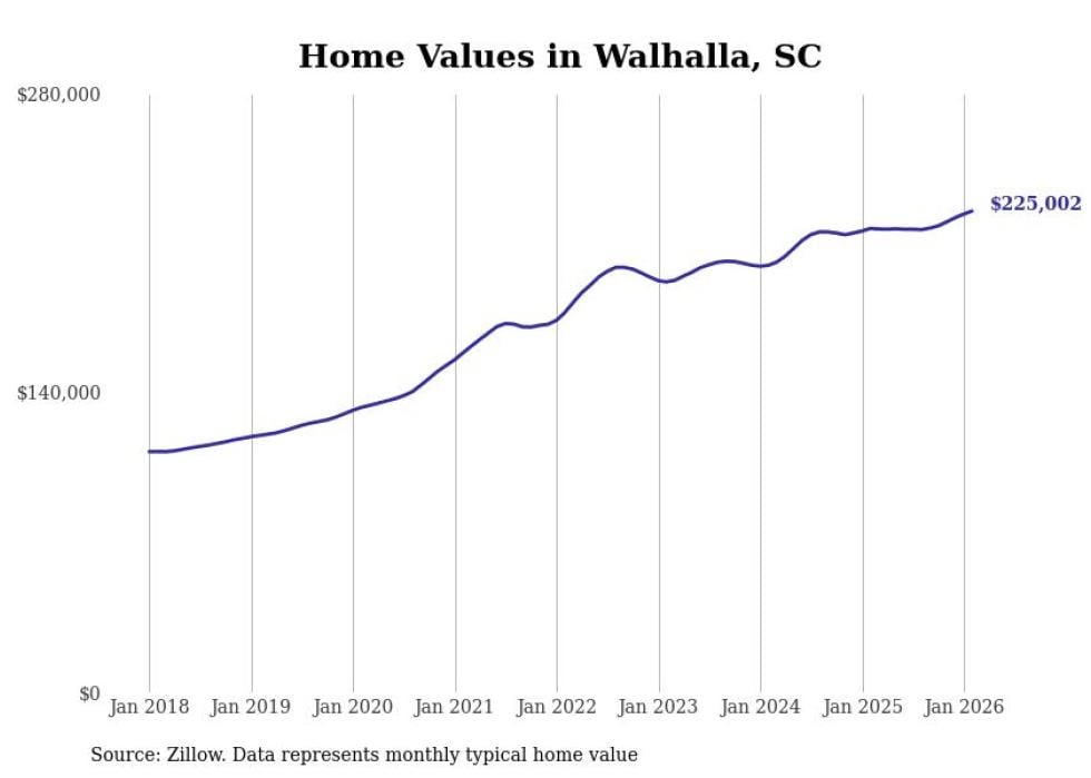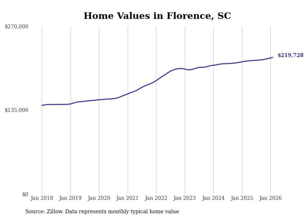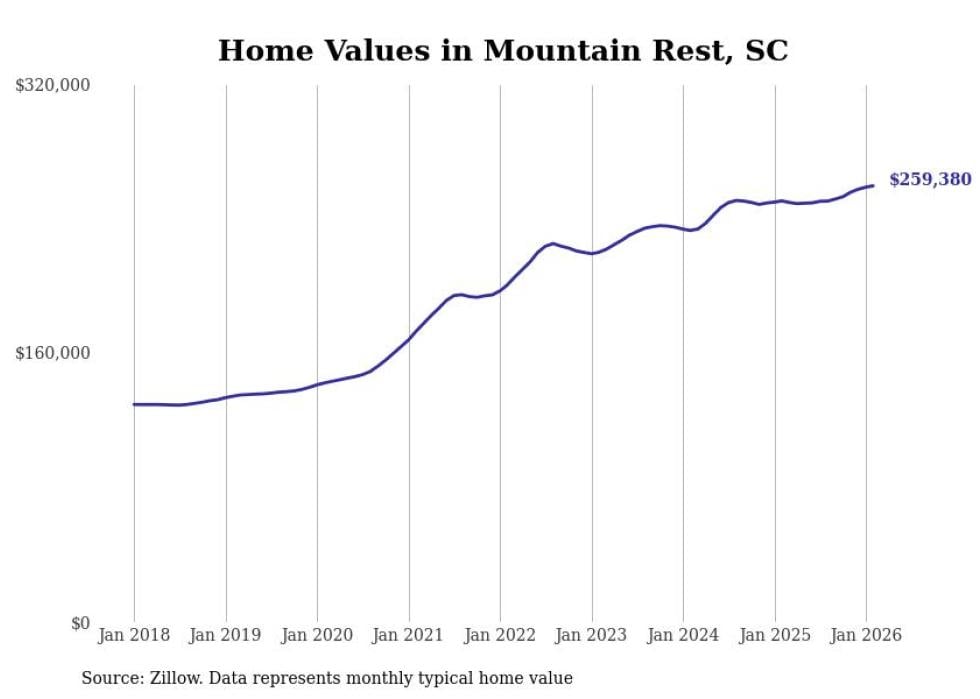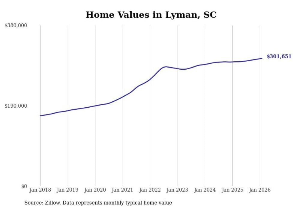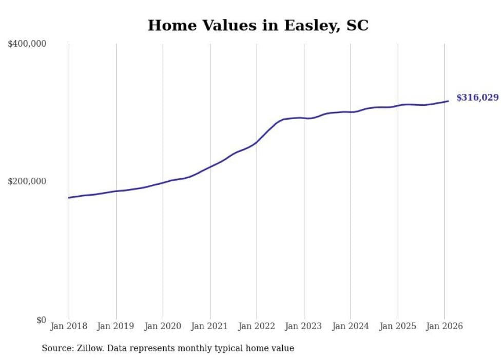 Stacker compiled a list of cities with the fastest-growing home prices in South Carolina using data from Zillow. Cities are ranked by the dollar change in the Zillow Home Values Index for all homes from the 12 months ending February 2026. The charts in this story were created automatically using Matplotlib. Data was available for 50 cities and towns in South Carolina.