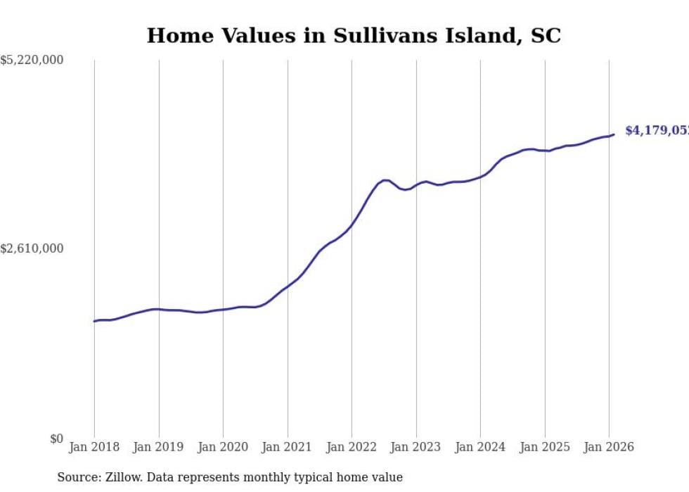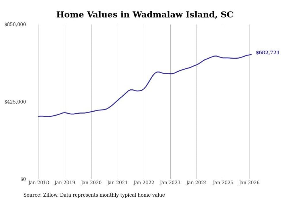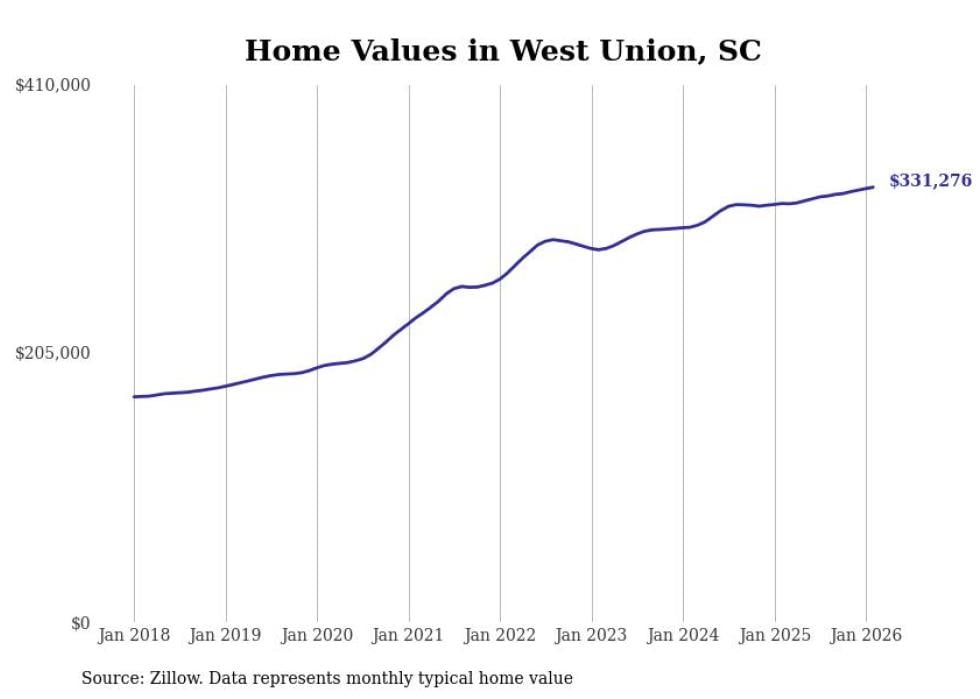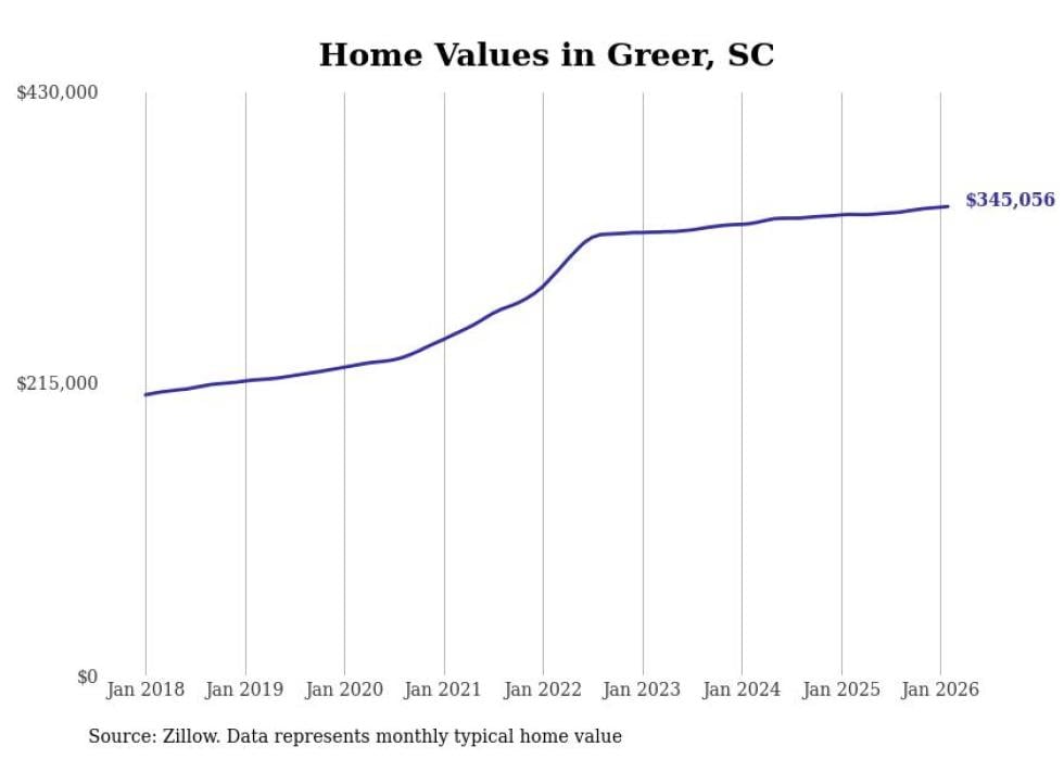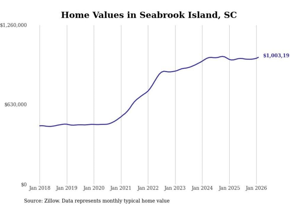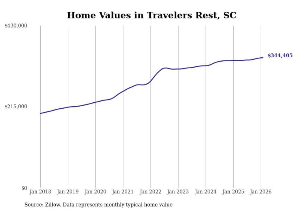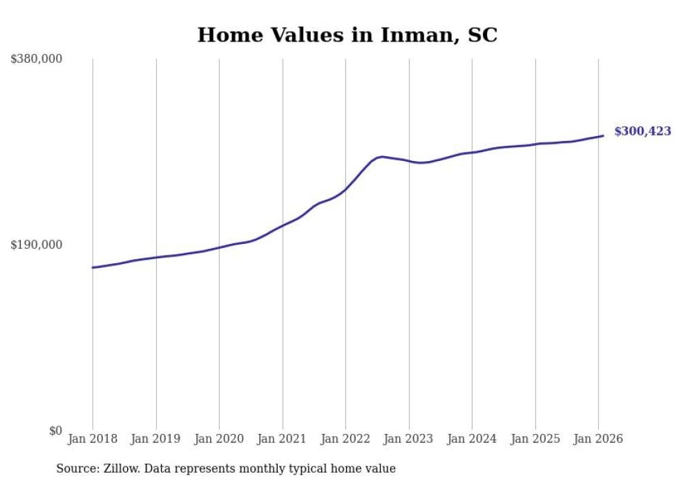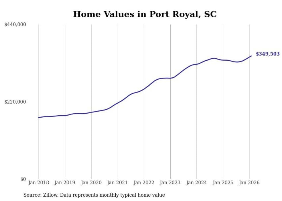Stacker compiled a list of cities with the fastest-growing home prices in South Carolina using data from Zillow. Cities are ranked by the dollar change in the Zillow Home Values Index for all homes from the 12 months ending February 2026. The charts in this story were created automatically using Matplotlib. Data was available for 50 cities and towns in South Carolina.