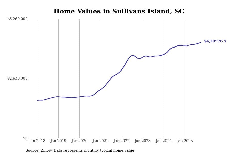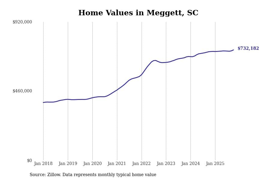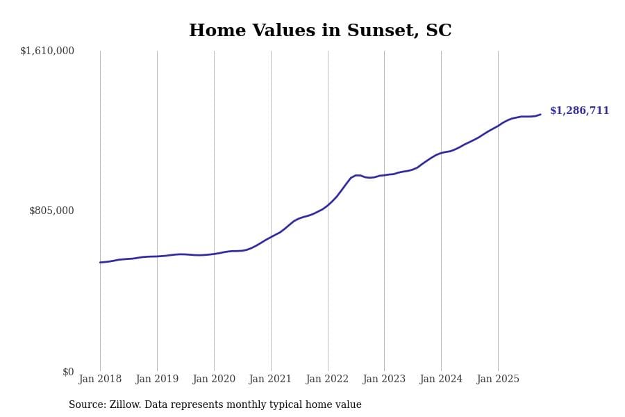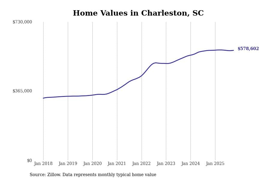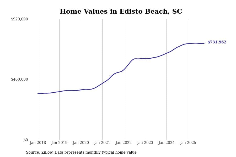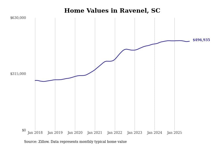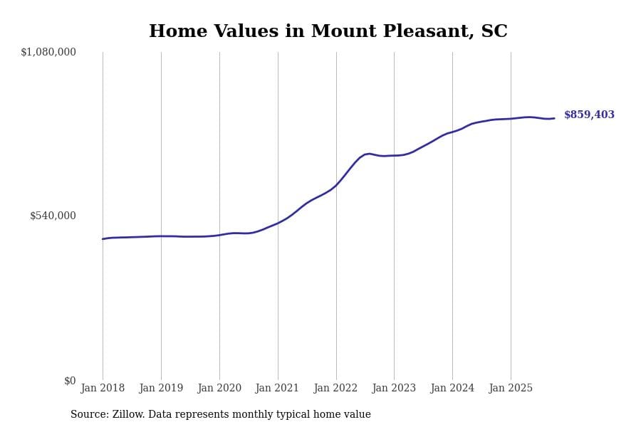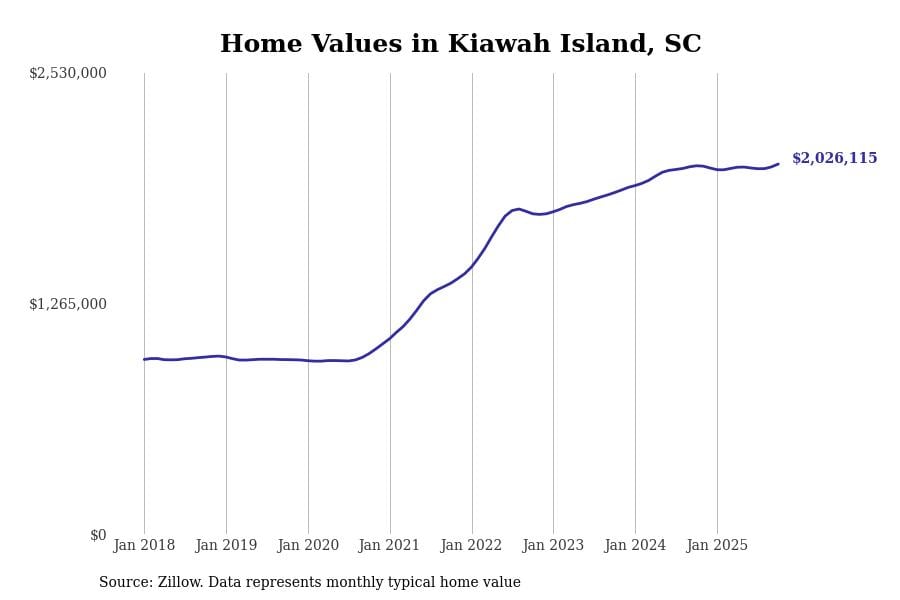 Stacker compiled a list of cities with the most expensive homes in South Carolina using data from Zillow. Cities are ranked by the Zillow Home Values Index for all homes as of October 2025. The charts in this story were created automatically using Matplotlib.