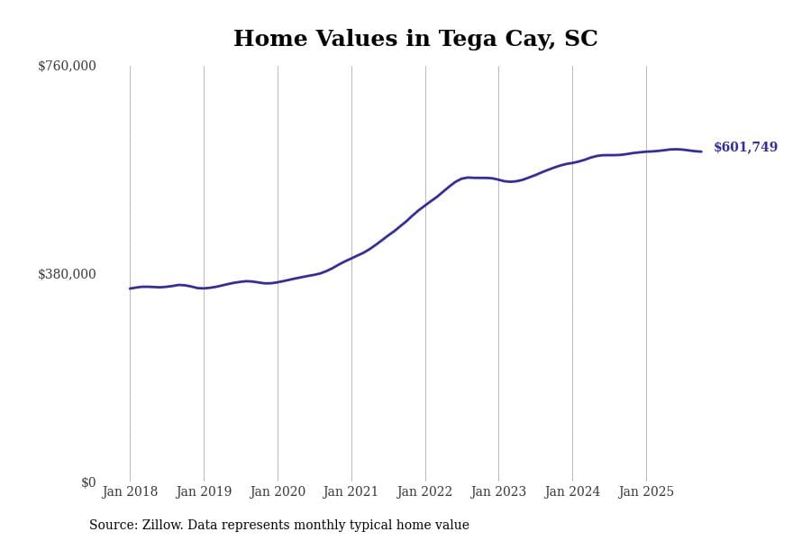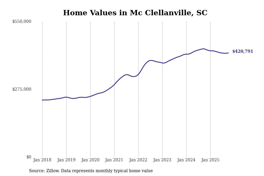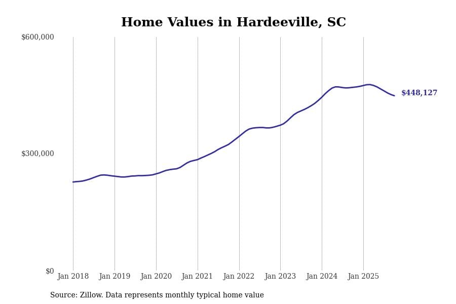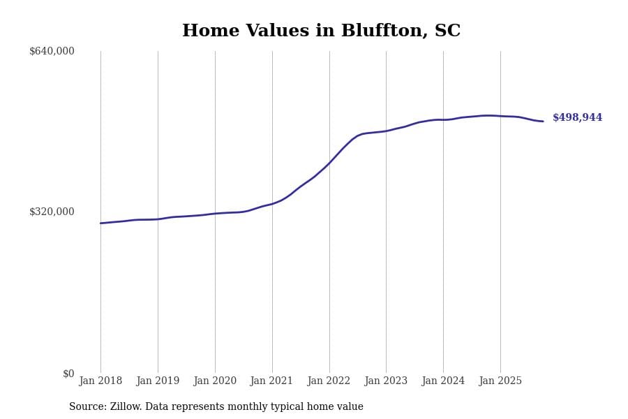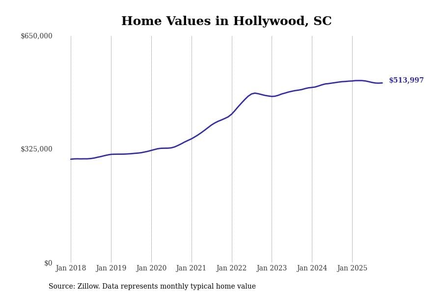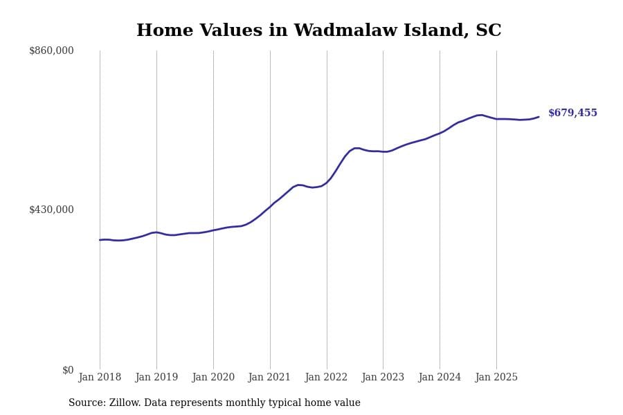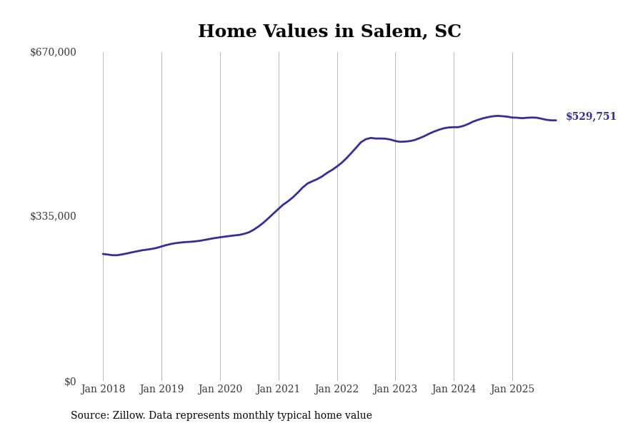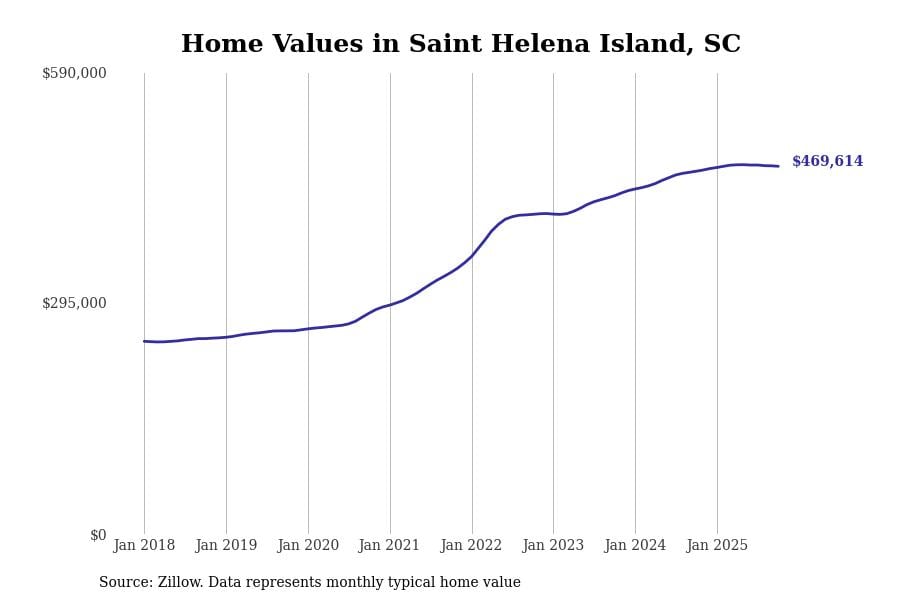 Stacker compiled a list of cities with the most expensive homes in South Carolina using data from Zillow. Cities are ranked by the Zillow Home Values Index for all homes as of October 2025. The charts in this story were created automatically using Matplotlib.